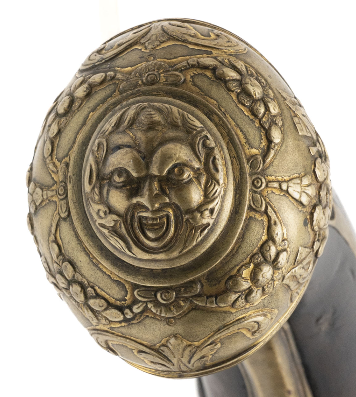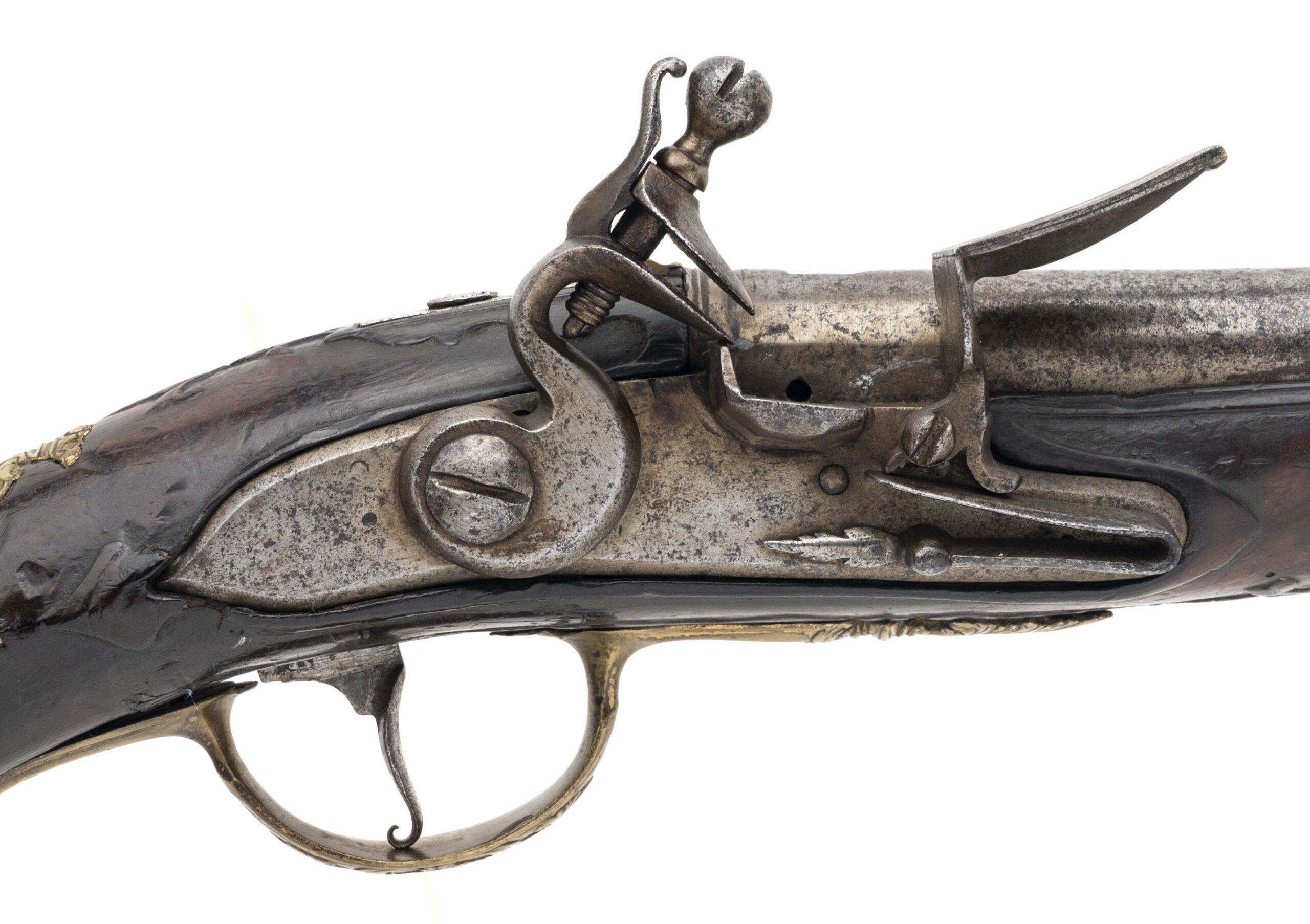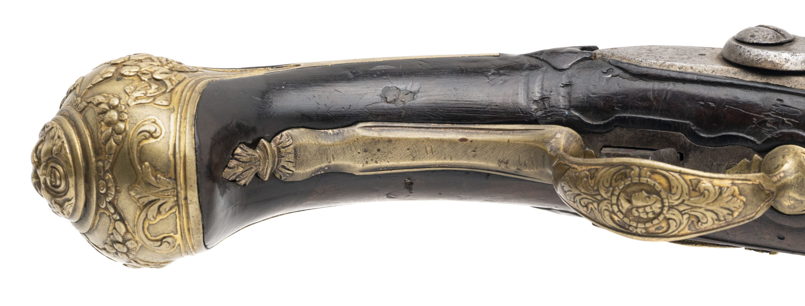 Innsbruck or South Austrian Region A highly attractive and early flintlock pistol of court quality, attributed to the Tyrolean / South Austrian region and dating to approximately circa 1695–1715. This pistol exemplifies the distinctive Central European Baroque aesthetic, combining robust mechanical construction with richly modeled gilt-brass mounts influenced by Italian decorative vocabulary. The heavy forged barrel is octagonal at the breech, transitioning to round, and exhibits a deep, even patina consistent with age. At the breech is an original arched maker’s sink, a private barrel-forger’s stamp typical of South German and Austrian workshops of the period, confirming early manufacture and original assembly. The breech walls are notably thick, with proper early flintlock touch-hole placement. The flat lock plate retains its correct early geometry, with a broad-tailed cock, thick frizzen, and robust internal architecture characteristic of late 17th-century continental flintlocks. The lock remains mechanically correct and unaltered, showing honest wear consistent with age and use. The dark fruitwood stock (likely walnut) is well shaped, with a compact butt and thick wrist typical of Tyrolean pistols and is relieved for ornate gilt-brass mounts. The mounts are finely cast and chased in high relief, featuring a bold grotesque mask pommel, flanked by scrolling foliage and cherub vignettes, all executed in a dense, sculptural Baroque style. Additional mounts include an elegant pierced sideplate, scrolling triggerguard, and a wrist escutcheon depicting a female profile bust within a crowned cartouche—motifs associated with courtly Central European arms of the period. The pistol displays excellent overall integrity, with all major components appearing original and correct to the period. The decoration remains crisp, the stock shows no evidence of later reshaping, and the overall form presents a unified, original arm rather than a composite. This pistol represents a fine example of early Tyrolean flintlock production, made in a cultural crossroads that absorbed Italian Baroque influence while retaining distinctly Germanic mass and mechanical seriousness. Such pistols are scarce, particularly in this state of preservation, and are highly desirable to advanced collectors of early European firearms. A rare and evocative Central European flintlock pistol from the dawn of the 18th century.