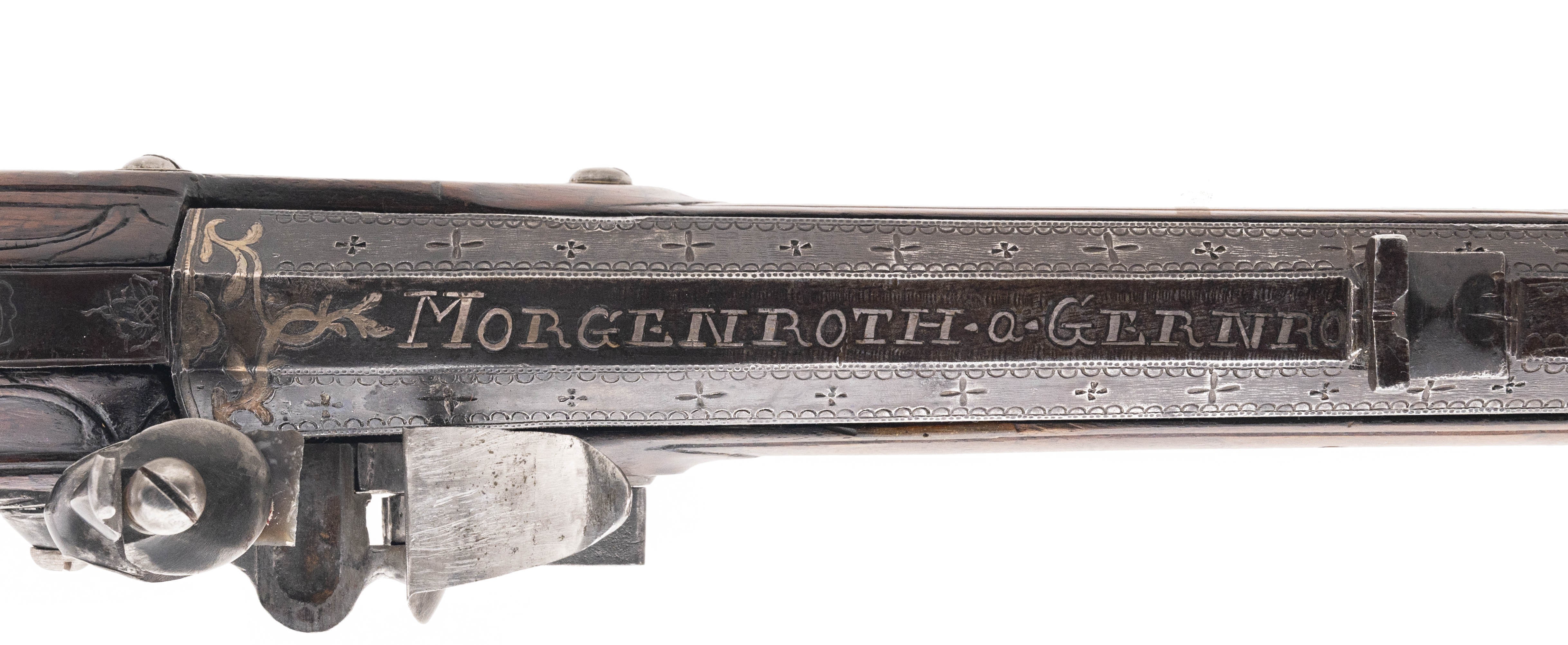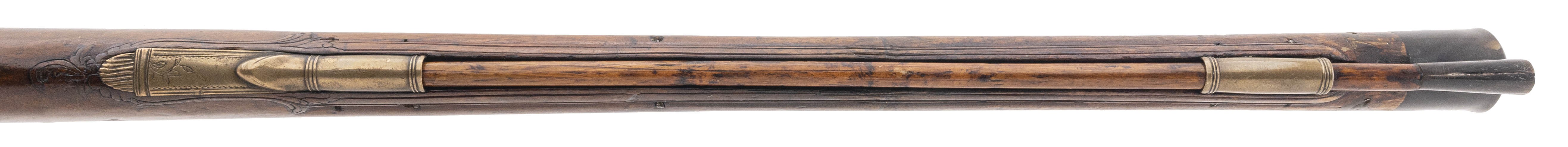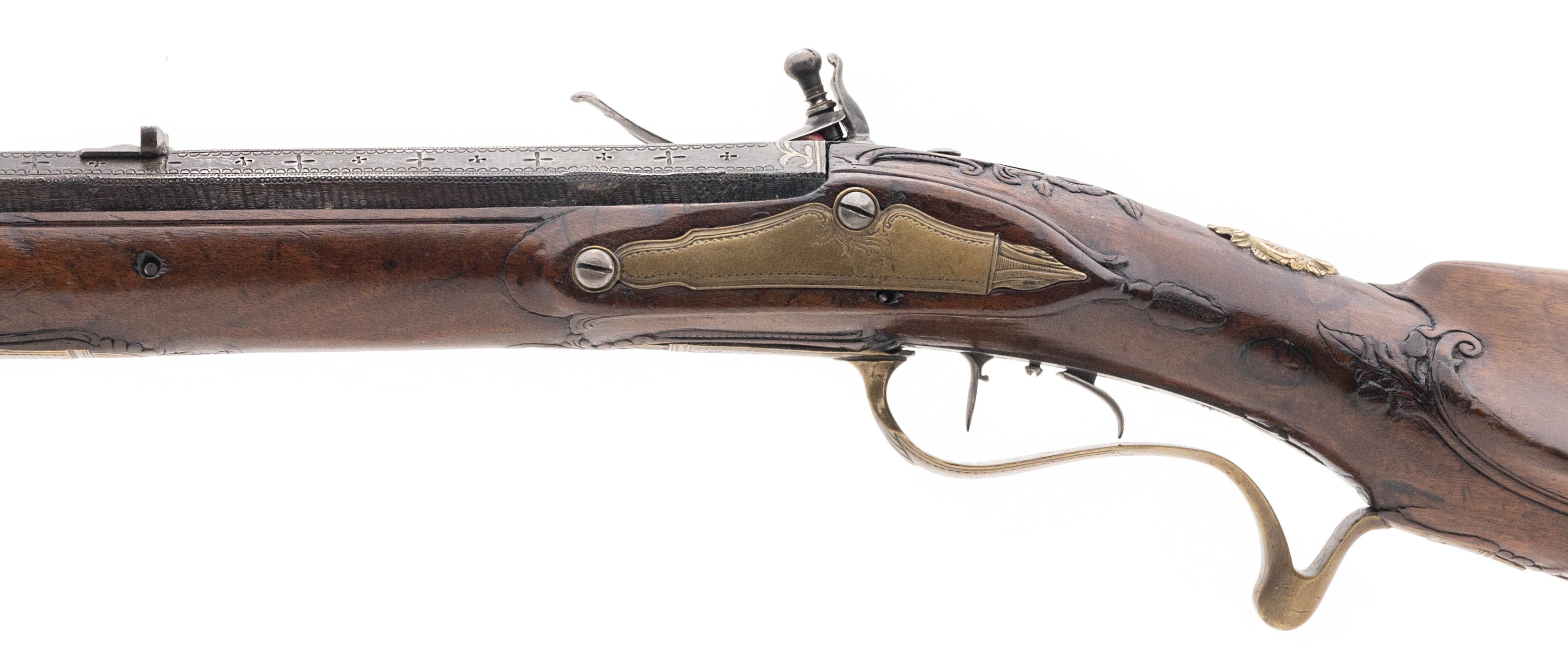 .78 caliber 27.75" swamped octagonal smoothbore barrel circa 1750 by Morgenroth of Gernrode. Very attractive Bone inlay and carvings are noted in the stock. Barrel is a "gunmetal" patina with some thinning noted along the edges. Action is nice and tight with adjustable set trigger.
