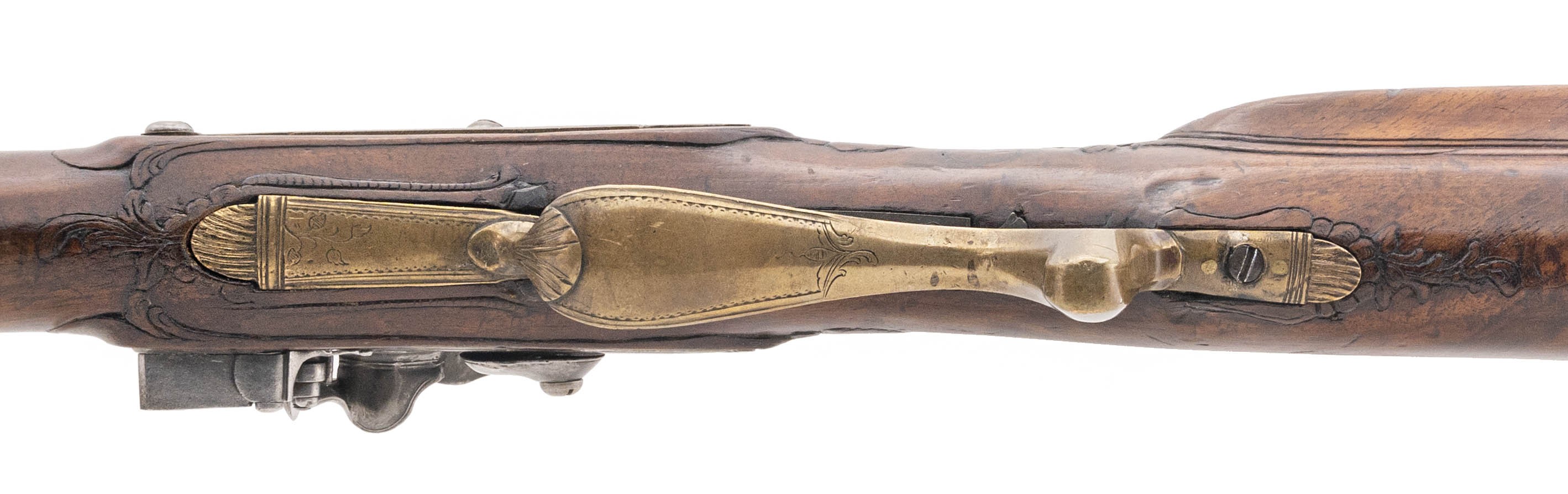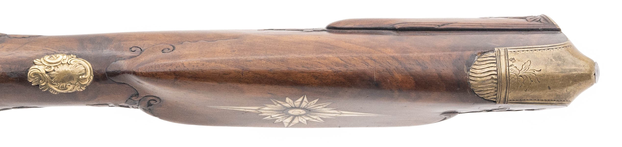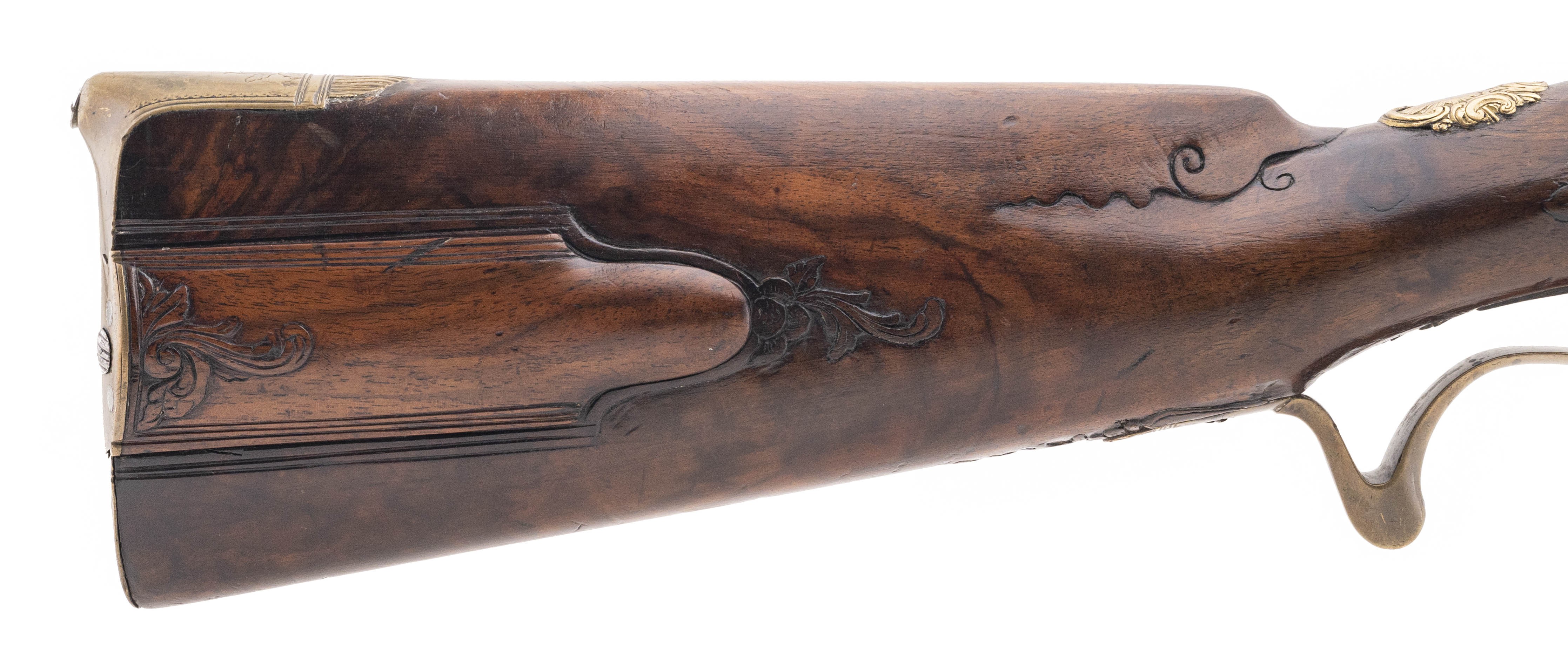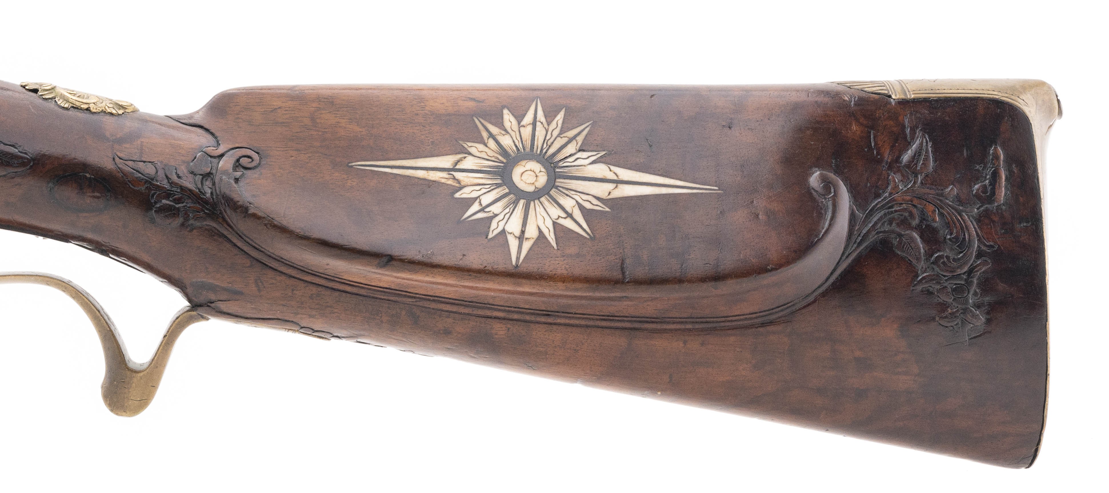 .78 caliber 27.75" swamped octagonal smoothbore barrel circa 1750 by Morgenroth of Gernrode. Very attractive Bone inlay and carvings are noted in the stock. Barrel is a "gunmetal" patina with some thinning noted along the edges. Action is nice and tight with adjustable set trigger.
