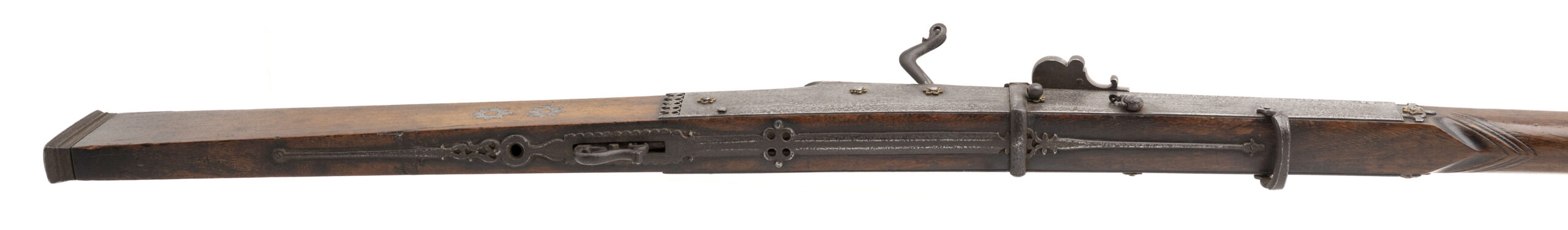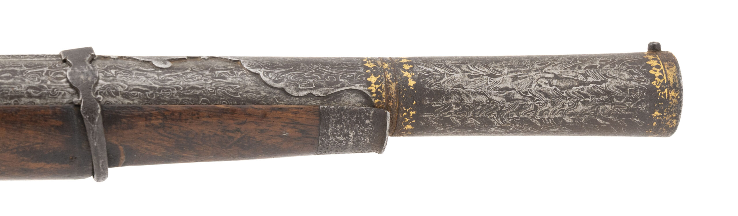 No Serial Number, circa 19th century. Chambered in .65 caliber with a 52” round ladder-pattern Damascus (Kirk Narduban) barrel. Both muzzle and breech are chiseled and decorated with gold damascening (Koftgari). Barrel is secured with four decorative barrel bands. Side plates feature a Damascus pattern, while the wood above them displays a floral inlay design. The remainder of the stock is in very good condition, showing only light handling impressions. Action functions mechanically as intended. A striking and ornate example of a Toradar musket—a piece that would have belonged to someone of high status.