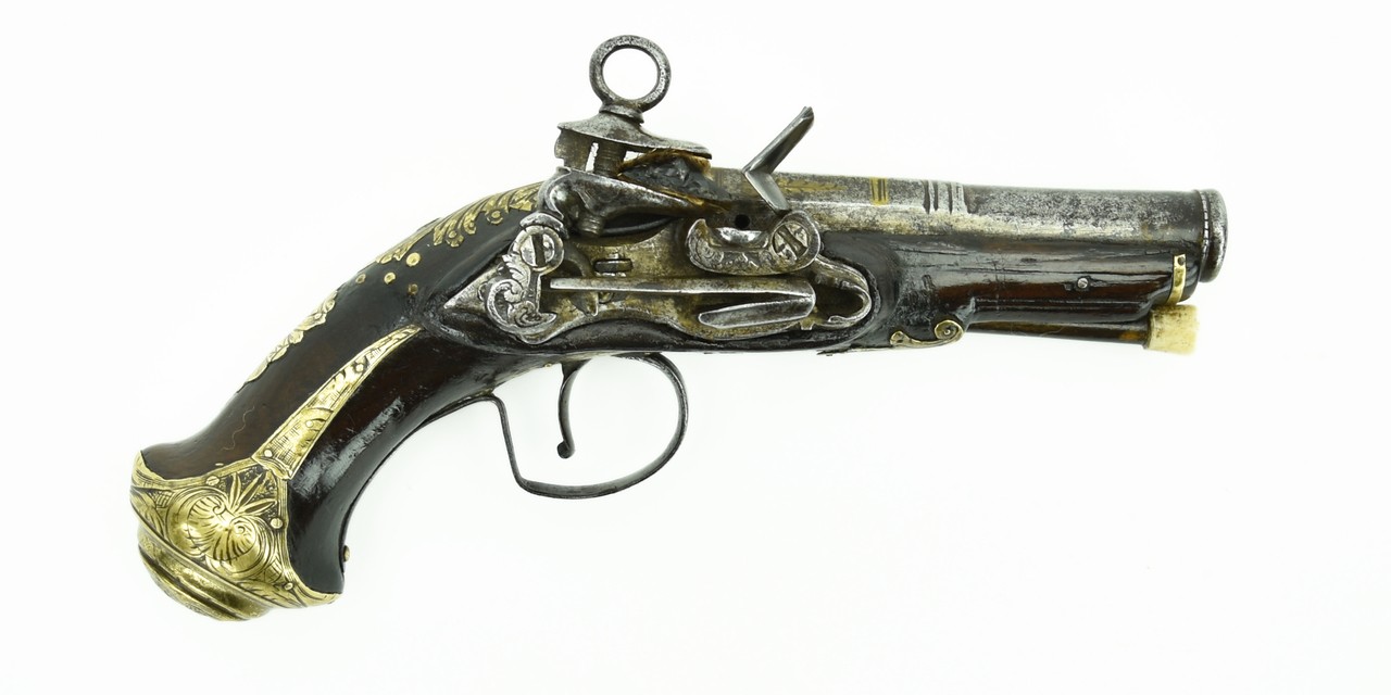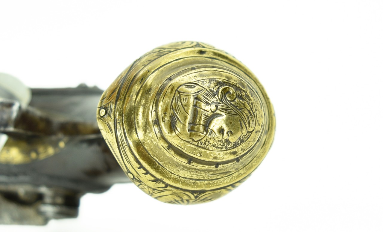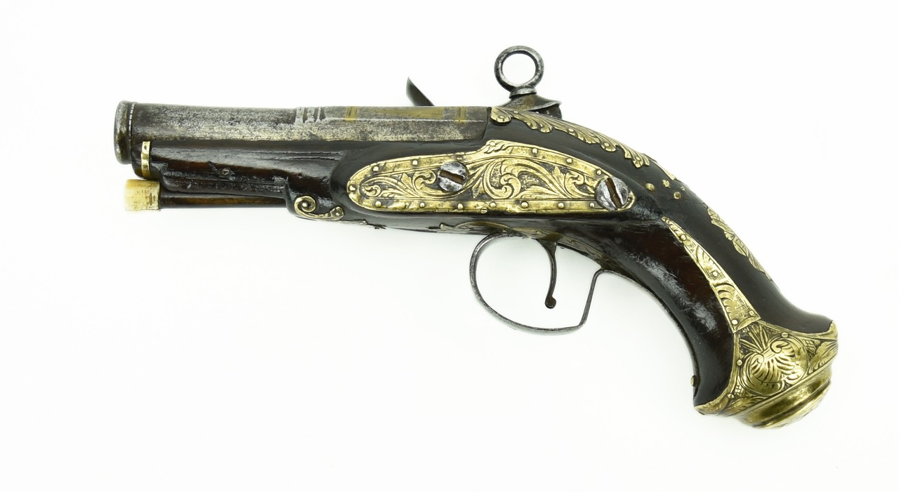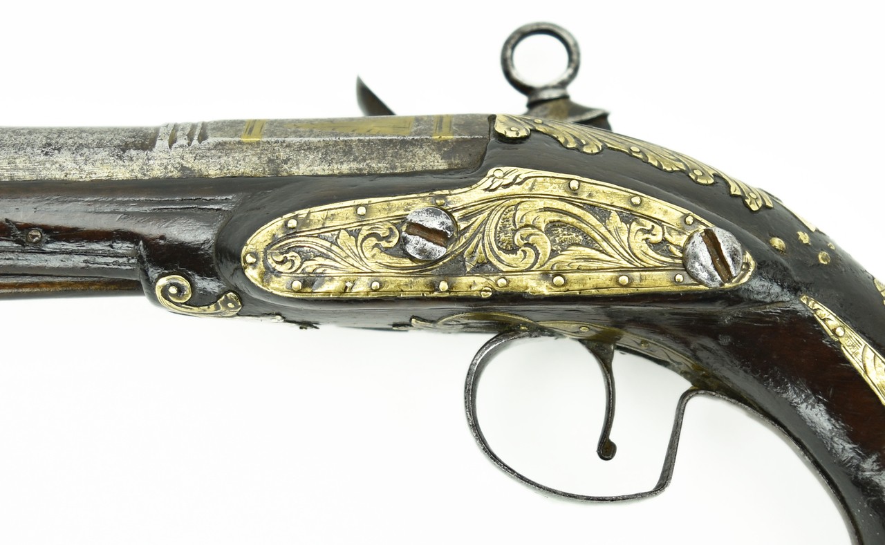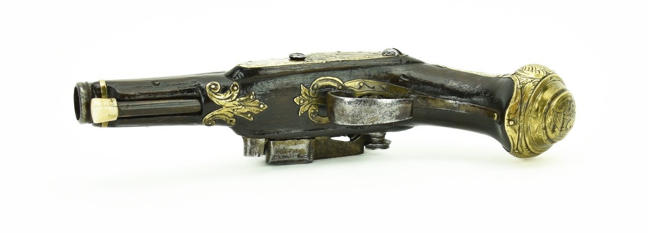 Beautiful Spanish Miguelet lock pistol. Barrel length 3 ½” and overall length 7”. In our opinion, this is a pistol made in Catalonia region of Spain. The pistol has a two stage barrel with canon muzzle. The brass furniture is engraved and the barrel is also inlaid with brass. The action works perfectly. The lock is engraved. The stock is very good plus with no chips or cracks. This is a well-made pistol of the early to mid-1700’s period. Would be a pleasure to own.