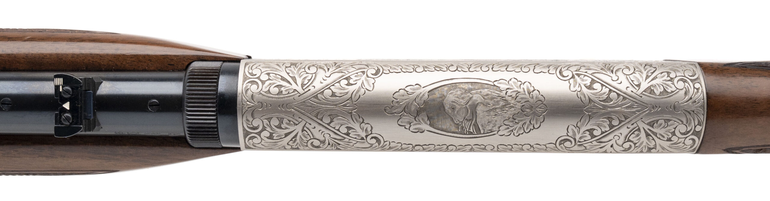 SN: 2151992ALI made in Belgium, semi-automatic takedown rifle with a 19” high polish blued barrel, highly figured checkered Turkish walnut stock with a gloss finish and hand engraved coin finish receiver done by engraver S Macarenko. Overall condition is very good with some light handling marks. Bore is excellent.