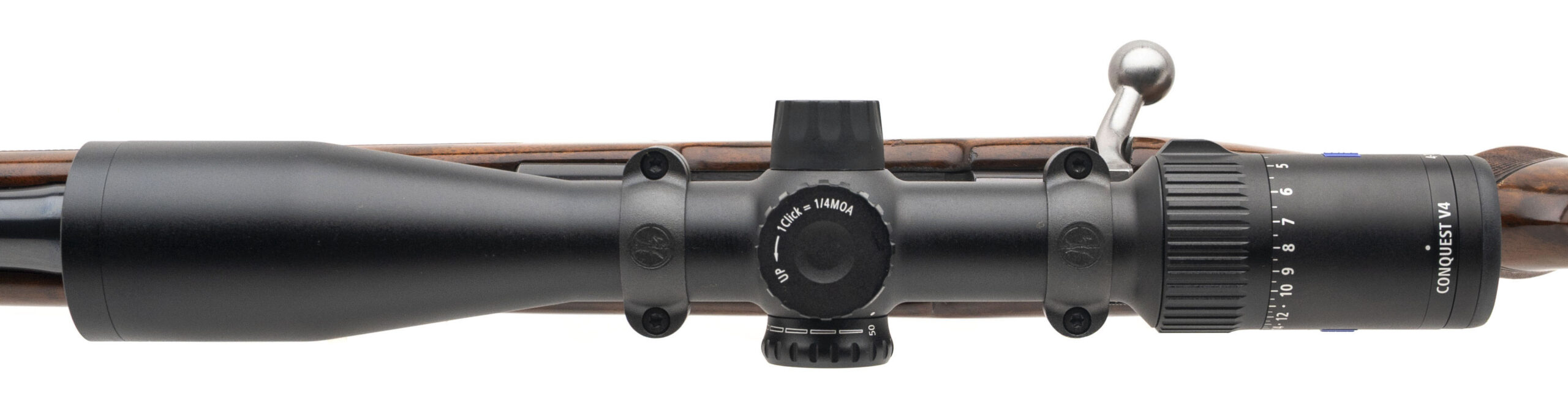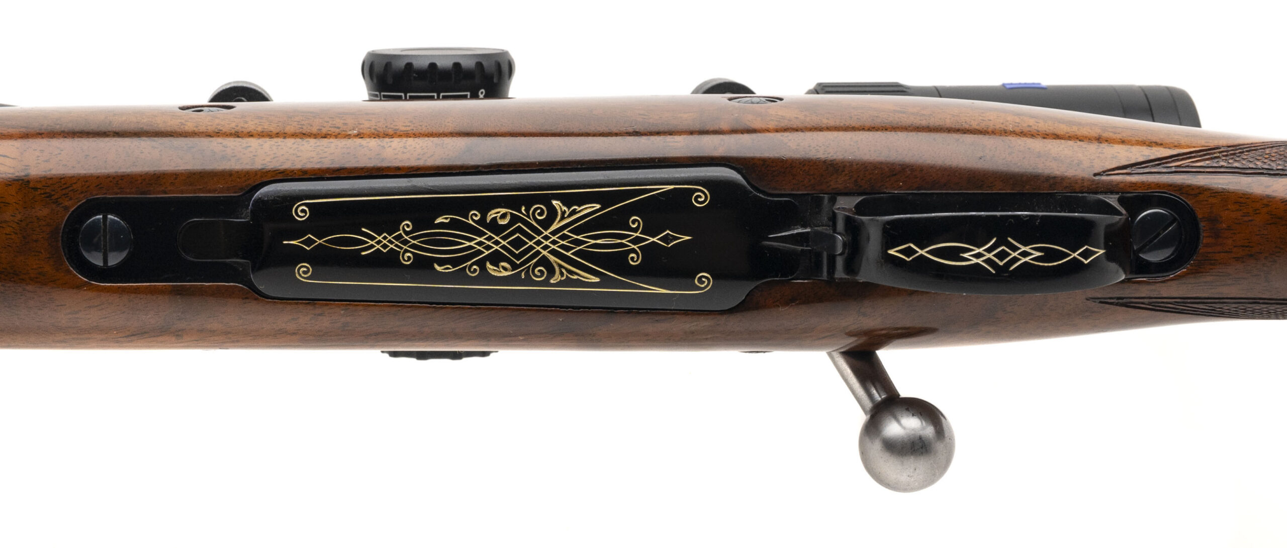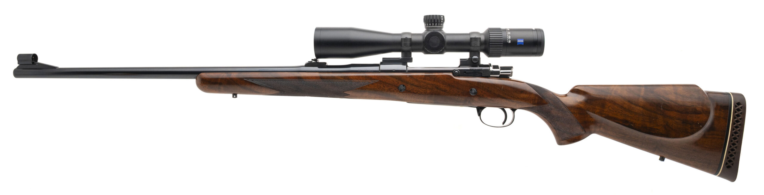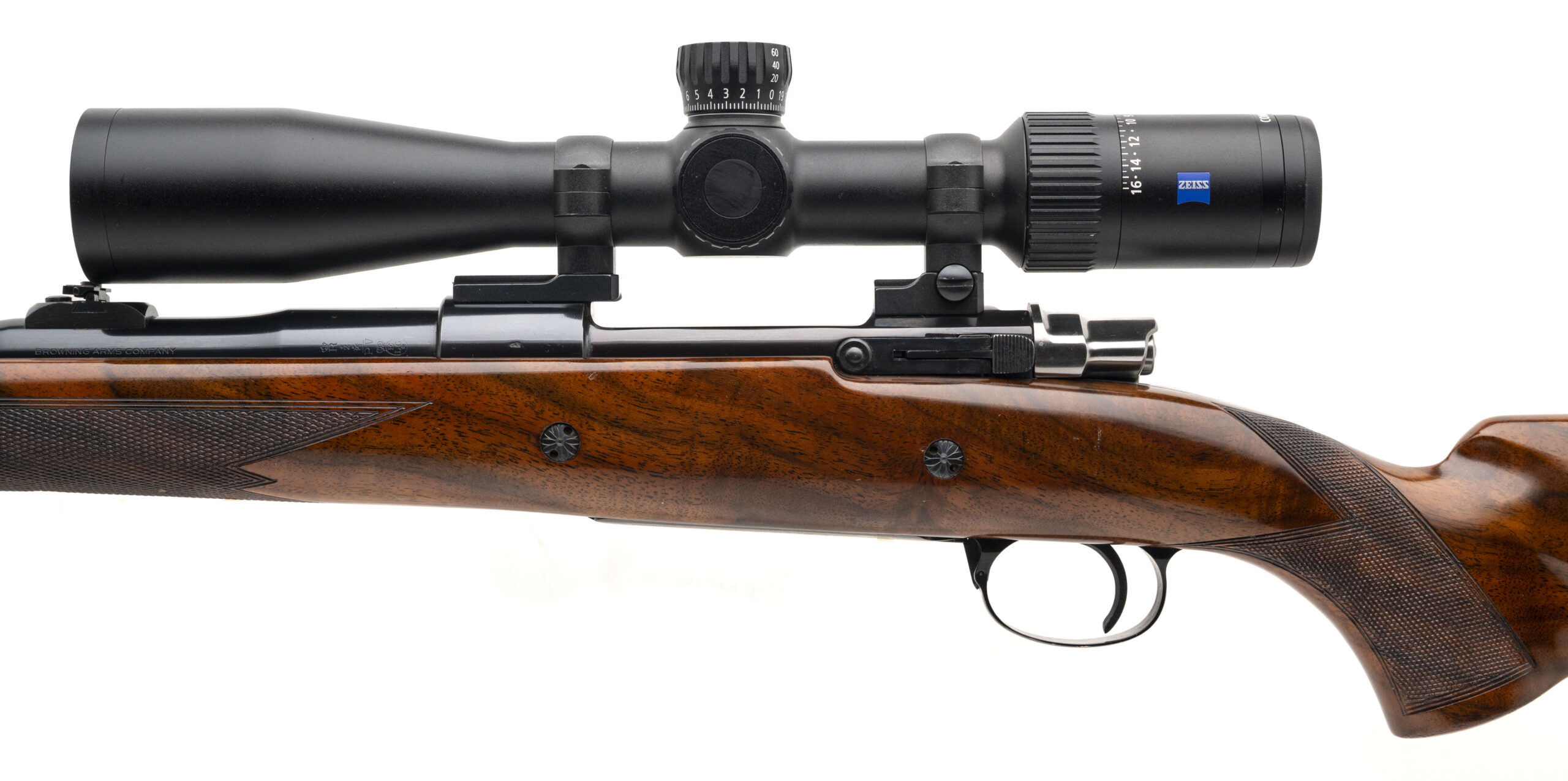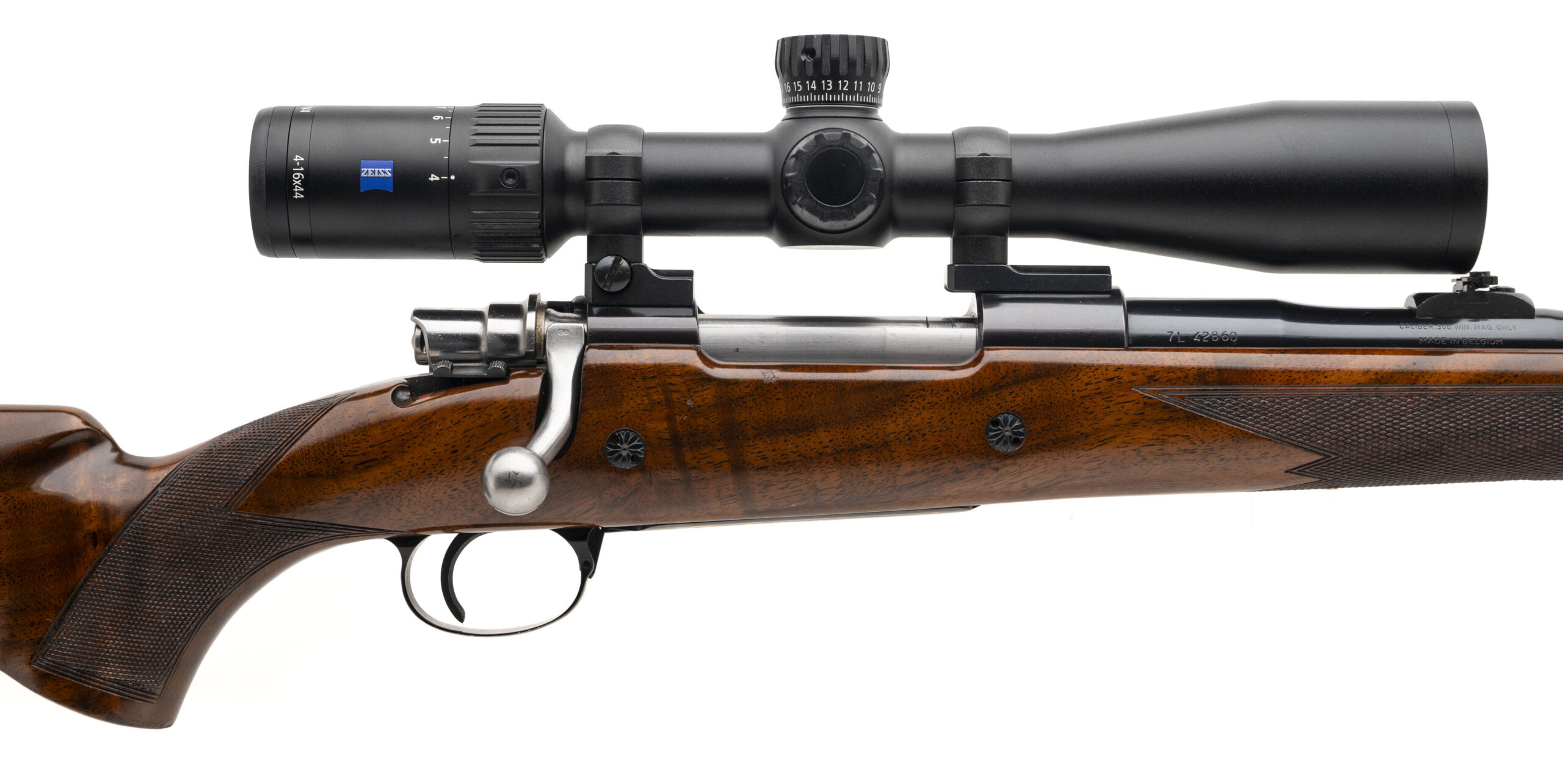 SN: 7L42860 made in Belgium in 1967. Bolt action hunting rifle chambered in 300 Win Mag with a 24" round barrel, hooded front ramp sight, island rear slip up sight with a Zeiss Conquest V4 4-16x44 scope. Control round feed action with full length claw extractor, side safety, 2 engraved recoil cross bolts and bottom metal with hinged floor plate engraved in gold. Deluxe high gloss checkered walnut stock with original Browning recoil pad. Some light handling marks on the stock, metal finish is near excellent and bore is excellent.