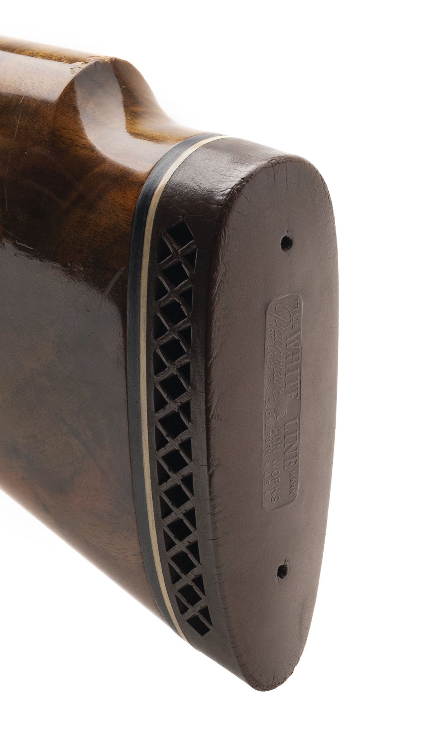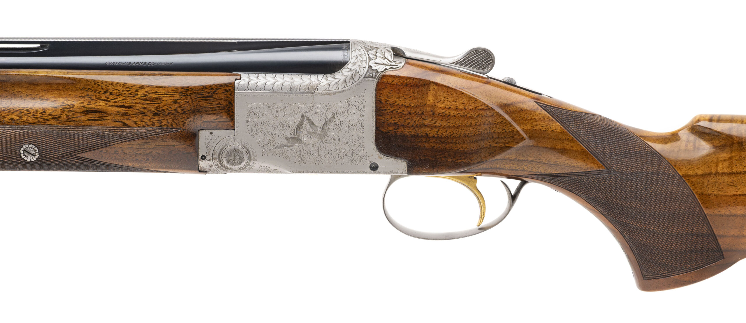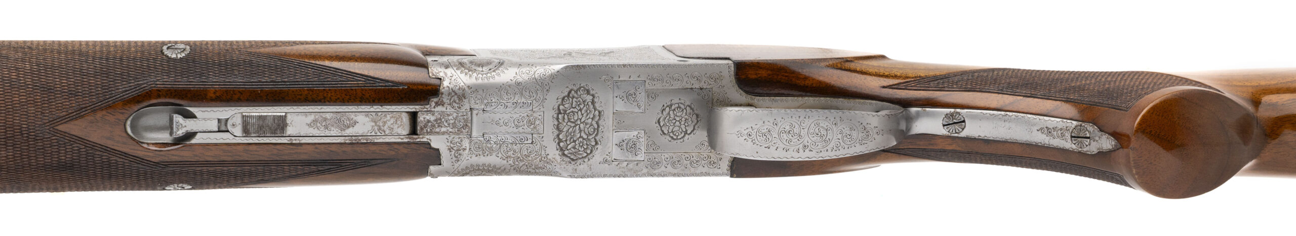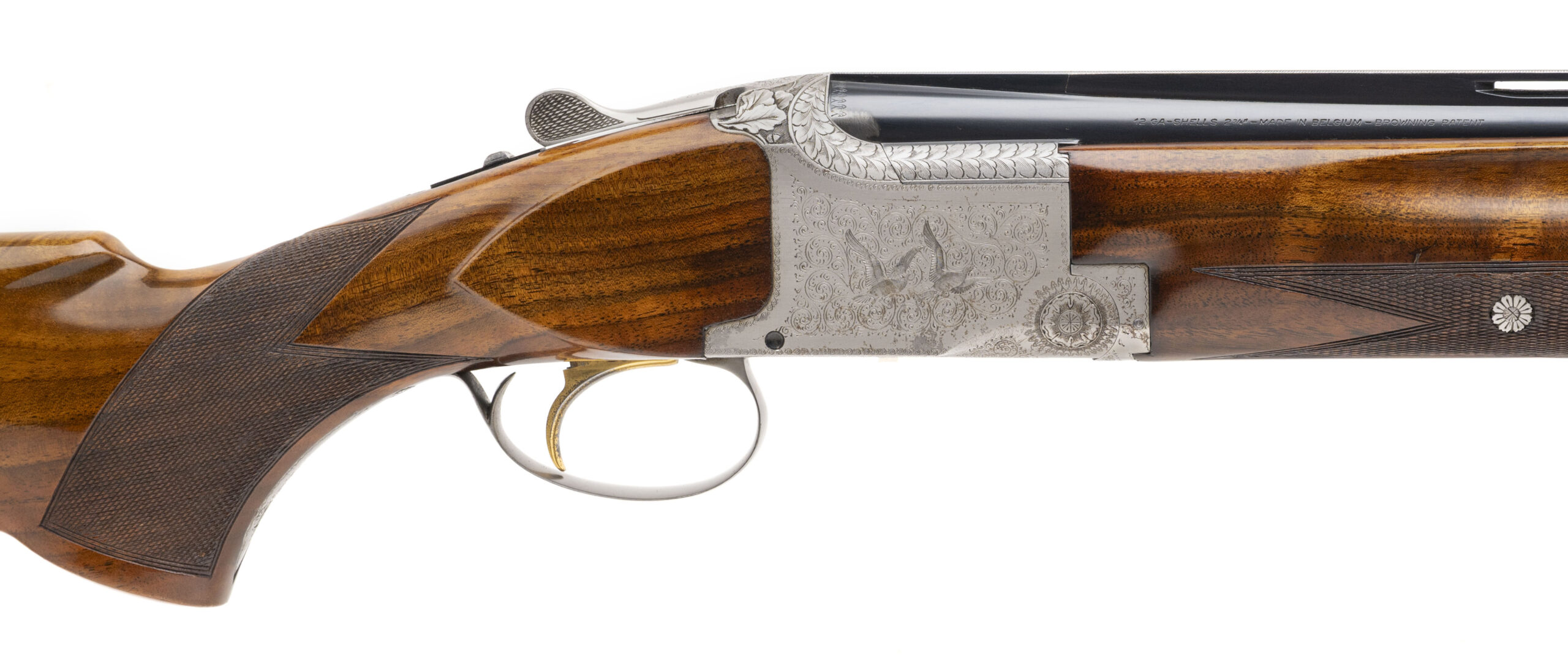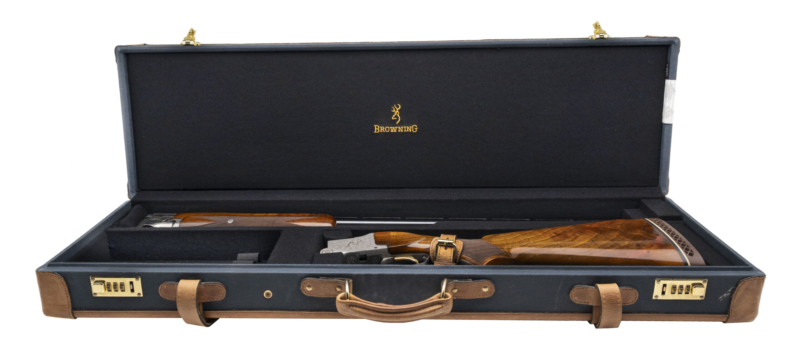 SN: 55386S6 made in 1966 in Belgium. 12 gauge over under with 32” vent rib barrels with wide broadway rib, white front and middle beads, 2 ¾” chambers and fixed chokes measuring .020/.039. Engraved coin finish box lock with a gold plated selective single trigger, auto ejectors and a manual safety. Nicely figured checkered walnut furniture with a monte-carlo stock and a 14 5/8” LOP to the Pachmayr white line recoil pad. Some light handling marks but overall in very good condition with excellent bores. Comes with modern Browning canvas luggage case.
