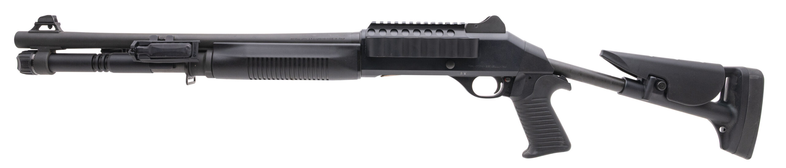 SN: Y199451W. Modern production, 12 Gauge with an 18.5" barrel. Bore is very good. Military grade tactical shotgun with 3" chamber, 7rd mag tube, and skeleton stock. Very good condition overall. Comes equipped with an Olight Odin flashlight w/pressure switch and a side saddle shell carrier.
