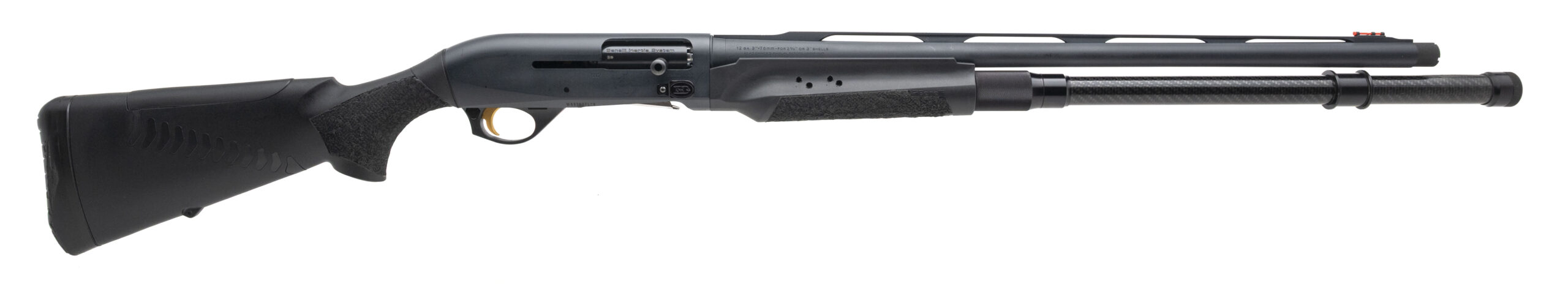SN: M893607L16 made in Italy, modern production 12 gauge semi-auto competition shotgun with a 24" vent rib barrel, fiber optic front sight, 3" chamber and extended screw in choke. Synthetic stock and forearm have had the grip panels textured for additional grip, extended charging handle and Briley bolt release button and an extended carbon fiber magazine tube bringing the total capacity to 10+1 of 2 3/4". Some light handling marks and 4 holes on the right side of the forearm where a spare shell holder was mounted but other than that in very good overall condition with an excellent bore.