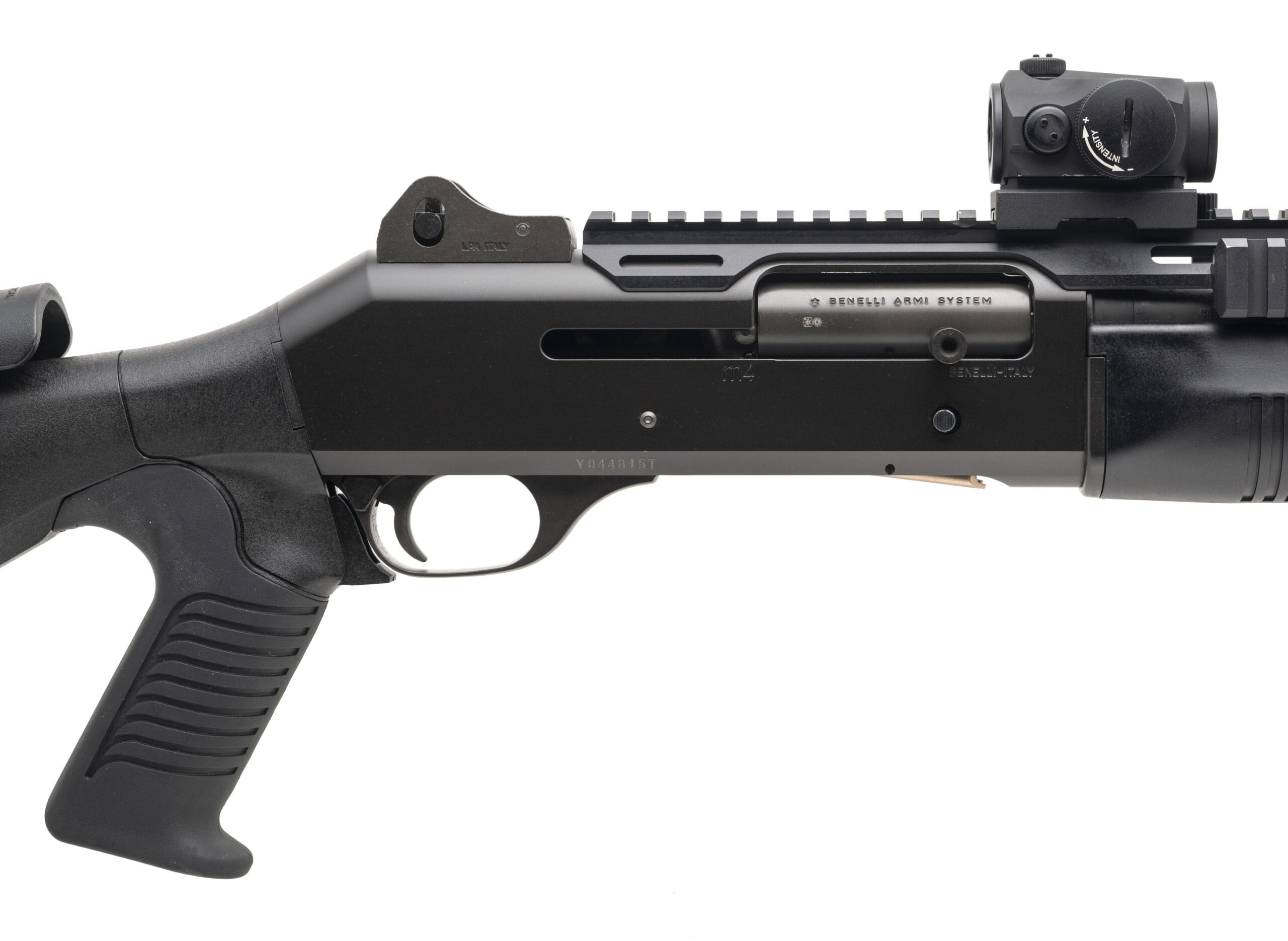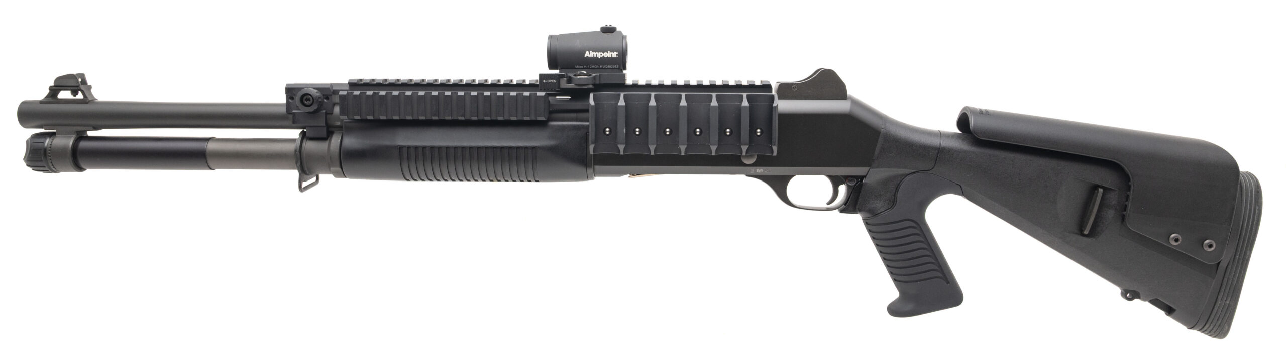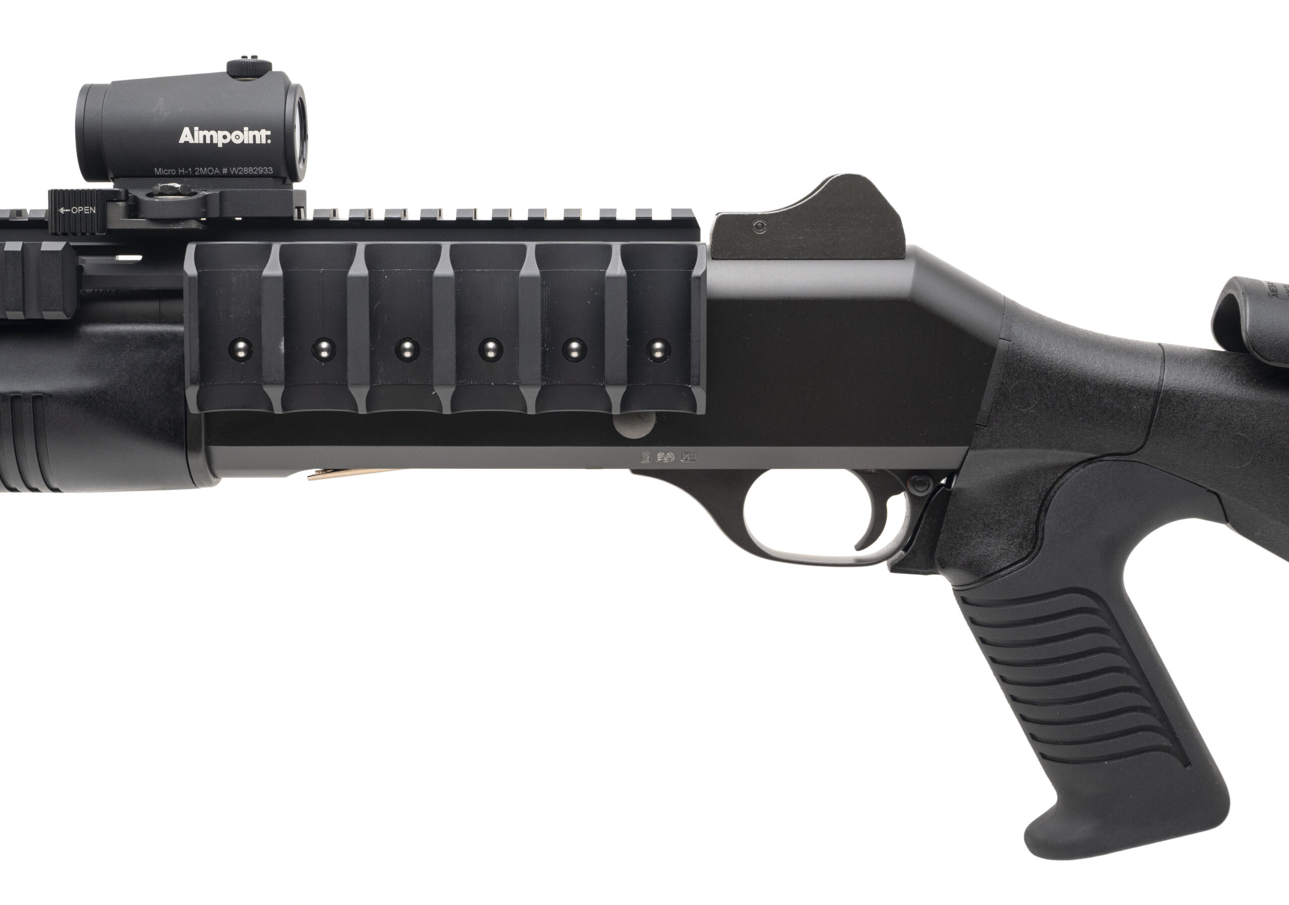 SN: Y044815T. Modern production, 12 Gauge with an 18.5" barrel. Bore is very good. Military grade semi-auto tactical shotgun with an Aimpoint Micro H-1 red dot optic and Side Armor full length Benelli M4 rail with QD side saddle. Has a 3" chamber and 7+1 mag tube. Very good condition overall.