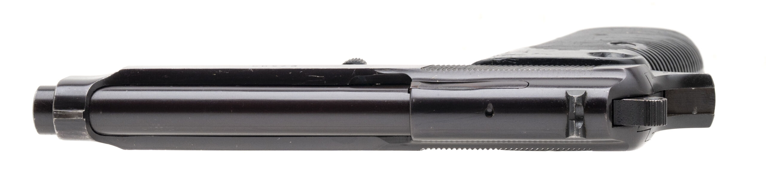 SN: 27485. 1950s Vintage, 9mm with a 4.5" barrel. Bore is bright with strong rifling. Italian Service Pistol. Early example of the milled-out slide profile, later made iconic by the Beretta 92. Has grip tape on the front of the grip. Metal and plastic grips shows wear but the overall condition is very good.