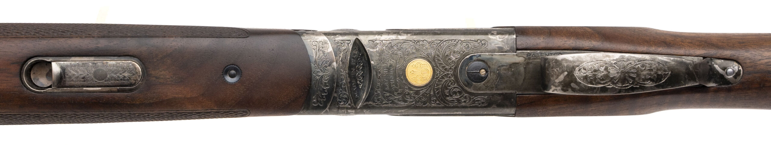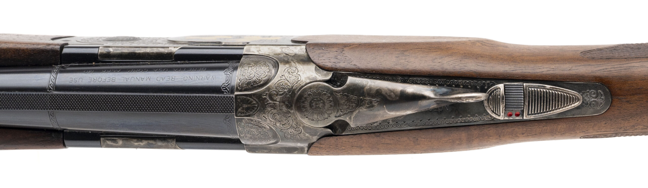 SN: U39835S. Modern production, 20 gauge with 28" vent rib barrels w/removable chokes chambered for 3" shells. Bores are excellent. Over/under field shotgun with engraved color case hardened receiver w/gold accents, blue finished barrels, and checkered deluxe wood stock & forend with a 14.75" LOP. Stock shows light handling marks. Includes additional chokes, original case, and original box. Overall condition is near excellent.