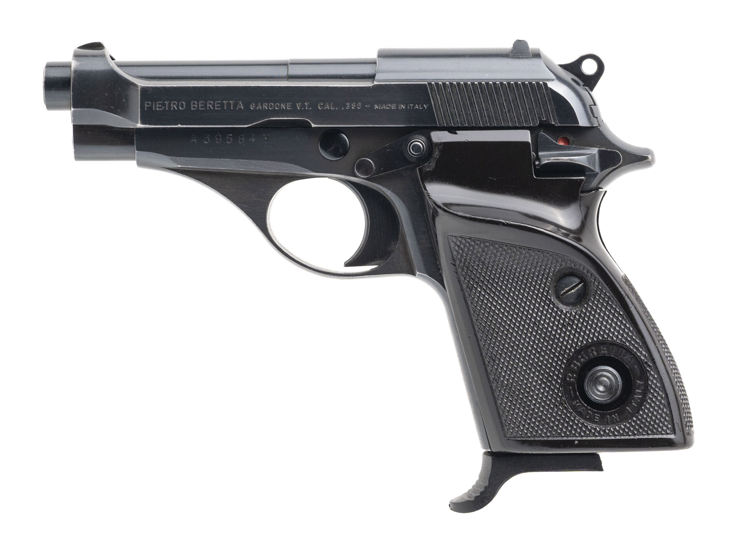 SN: A39584Y. 1981 production, .380 Auto with a 2.75" barrel. Bore is very good. Italian made hammer fired pistol with plastic grips and a manual safety. Finish shows wear with most of the bluing present, the overall condition is very good.