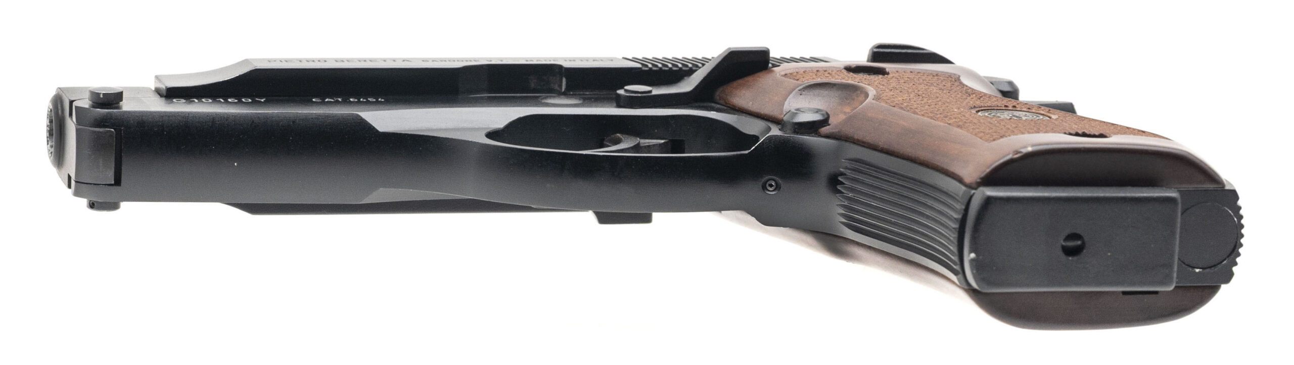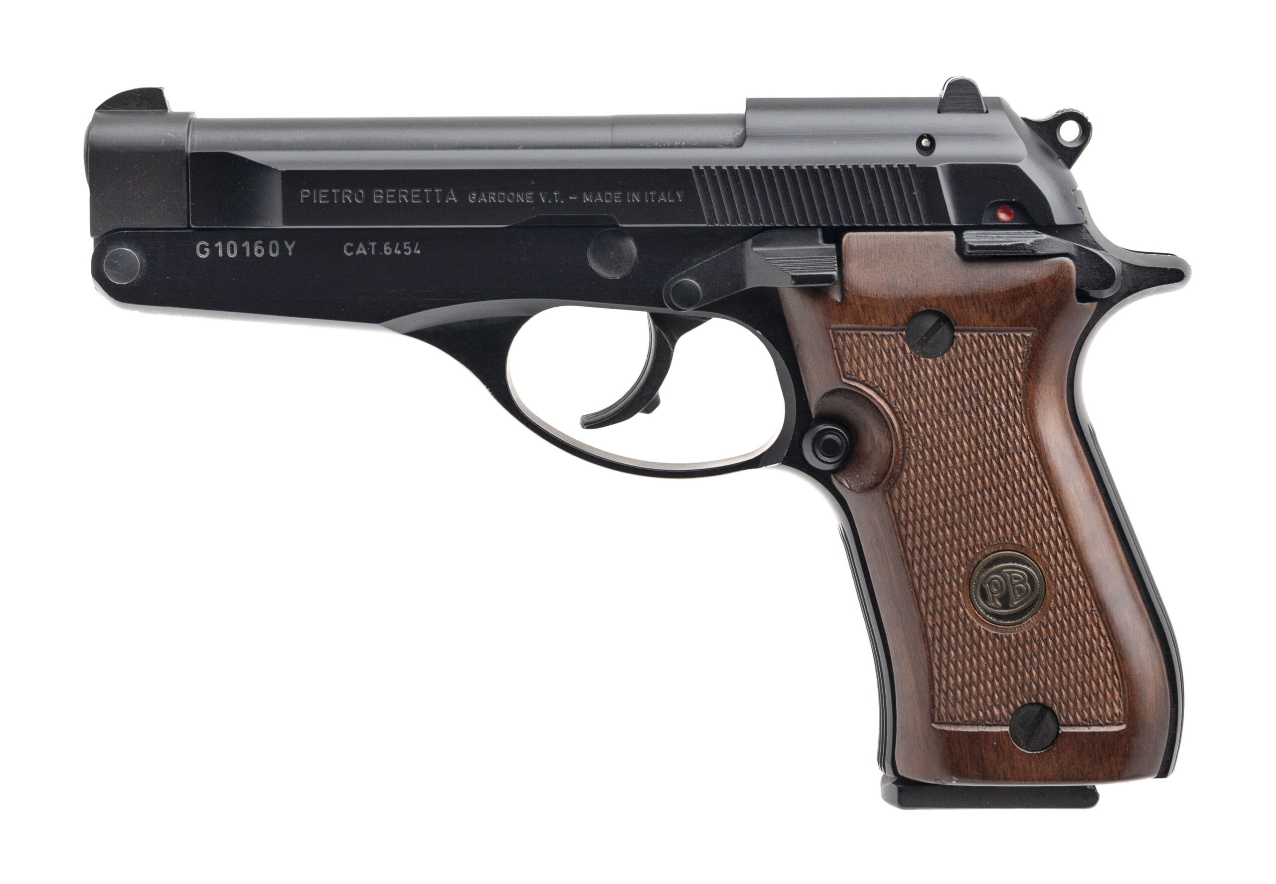 SN: G10160Y. Metal-frame hammer-fired pistol made by Beretta c. 1998. 4¼" barrel chambered for .380 Auto. Great overall condition with some handling marks in the black nitride finish. Wood grips are excellent. Features Double-action/single-action trigger with manual safety, and tilting-barrel which allows the pistol to be loaded safely without cocking the hammer. Rare model which was discontinued in 2004. Comes with one 8-round magazine.