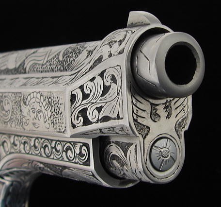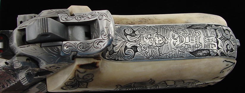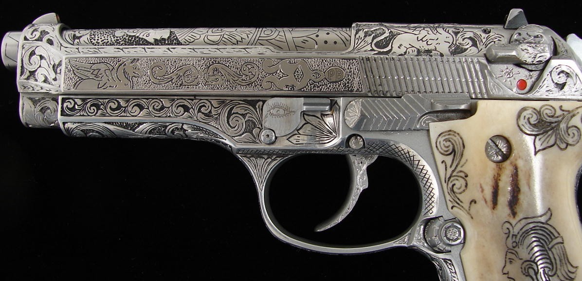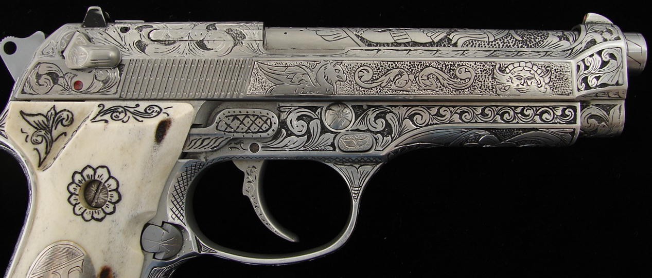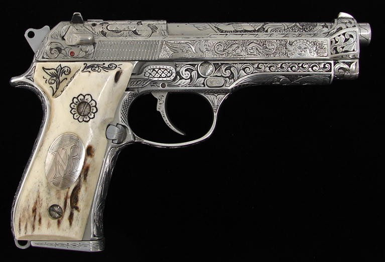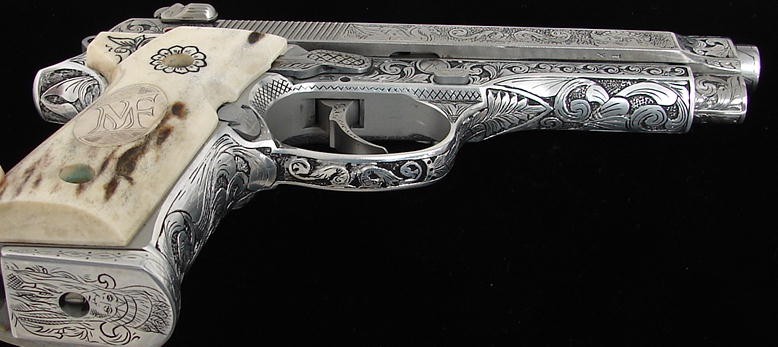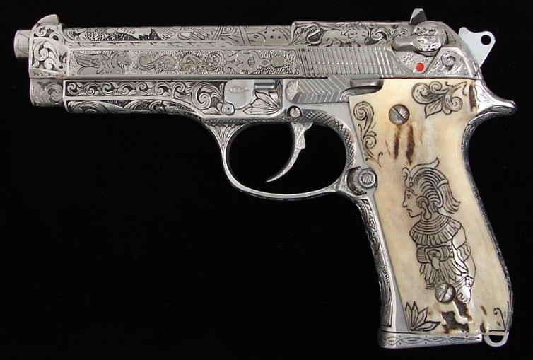 Beretta 92FS 9mm Para caliber pistol. Unusual custom engraved and nickel plated Italian model, fully engraved in a Mayan Indian motif. Has custom carved genuine stag grips with a Mayan figure on one side and a silver rondel with initials on the other. The initials could be easily changed to yours.