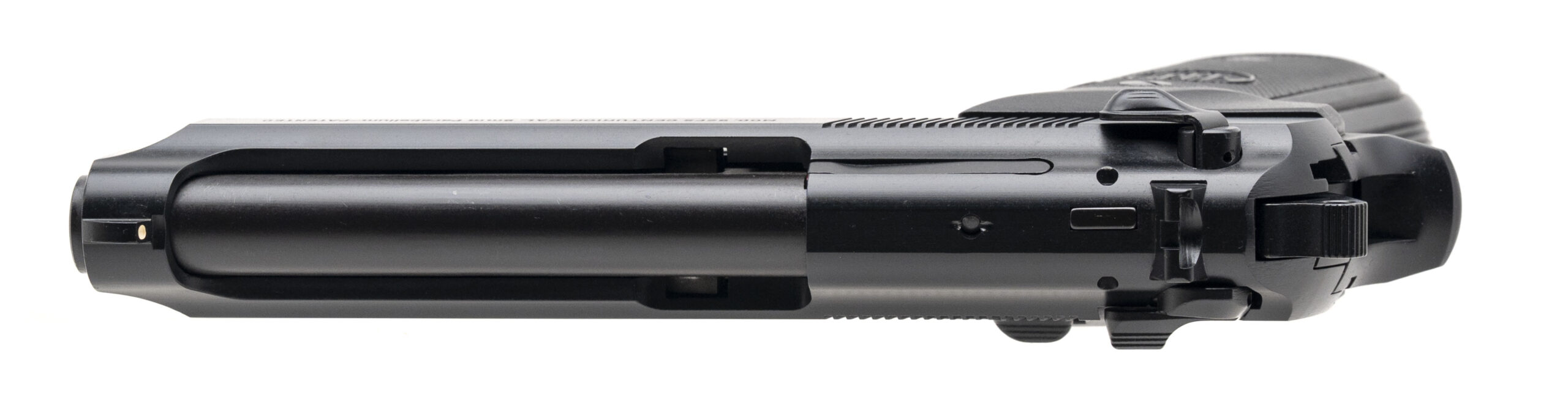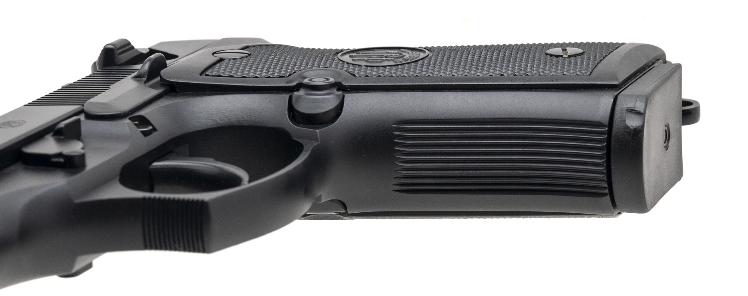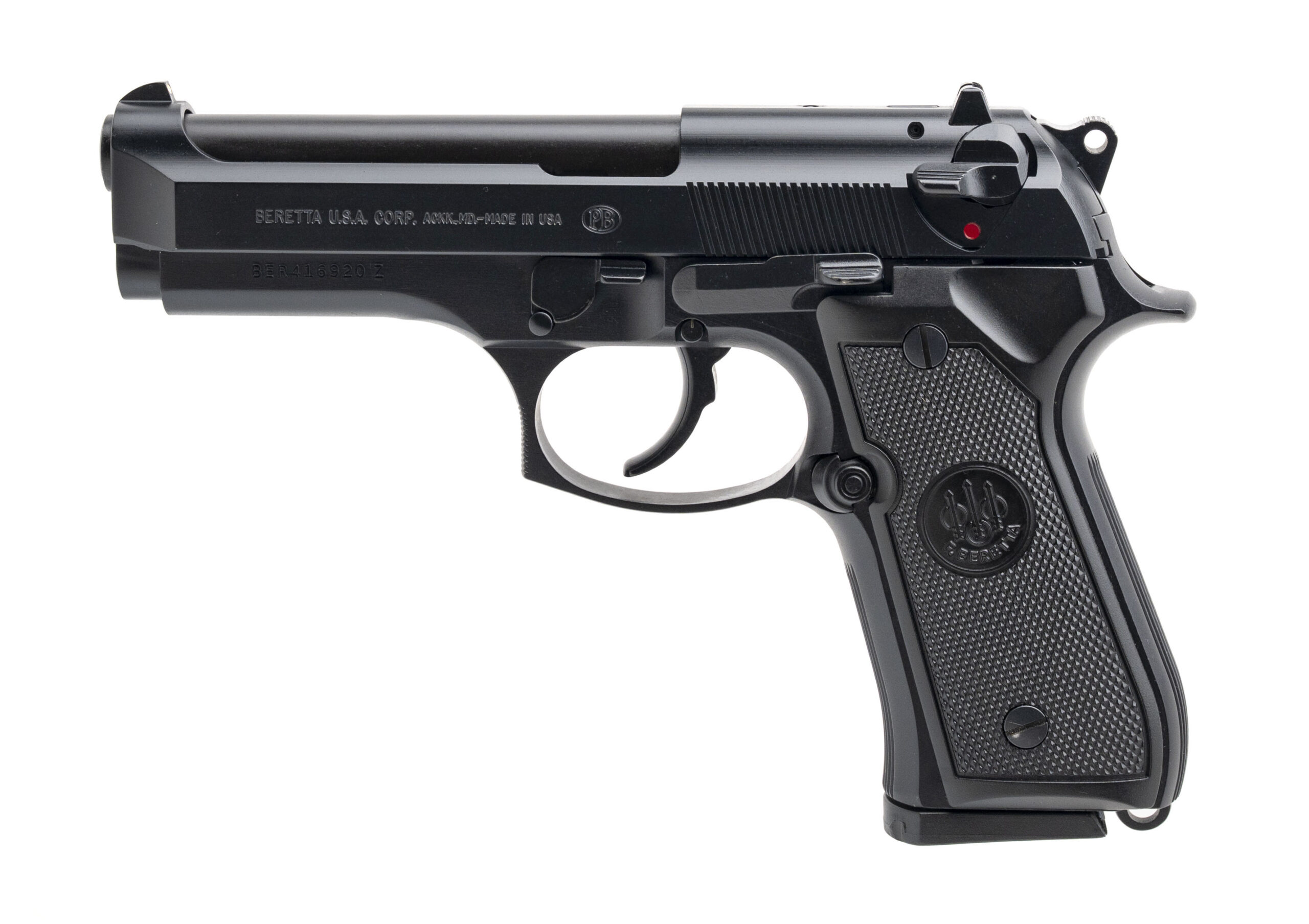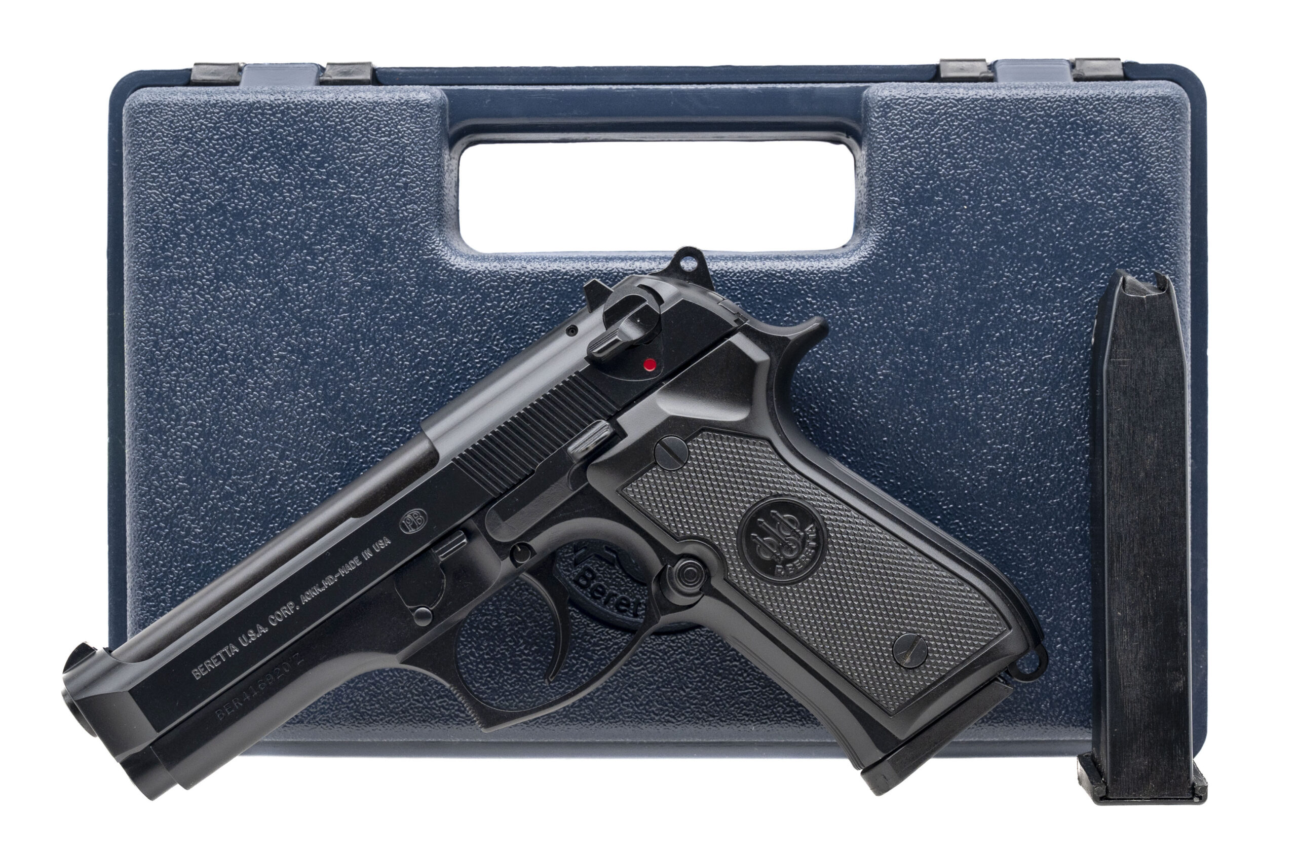 SN: BER416920Z. 1990s vintage, 9mm with a 4.3" barrel. Bore is excellent. Full size aluminum frame semi-auto pistol with a manual thumb safety/decocker, matte black finish, and checkered black plastic medallion grips. Includes additional magazine, and original case. Overall condition is excellent.