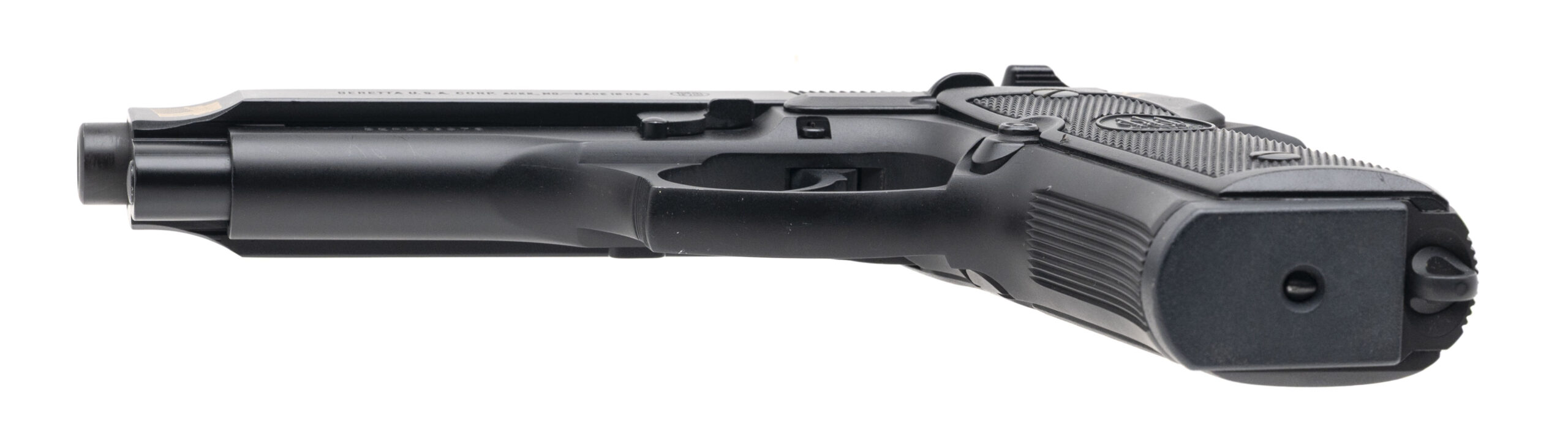 SN: BER233978. Modern production, 9mm with a 5" barrel. Bore is very good. Limited edition full size double-action pistol with ambidextrous manual thumb-safety/decocker, 3-dot sights, alloy frame matte black finish w/gold accents, and checkered plastic grips. Finish shows moderate marks throughout. Overall condition is very good.