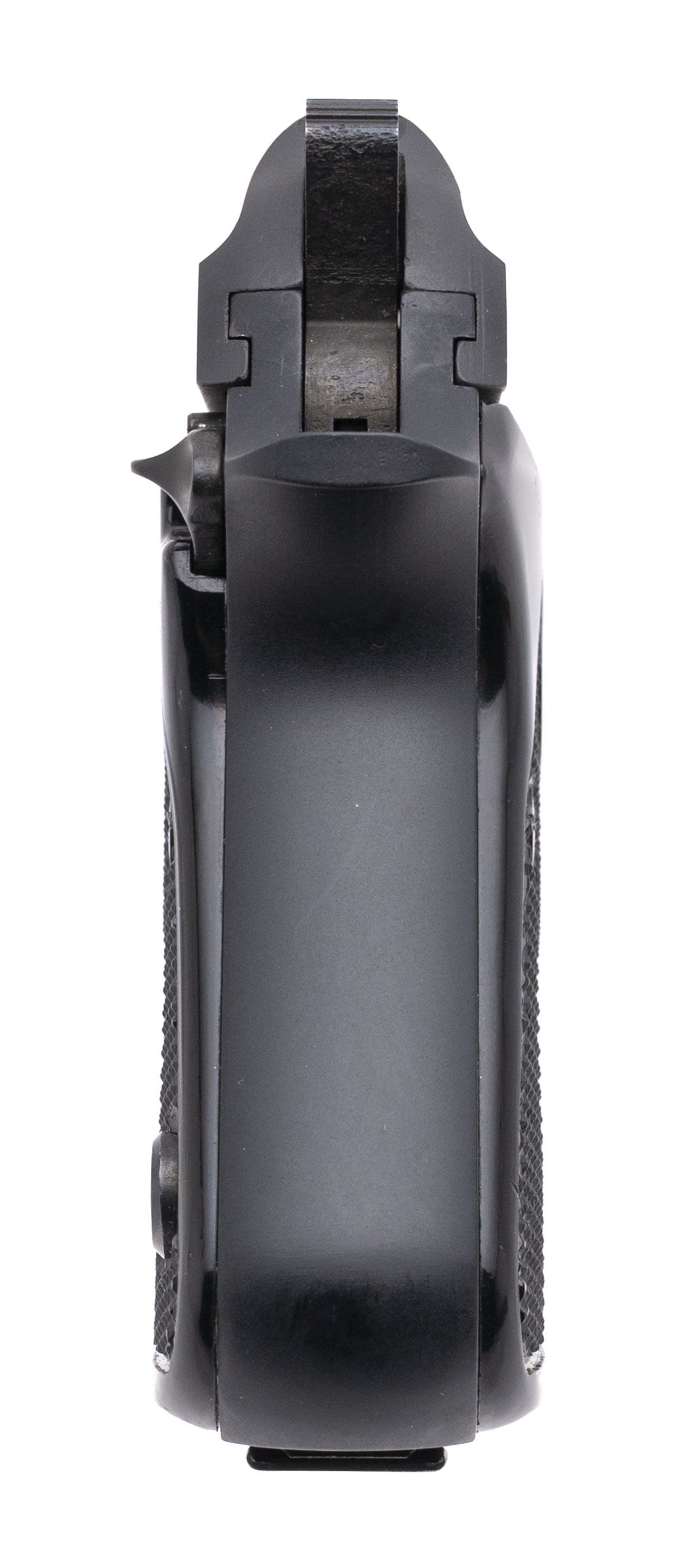 SN: BU24094V. Modern production, .25 ACP with a 2.4" tip-up barrel. Bore is excellent. Single-action only steel frame pocket pistol with a manual thumb-safety, matte black finish, and black checkered plastic grips. Finish shows light handling marks throughout. Overall condition is very good. Includes original box.