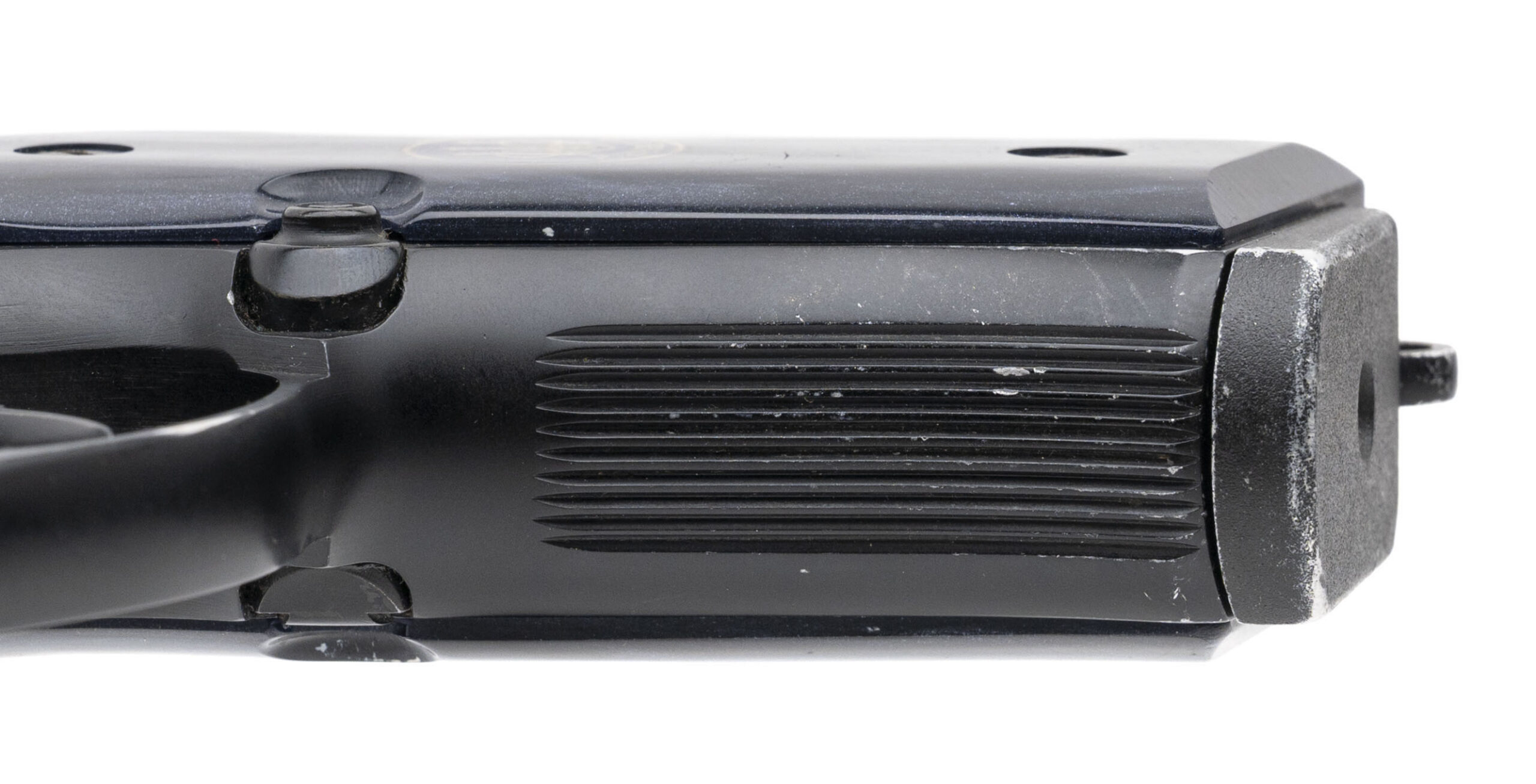 SN: A07686M. Modern production, .40 S&W with a 5" barrel. Bore is very good. Full size alloy frame double-action pistol with 3 dot sights, ambidextrous manual thumb-safety/decocker, matte black finish, and purple pearlite medallion Ajax grips. Finish & grips show light marks and edge wear. Overall condition is very good. Includes an additional magazine, and original case.