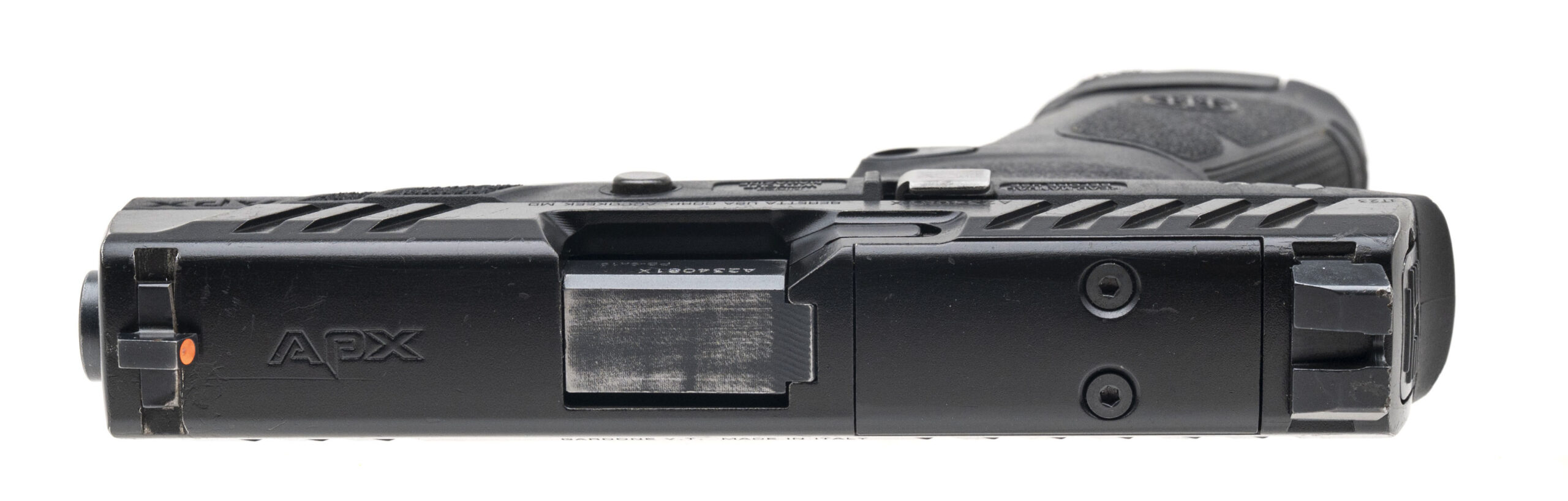 SN: A234081X. Modern production, 9mm with a 3.7" barrel. Bore is excellent. Compact polymer frame striker-fired pistol with optics ready slide, Trijicon front & rear night sight, accessory rail, matte black finish, and textured black polymer frame. Finish shows wear with moderate marks throughout. Frame shows minor handling wear. Includes additional magazine, original iron sights, and original carry case. Overall condition is very good.