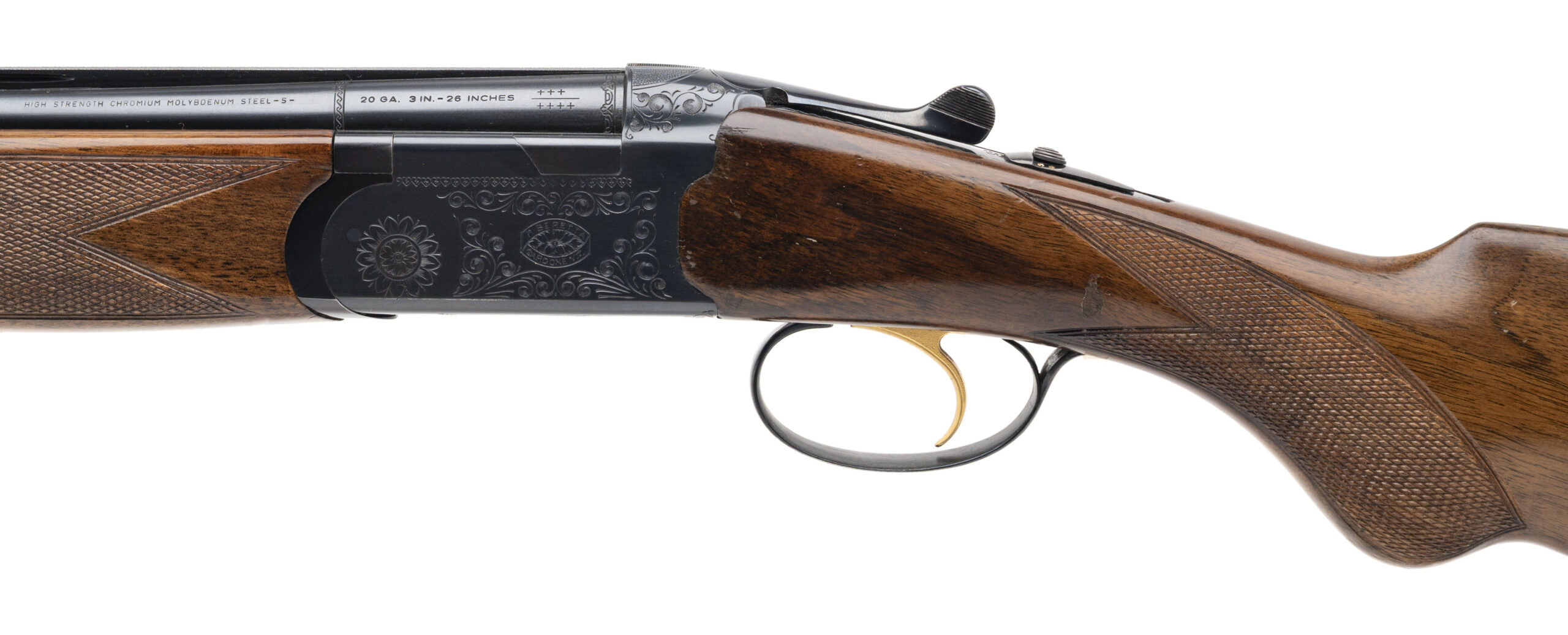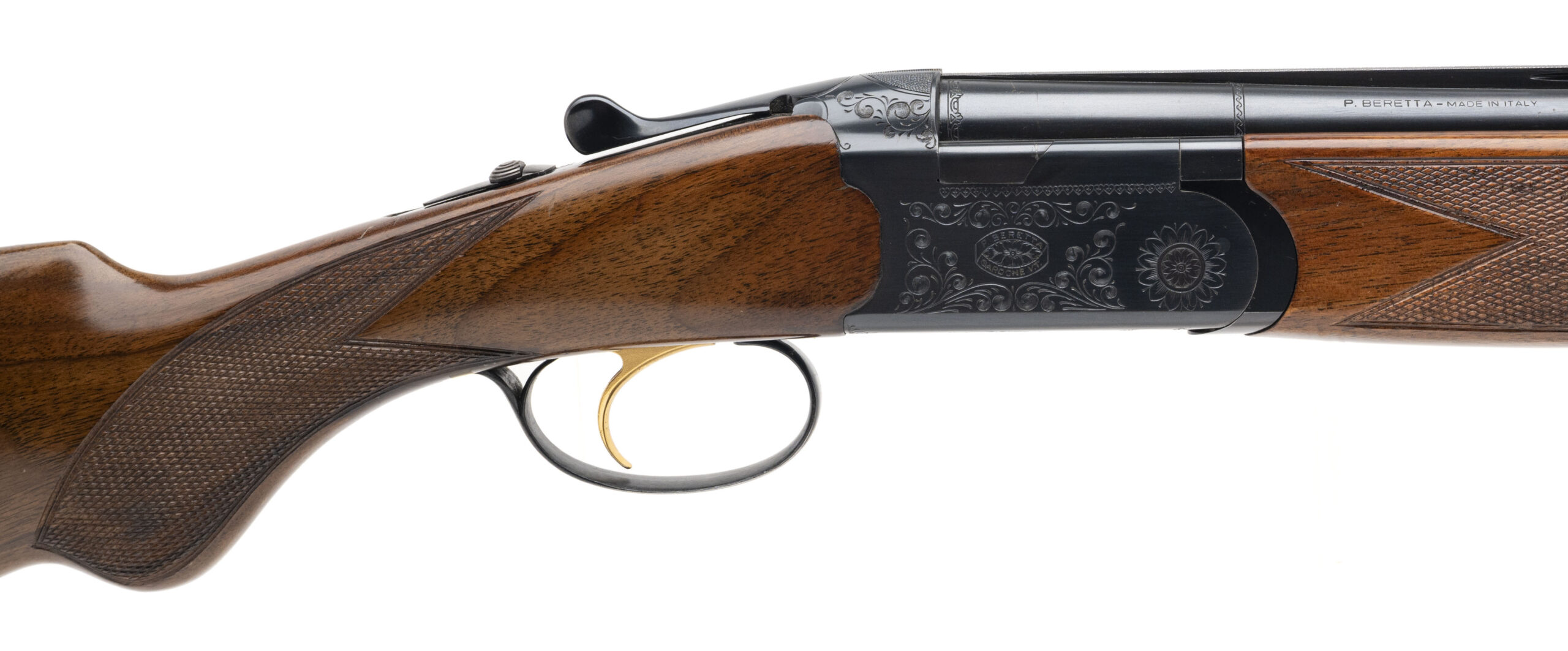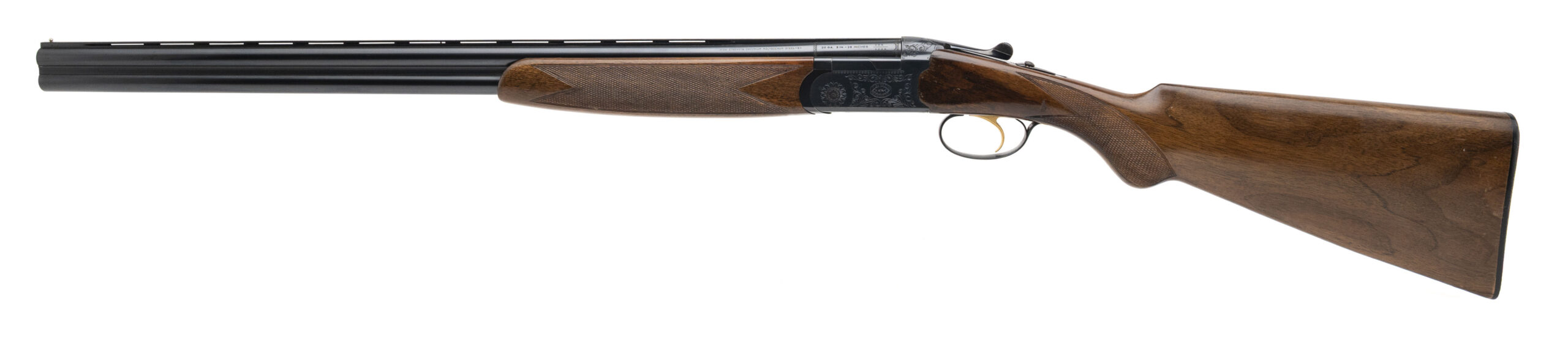 SN: V01103 made in Italy circa 1968. 20 gauge over under shotgun with 26.5" vent rib barrels (stamped 26") with 3" chambers and fixed chokes IC/MOD. Engraved blued box lock with a gold plated selective single trigger, extractors and an automatic safety. Checkered walnut furniture with a 14.25" LOP to the original butt plate. Some handling marks and only 1 very small crack about 1/4" long to the left of the bottom tang. Metal finish is very good, barrels lock up tight and the bores are excellent.