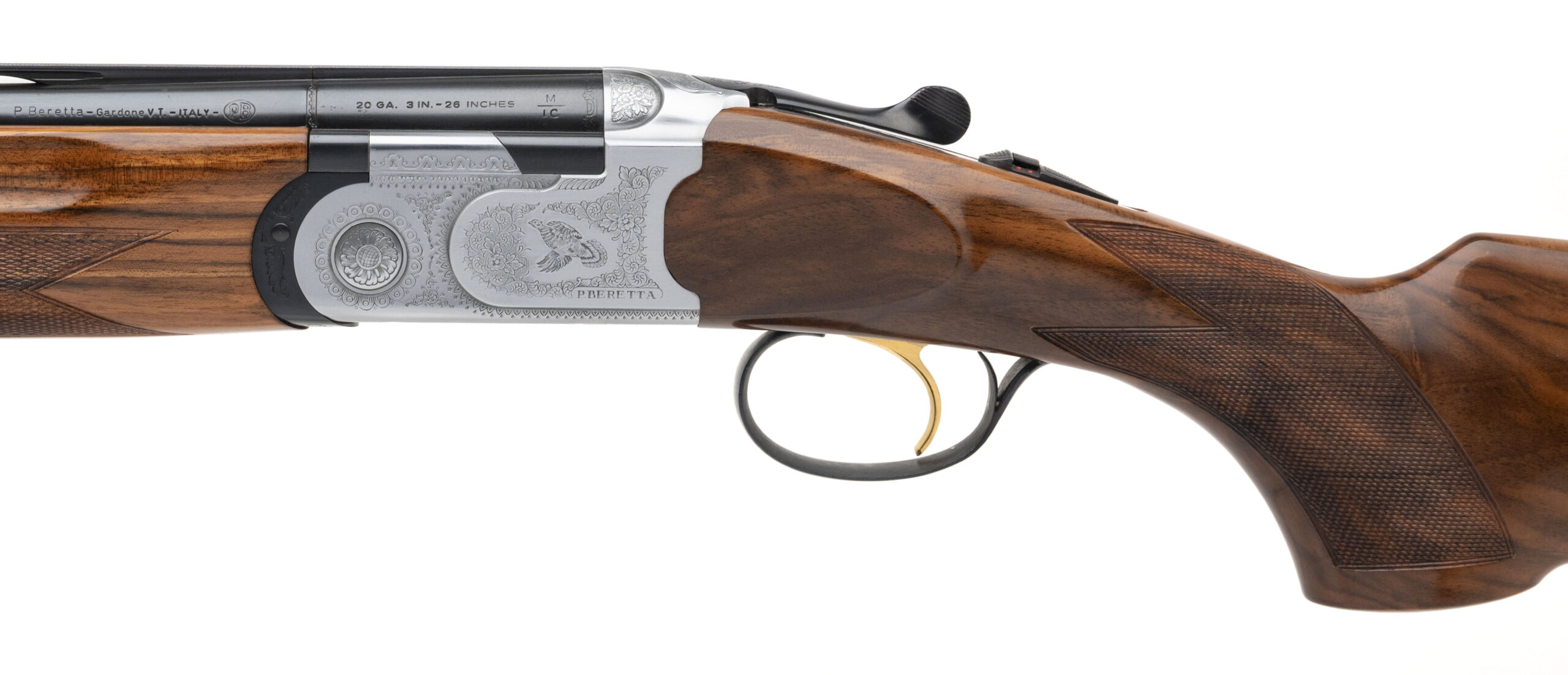 SN: E31735B made in Italy in 1986 for the Ruffed Grouse Society's 25th anniversary. 20 gauge over under field shotgun with 26" vent rib barrels, 3" chambers and fixed chokes IC/MOD. Engraved stainless box lock with ejectors, gold plates selective single trigger and automatic safety. High gloss checkered walnut furniture with a 14.5" LOP to the original wood butt plate. Some light handling marks visible, overall in very good condition with excellent bores.