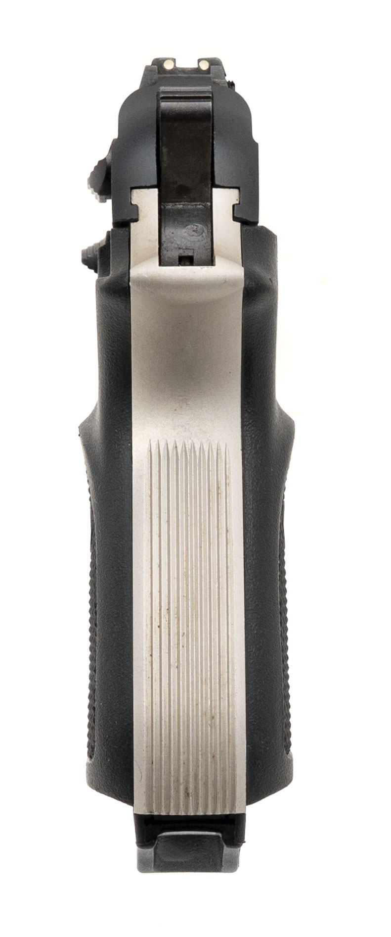 SN: H14726. Modern production, .380 ACP with a 3.5" barrel. Bore is excellent. Compact pistol with decocker, two-tone finish, and checkered black polymer grips. Marks to finish throughout, most notably to the slide. Overall condition is very good.