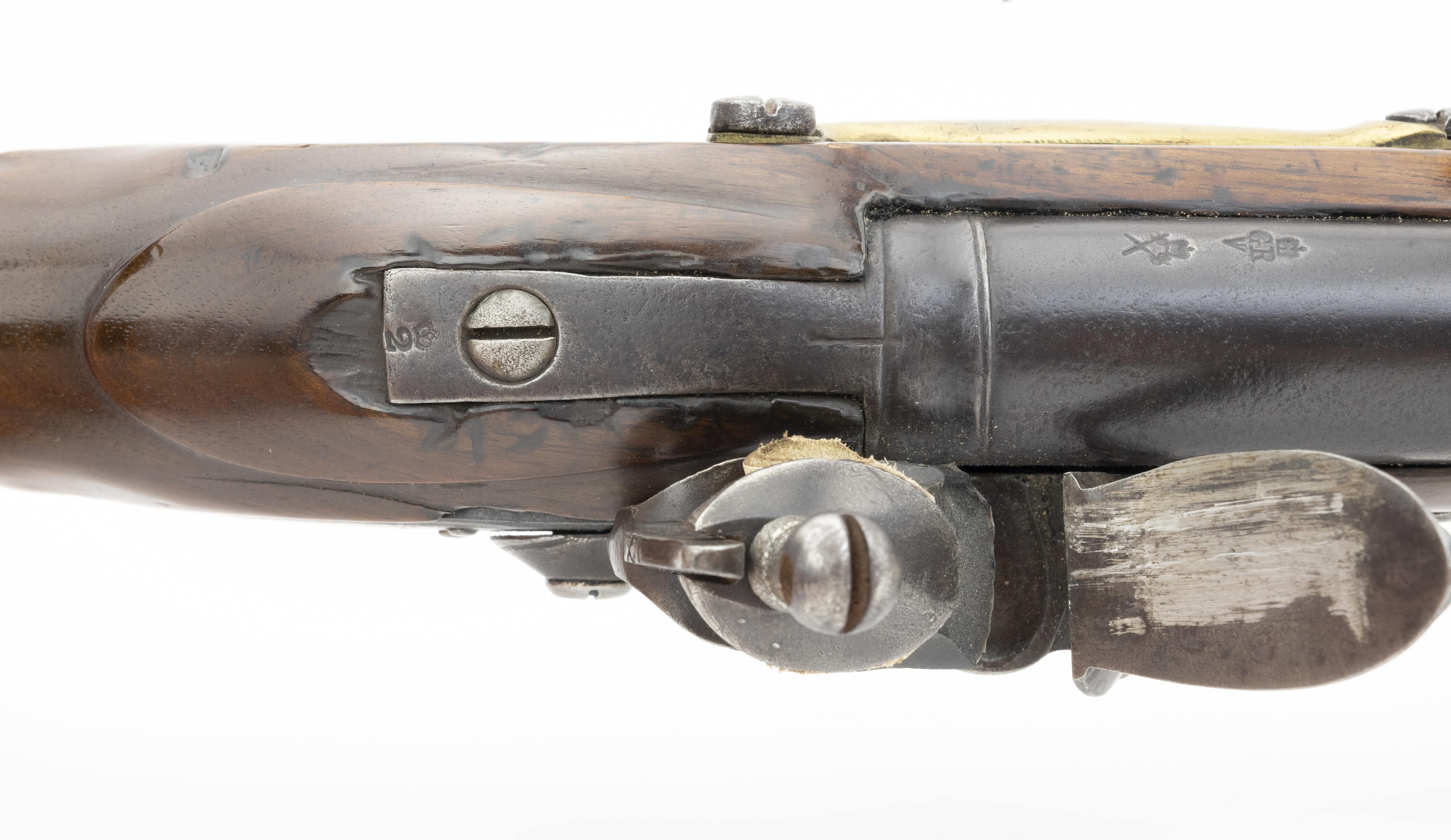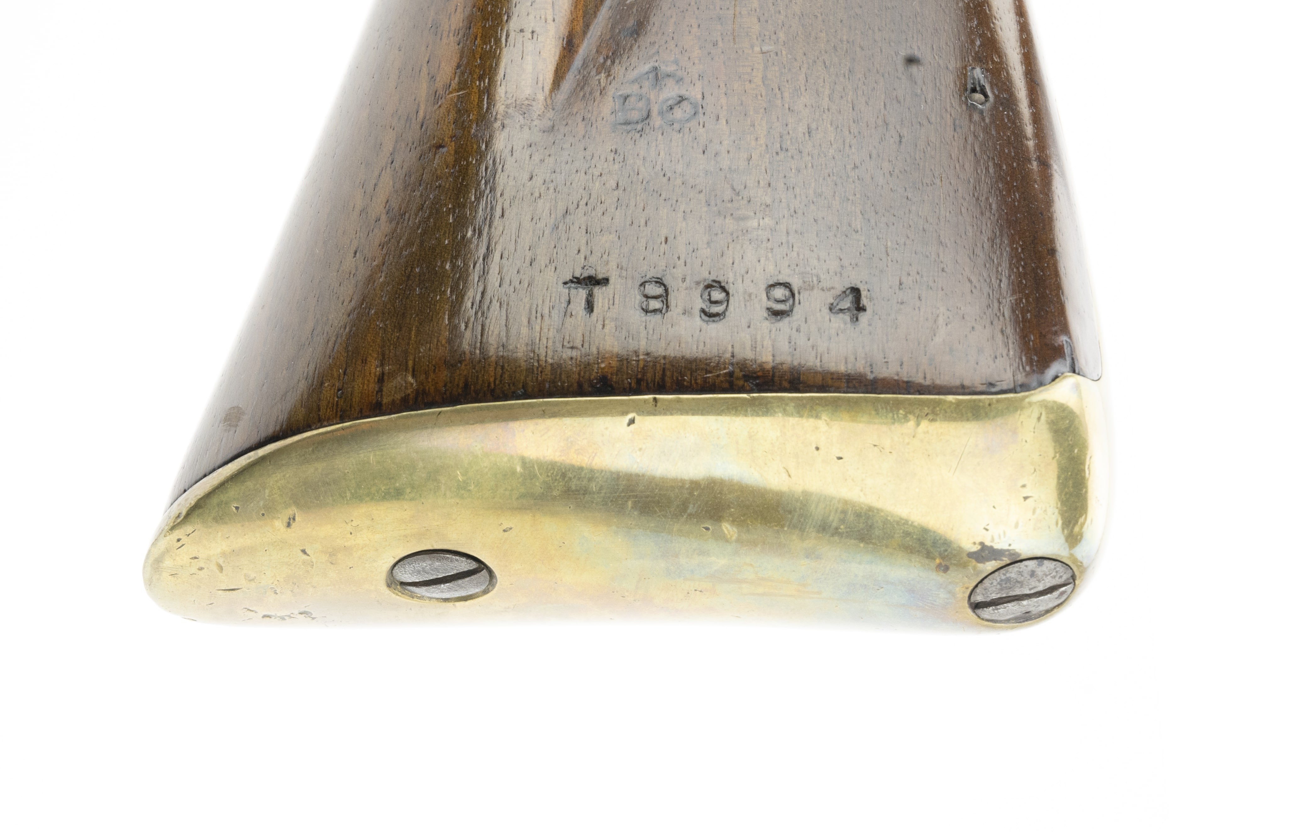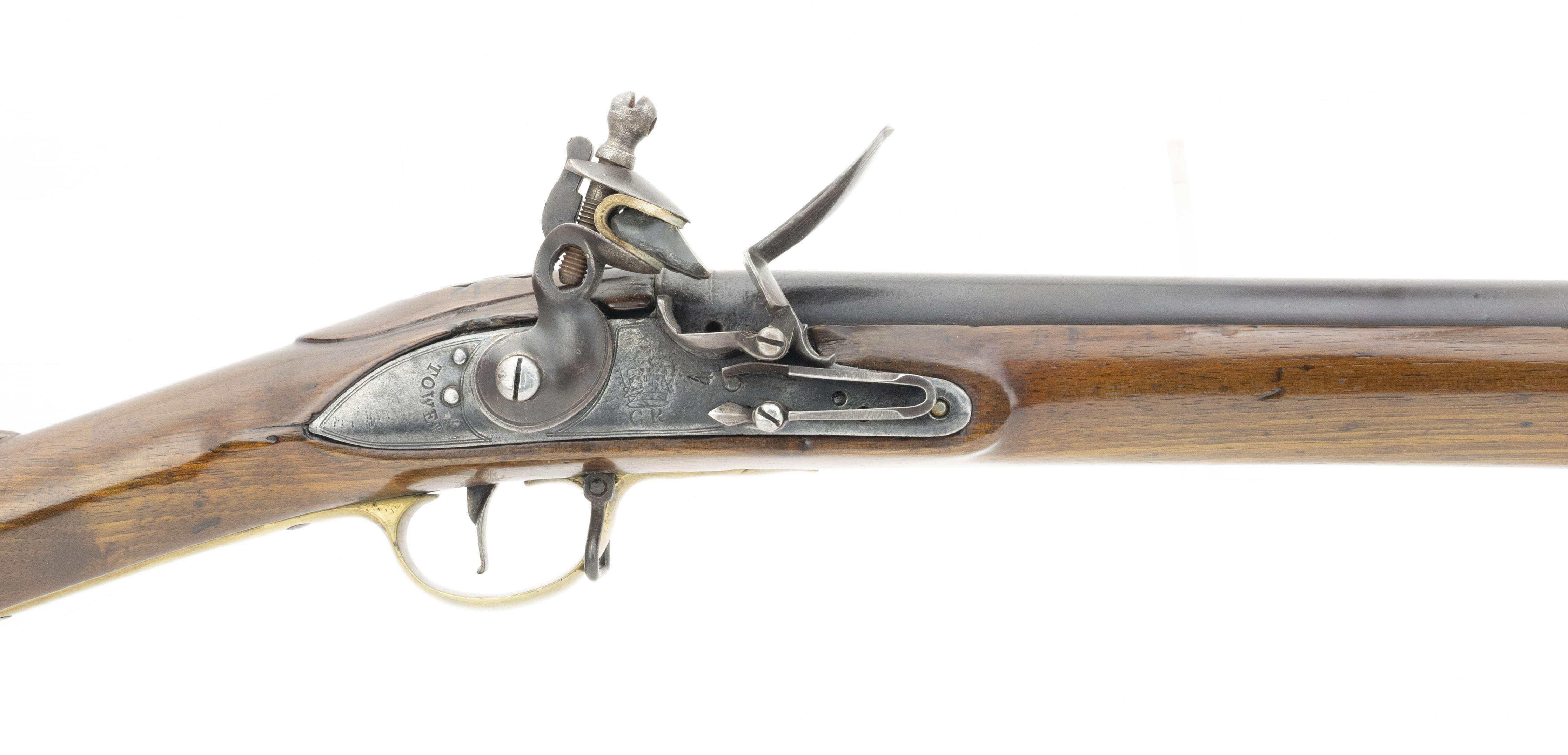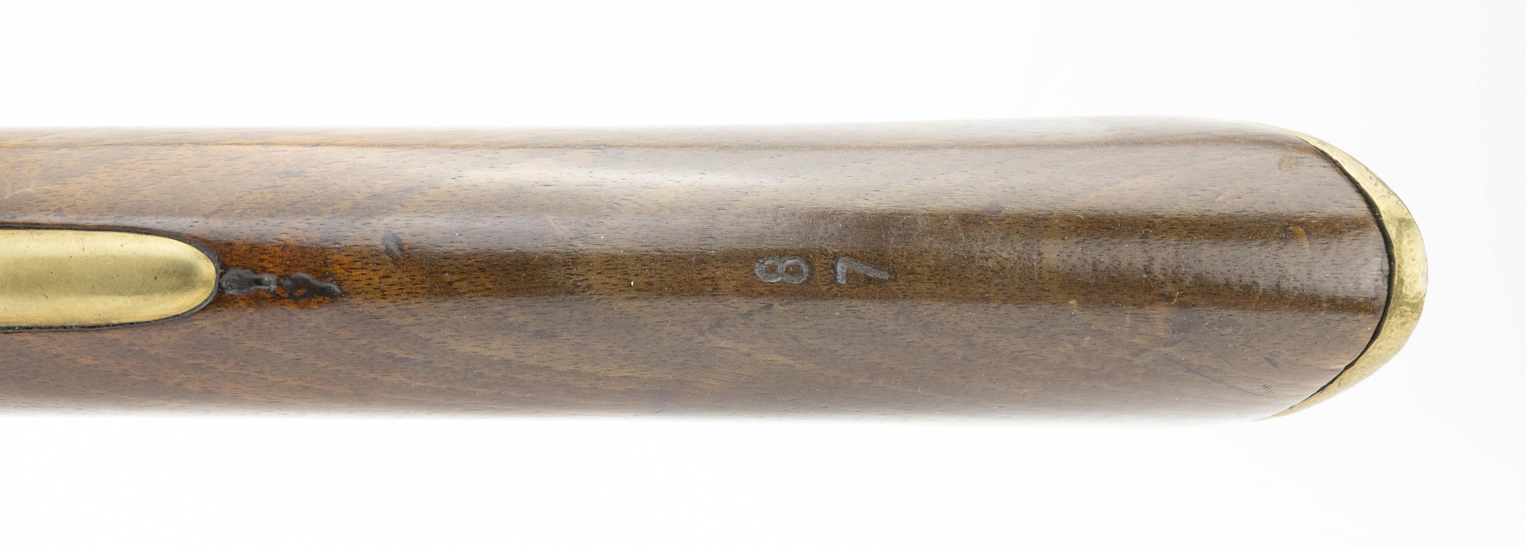 British 3rd Model Brown Bess Infantry .75 caliber musket. Circa early 19th Century 3rd Model Brown Bess was the primary British infantry musket during the Napoleonic Wars. The 39” round .75 caliber barrel has a very good smooth bore. Metal is very good overall with an even smooth blue/ brown patina. The wood, with added finish, is very good. Has old small chips at the top of the lock and rear of the top tang. Barrel has the expected military proof marks, and the lock has the crown/ GR with the Crown/ broad arrow to the right and Tower to the rear of the hammer. Stock has “WG” and an inspection stamp on the left flat opposite the lock. Left-side of the butt stock has the broad arrow/ Bo issue stamp and “T8994” stamped just above the butt plate. There are two inspection stamps just to the rear of the lower tang. “87” is stamped midway between the lower tang and butt plate. The sling swivels and cleaning rod are present. The action functions correctly. This is a very nice British military 3rd Model Brown Bess.