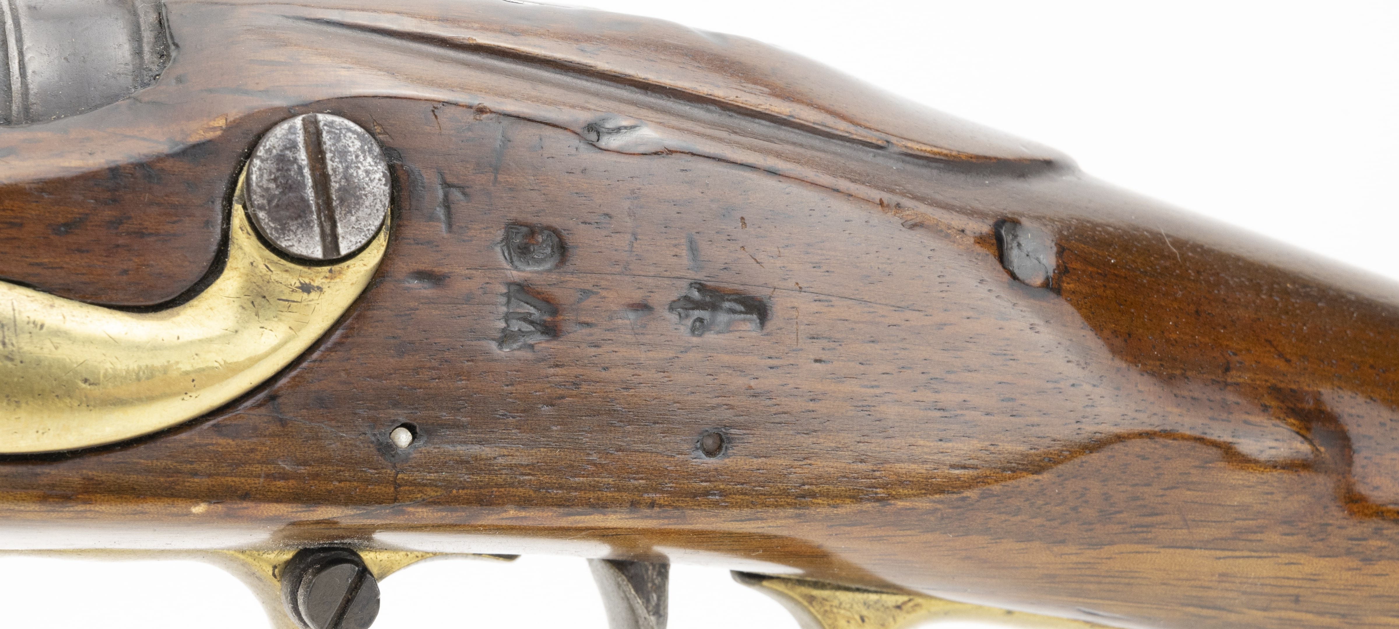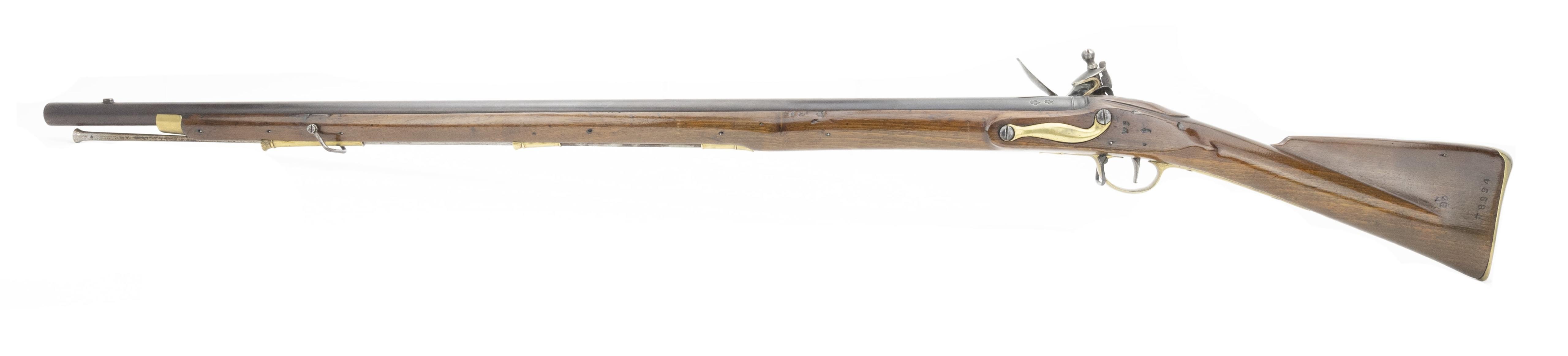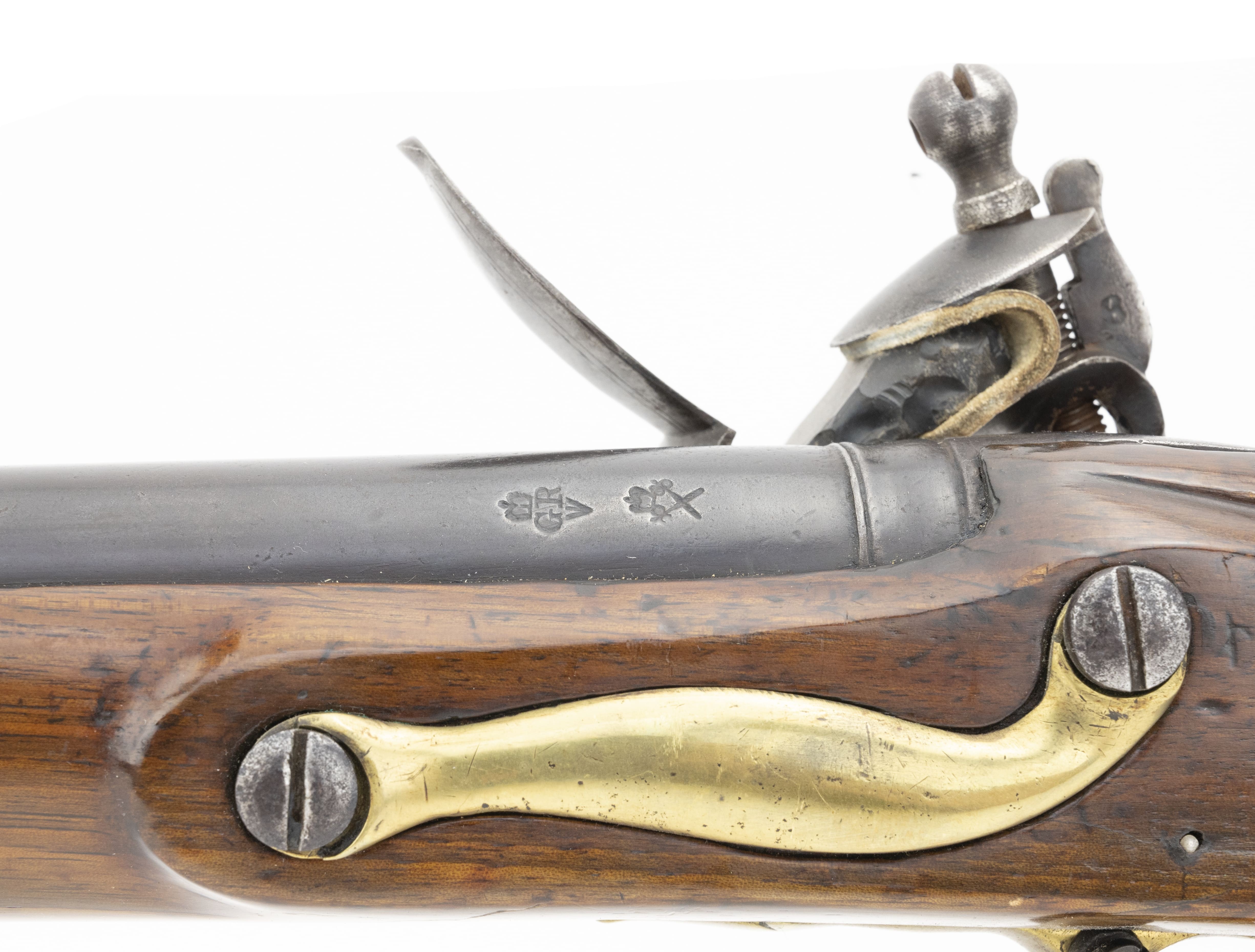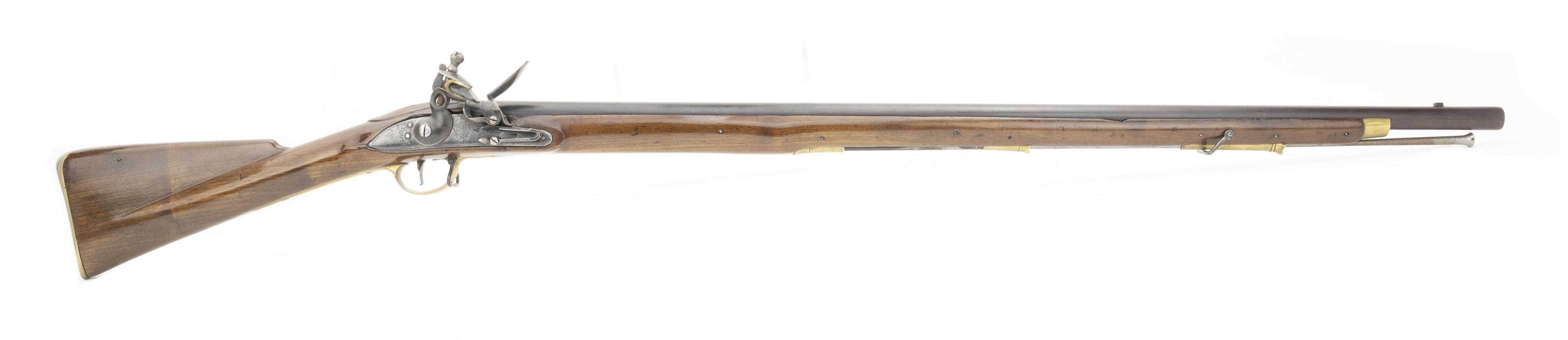 British 3rd Model Brown Bess Infantry .75 caliber musket. Circa early 19th Century 3rd Model Brown Bess was the primary British infantry musket during the Napoleonic Wars. The 39” round .75 caliber barrel has a very good smooth bore. Metal is very good overall with an even smooth blue/ brown patina. The wood, with added finish, is very good. Has old small chips at the top of the lock and rear of the top tang. Barrel has the expected military proof marks, and the lock has the crown/ GR with the Crown/ broad arrow to the right and Tower to the rear of the hammer. Stock has “WG” and an inspection stamp on the left flat opposite the lock. Left-side of the butt stock has the broad arrow/ Bo issue stamp and “T8994” stamped just above the butt plate. There are two inspection stamps just to the rear of the lower tang. “87” is stamped midway between the lower tang and butt plate. The sling swivels and cleaning rod are present. The action functions correctly. This is a very nice British military 3rd Model Brown Bess.