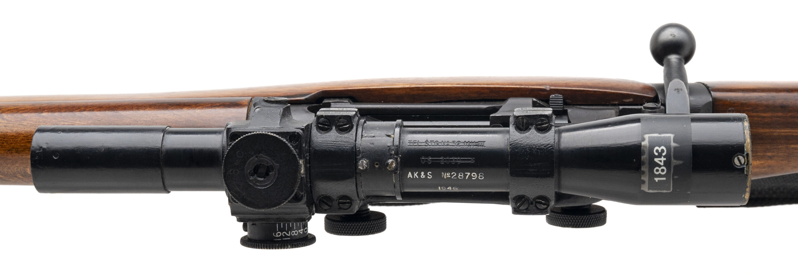 Serial No. G34689, originally manufactured circa early 1944 as a No.4 Mk.I(T) and later upgraded to L42A1 configuration in the 1960s for continued British military sniper use. Chambered in .308 Winchester (7.62 NATO), the rifle features a 27 ¾” heavy round barrel optimized for accuracy. Bolt and receiver serial numbers are matching, confirming core component integrity. The scope and mount are non-matching: scope is marked AK&S – No. 28798 / 1946, and the scope mount bears an electric pencil-engraved serial number 39828. Despite the mismatched numbers, the optic remains sharp and clear, retaining full functionality. The stock is in excellent condition, showing only minimal signs of handling or wear. Action is smooth and functions correctly, consistent with the high-quality conversions carried out by Enfield armorers during the L42A1 program. Only an estimated 400 L42A1 rifles were imported into the United States during the 1980s by Navy Arms, making this a rare and desirable sniper rifle with strong historical ties to both WWII and Cold War-era British forces