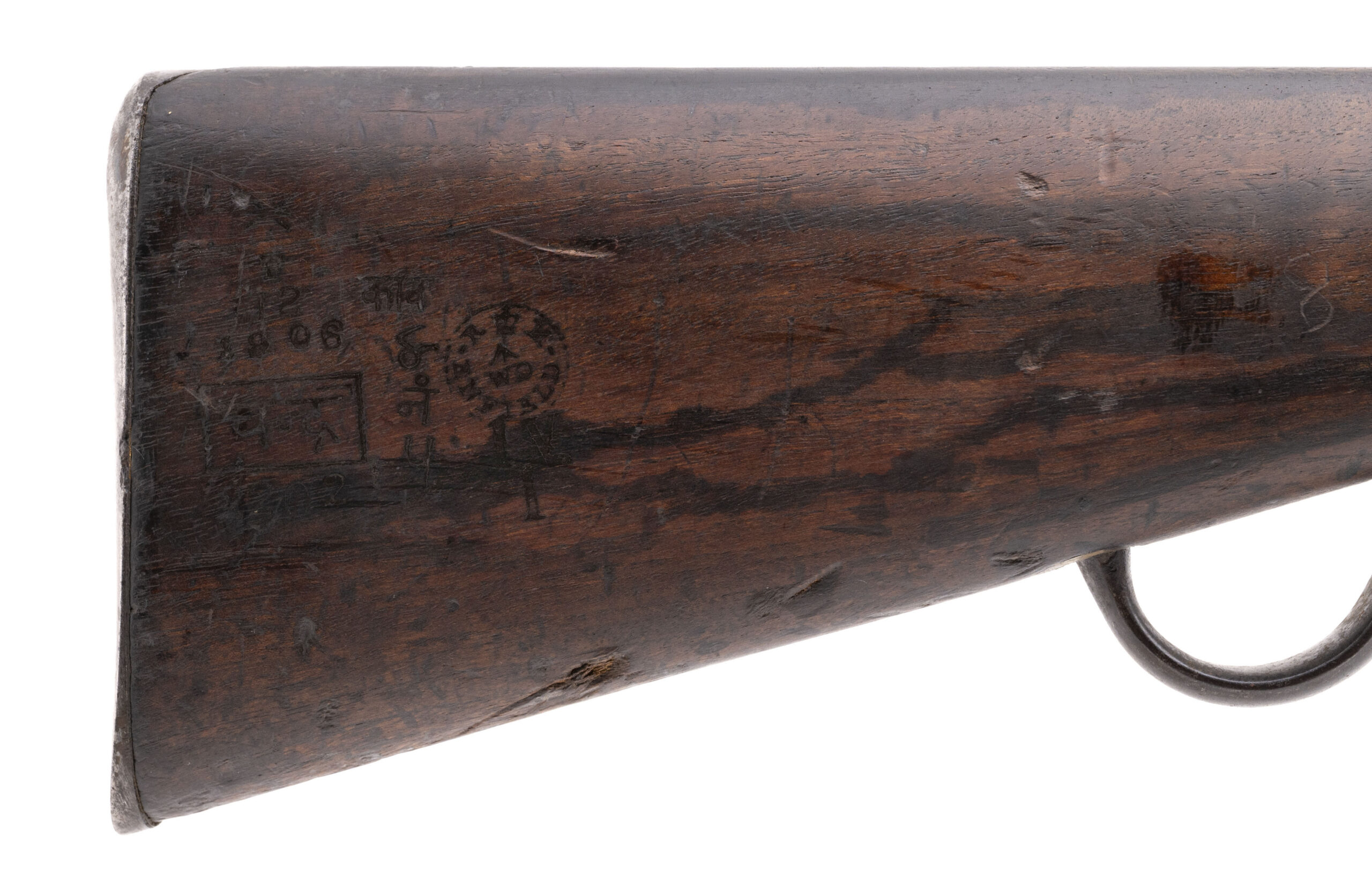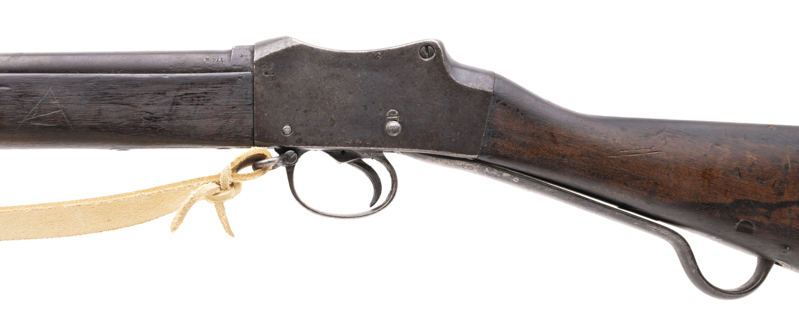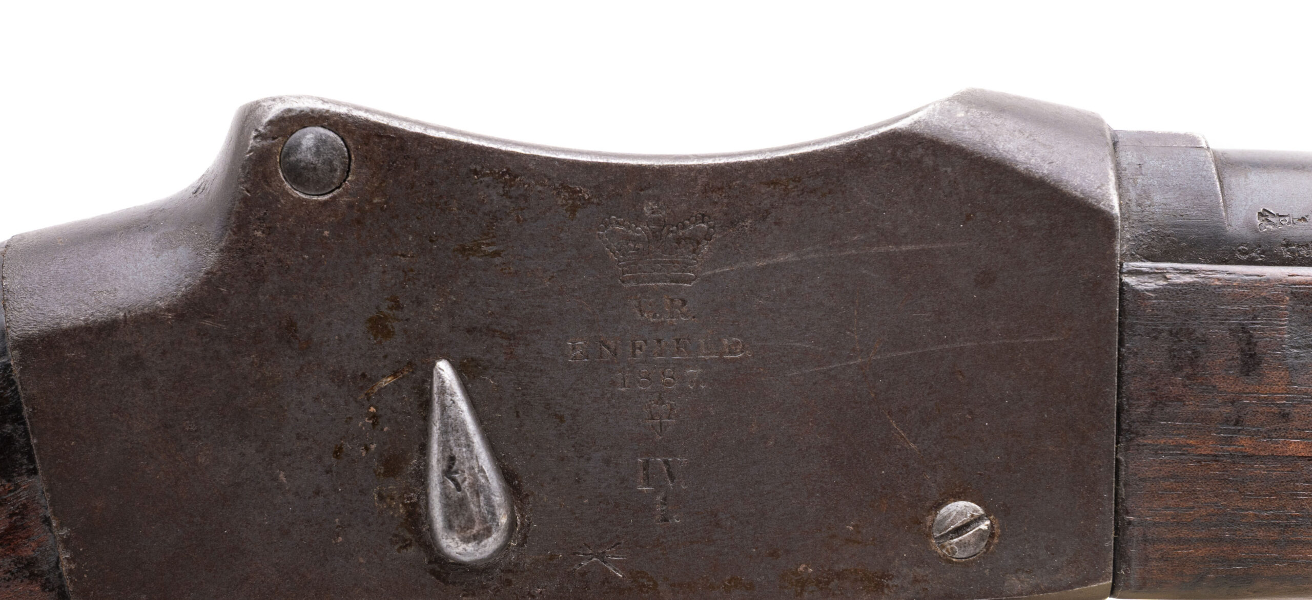 Serial No. B711, manufactured in 1887, chambered in .577/450 with a 33.5" round barrel. The bore is very good, retaining sharp and well-defined rifling. Metal surfaces have aged to a smooth brown patina, giving the rifle an attractive and honest appearance. Factory markings on the right side of the receiver remain sharp and clearly legible. The stock is in very good condition, showing only light handling impressions consistent with age and service. Overall presentation is well preserved for a late-Victorian service rifle. Action is smooth and functions