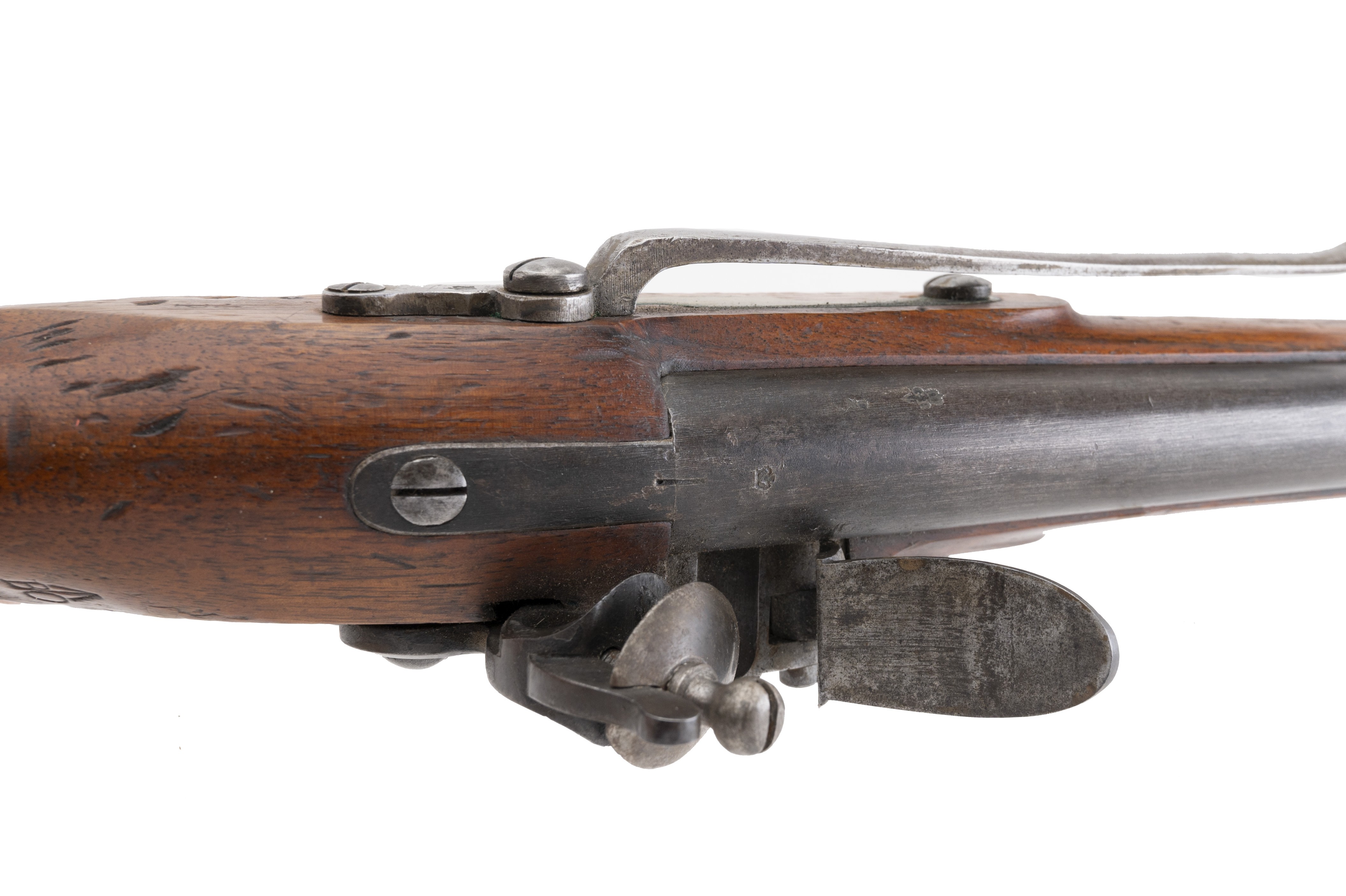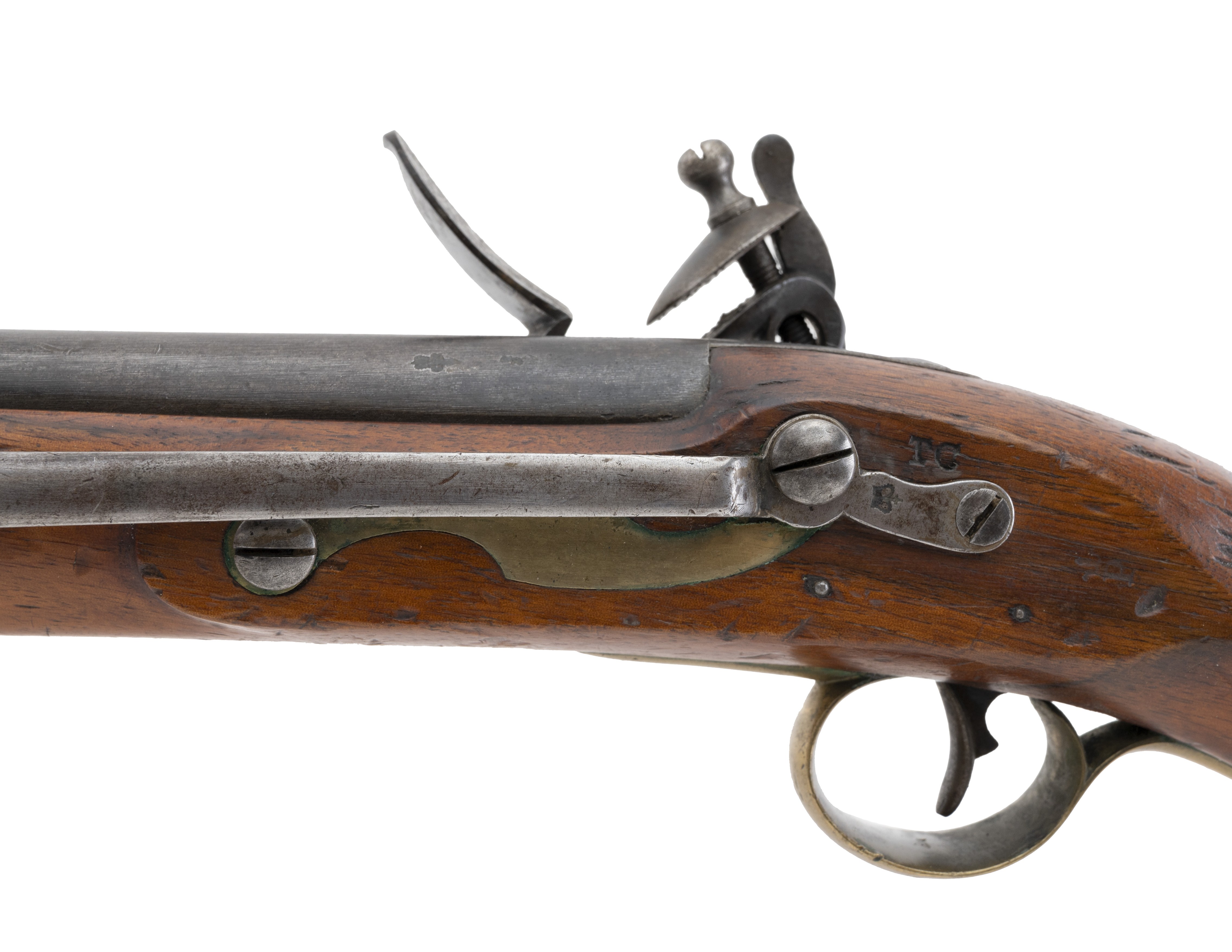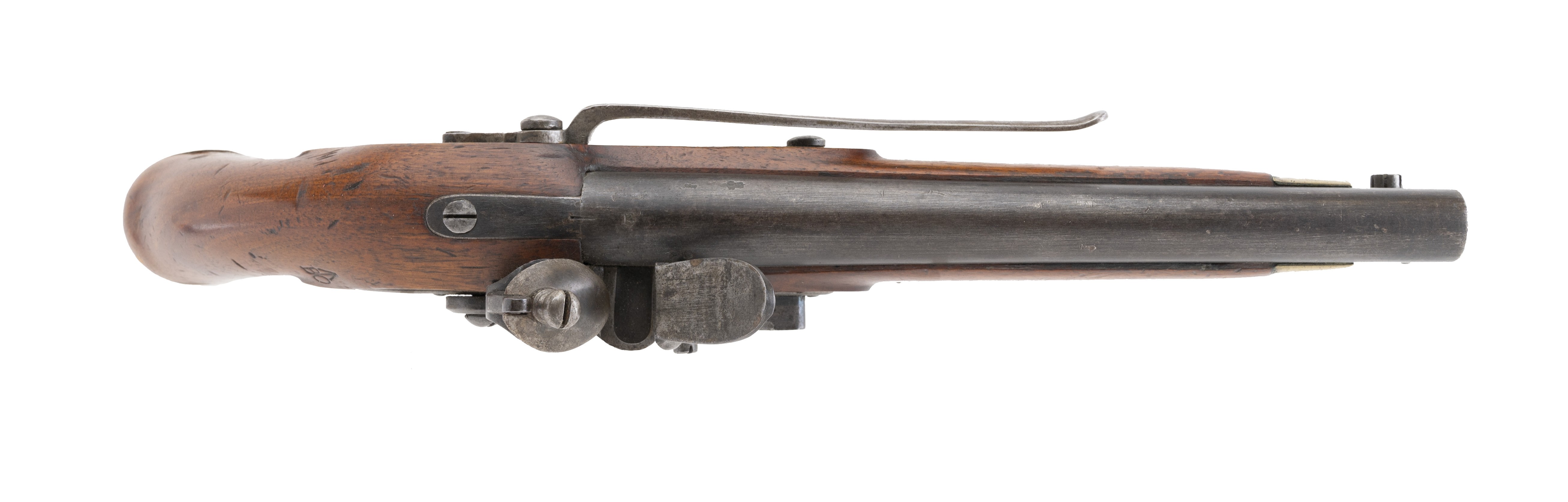 This British New Land Pattern Sea Service flintlock pistol was produced under the reign of King William IV (1830 - 1837). The New Land Pattern Sea Service pistol is very similar to the standard New Land Pattern pistols with the exception of the 57 vs. 65 caliber bore and the sea service belt hook and butt cap. The overall length is approx. 15.5". The 9" round 57 caliber barrel has a fine smooth bore. The barrel has a crown over GR over broad arrow proof on the left and a crown on the top rear. All metal parts have a gray-brown patina. The lock has a crown over WR and crown with broad arrow to the right. The brass nose cap, ramrod pipe, trigger guard, butt cap, and side plate are very good with a nice aged patina. The belt hook and captured ramrod are present. The stock is very good with light usage marks, and an old repaired crack on the bottom from the nose cap to trigger guard tang. It is marked with broad arrow BO near the lock side teardrop, and with three storekeeper's marks on the right grip. The left flat is stamped TC above the belt hook and a symbol over a P on the left flat. The action functions correctly. These sea service pistols from the reign of William IV are rarely seen and this one is a very nice example.
