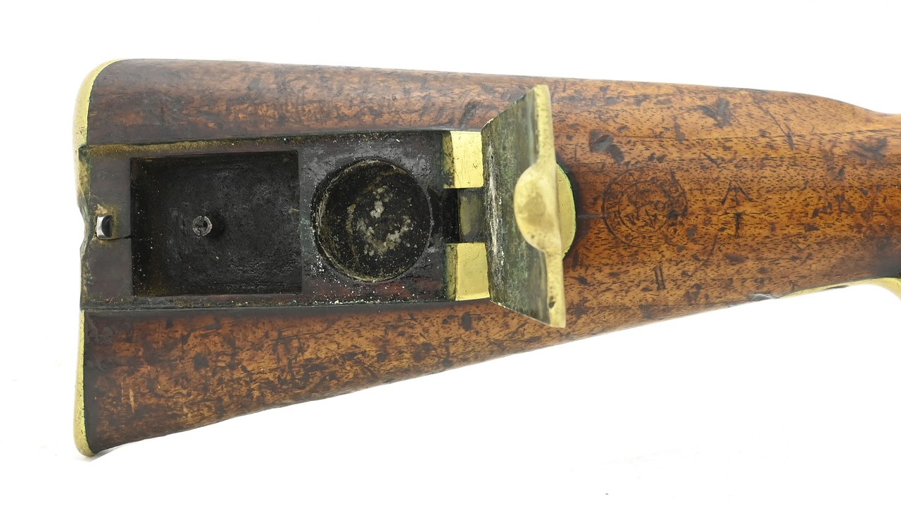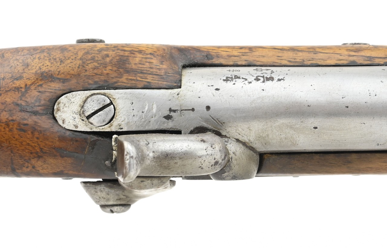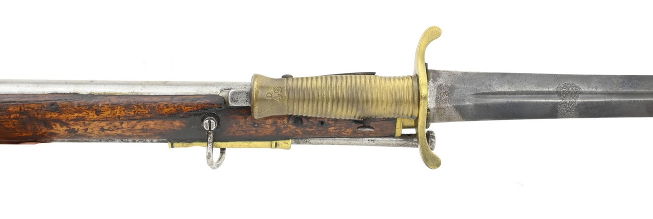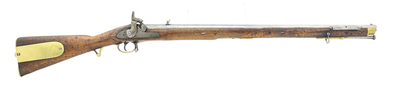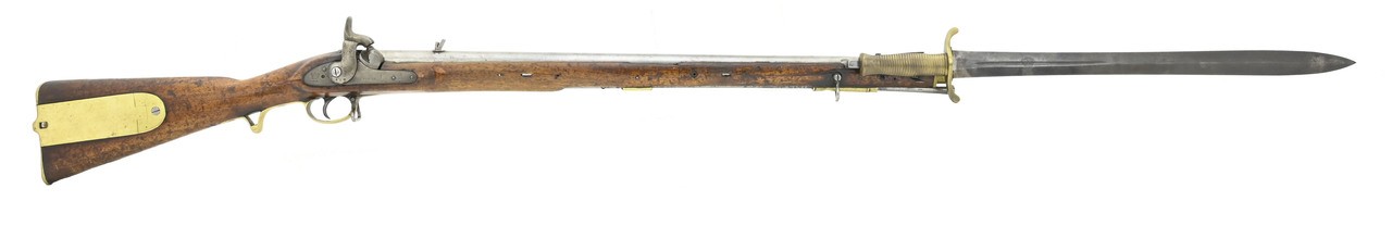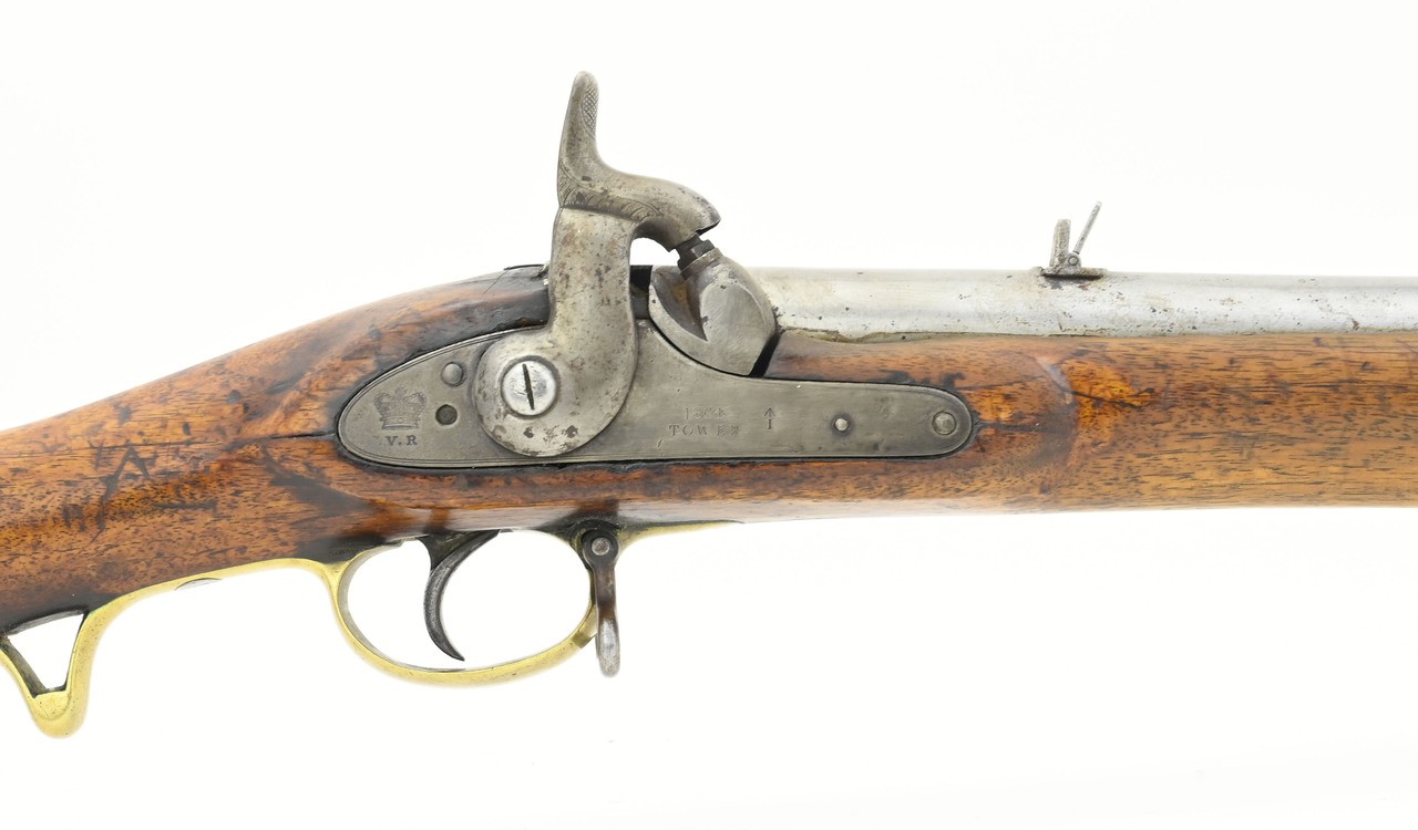 British Pattern 1845 Brunswick rifle with bayonet. The overall length is approximately 45½”. The 30” round .704 caliber barrel has the 2-groove Brunswick rifling. These grooves engage a specialty case ball which has a raised belt to fit the grooves. The bright barrel is smooth and clean with a few areas of light staining. The barrel has the standard proof and inspection marks. The lock has a board arrow over “I” to the front followed by 1864/Tower. The lock tail has a crown over “V.R.”. The stock is good with the dents and dings of an issue gun. There are two area of wood loss at the barrel channel, approximately 2¾” on the right and approximately 4½” on the left. There are a couple of stress cracks to the front and rear of the cock. The round issue stamp, just forward of the patch box, has a crown over “W” broad arrow “O” in the center and “Tower of London” around the outside. Just forward of that is a broad arrow over “I” (same as the lock). The brass furniture is fine. The action functions correctly. The included bayonet is fine overall, with one area of pitting about ½” wide 4” forward of the guard. It is marked “Enfield 18(?)8” (third number is illegible) and above that is a crown over “VR”. The reverse has a crown/F/6. The hilt is marked “D/43”. Most of the original blue is on the blade. Here’s your chance to own an iconic British rifle with bayonet at a reasonable price.