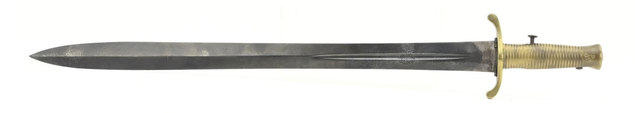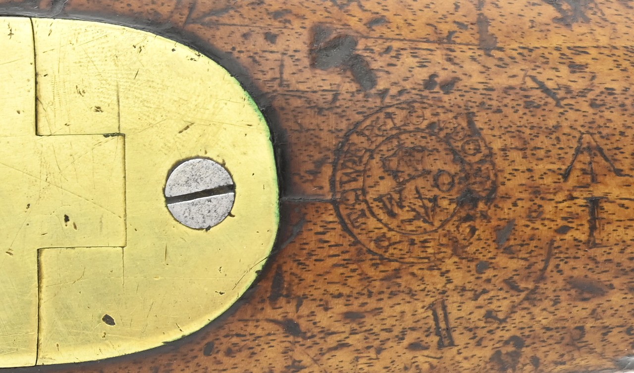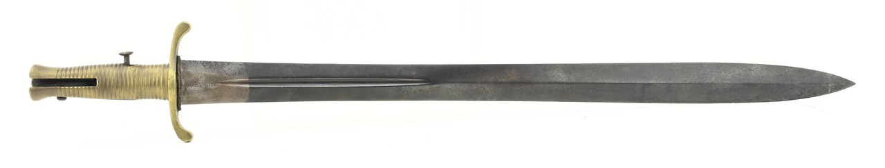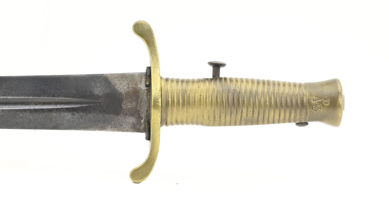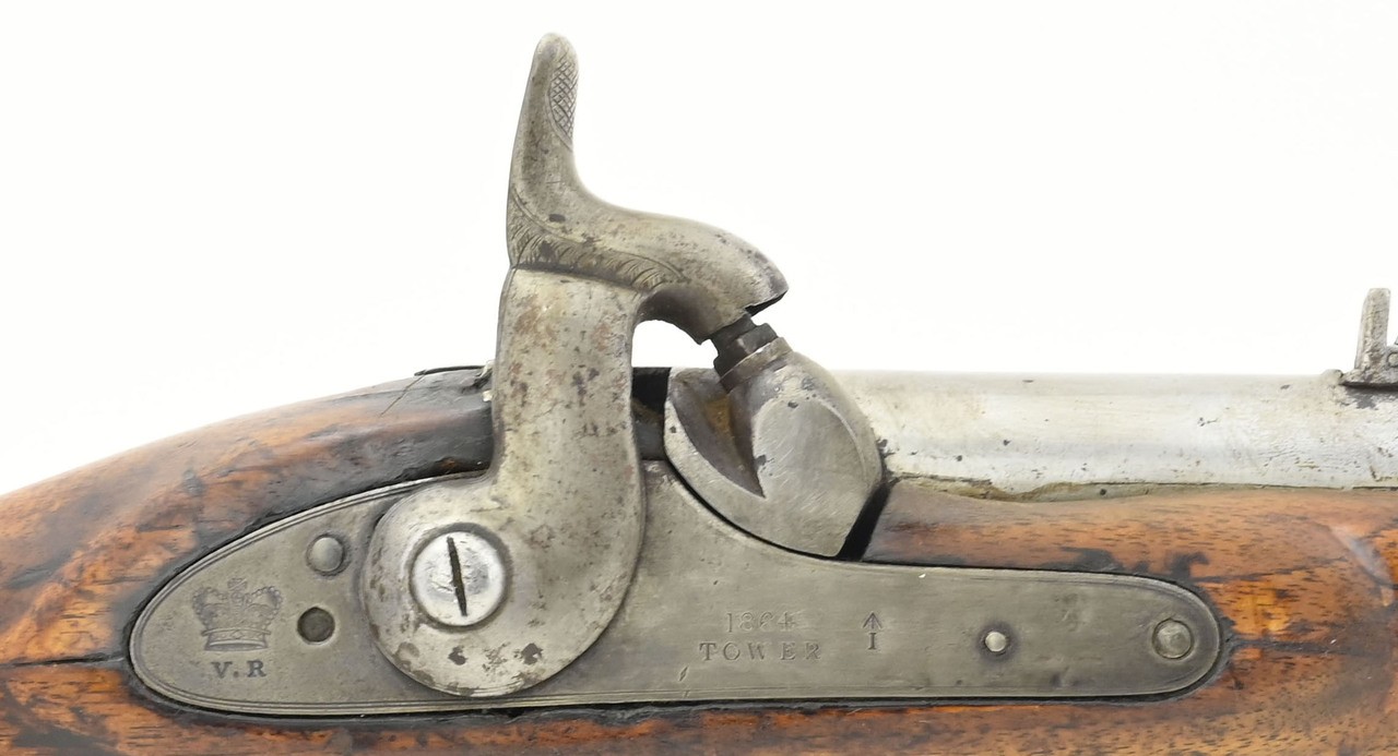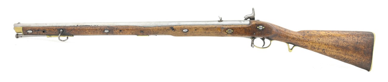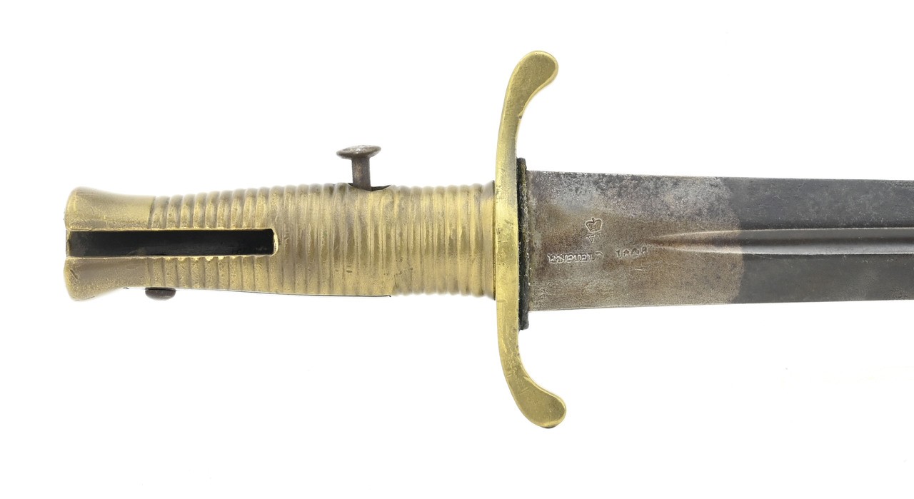 British Pattern 1845 Brunswick rifle with bayonet. The overall length is approximately 45½”. The 30” round .704 caliber barrel has the 2-groove Brunswick rifling. These grooves engage a specialty case ball which has a raised belt to fit the grooves. The bright barrel is smooth and clean with a few areas of light staining. The barrel has the standard proof and inspection marks. The lock has a board arrow over “I” to the front followed by 1864/Tower. The lock tail has a crown over “V.R.”. The stock is good with the dents and dings of an issue gun. There are two area of wood loss at the barrel channel, approximately 2¾” on the right and approximately 4½” on the left. There are a couple of stress cracks to the front and rear of the cock. The round issue stamp, just forward of the patch box, has a crown over “W” broad arrow “O” in the center and “Tower of London” around the outside. Just forward of that is a broad arrow over “I” (same as the lock). The brass furniture is fine. The action functions correctly. The included bayonet is fine overall, with one area of pitting about ½” wide 4” forward of the guard. It is marked “Enfield 18(?)8” (third number is illegible) and above that is a crown over “VR”. The reverse has a crown/F/6. The hilt is marked “D/43”. Most of the original blue is on the blade. Here’s your chance to own an iconic British rifle with bayonet at a reasonable price.