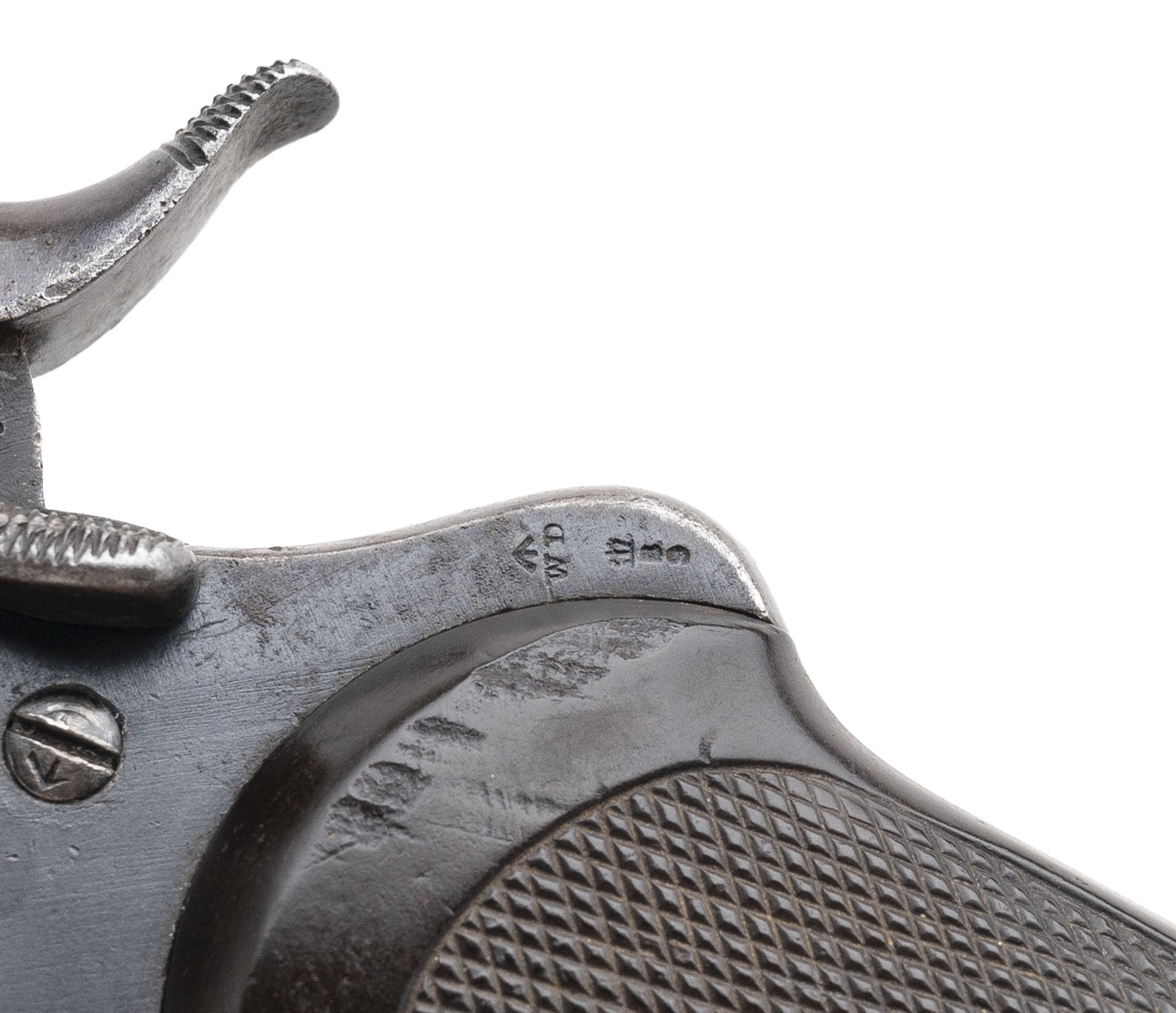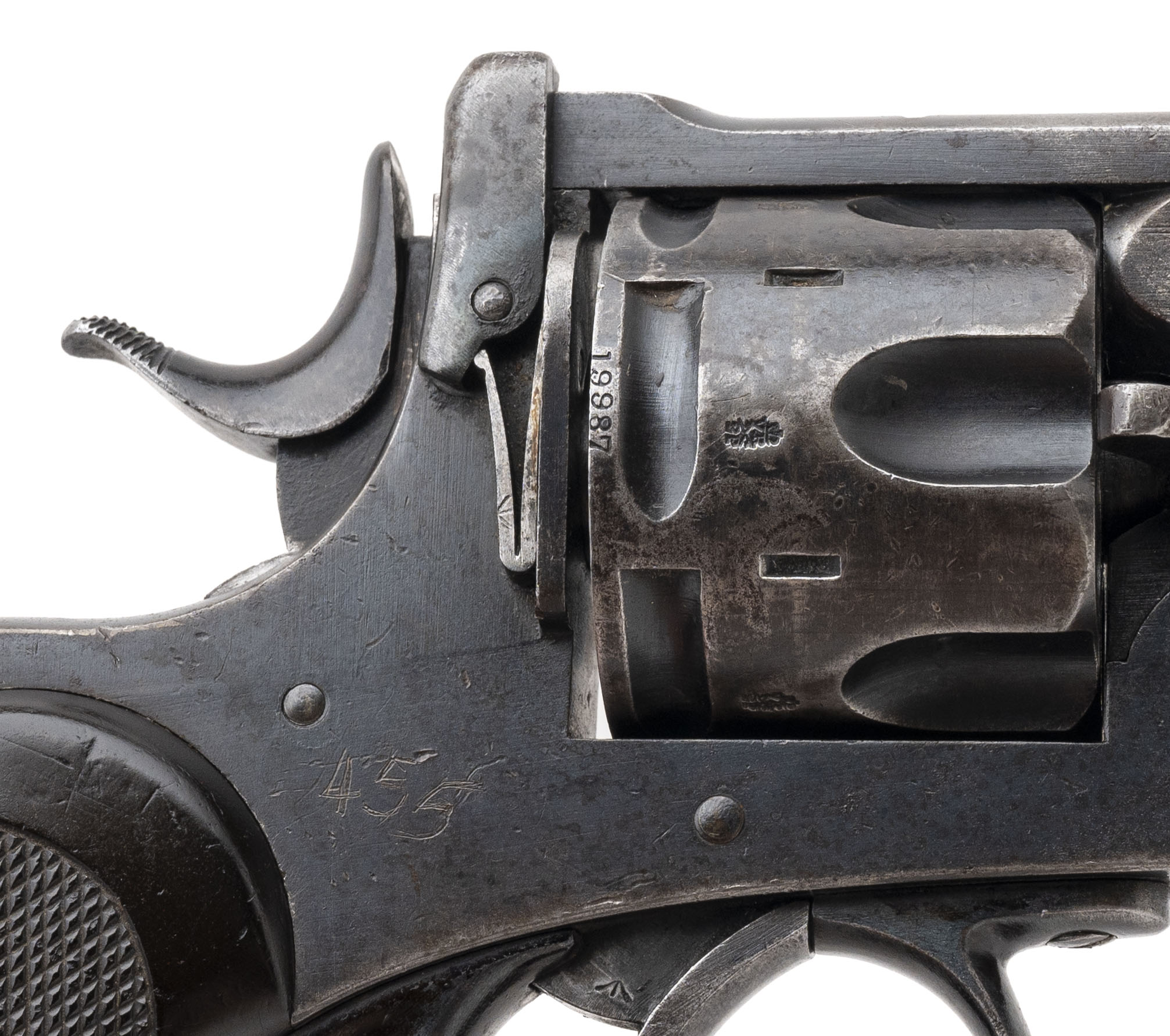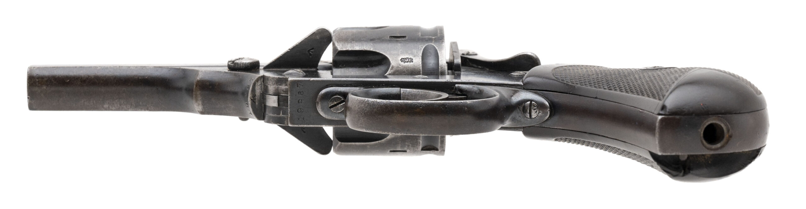 Serial No. 19987, circa early 1890’s, cut for .45ACP, 4” octagonal barrel. Bore is bright with scattered frosting and oxidation noted. Majority of the original blue has thinned to a grey patina; factory markings and Broad Arrow remain sharp. Grips show some handling wear with the right-side having loss at the toe. Action indexes correctly with a tight lock up. Rear strap is marked “N/24/18”
