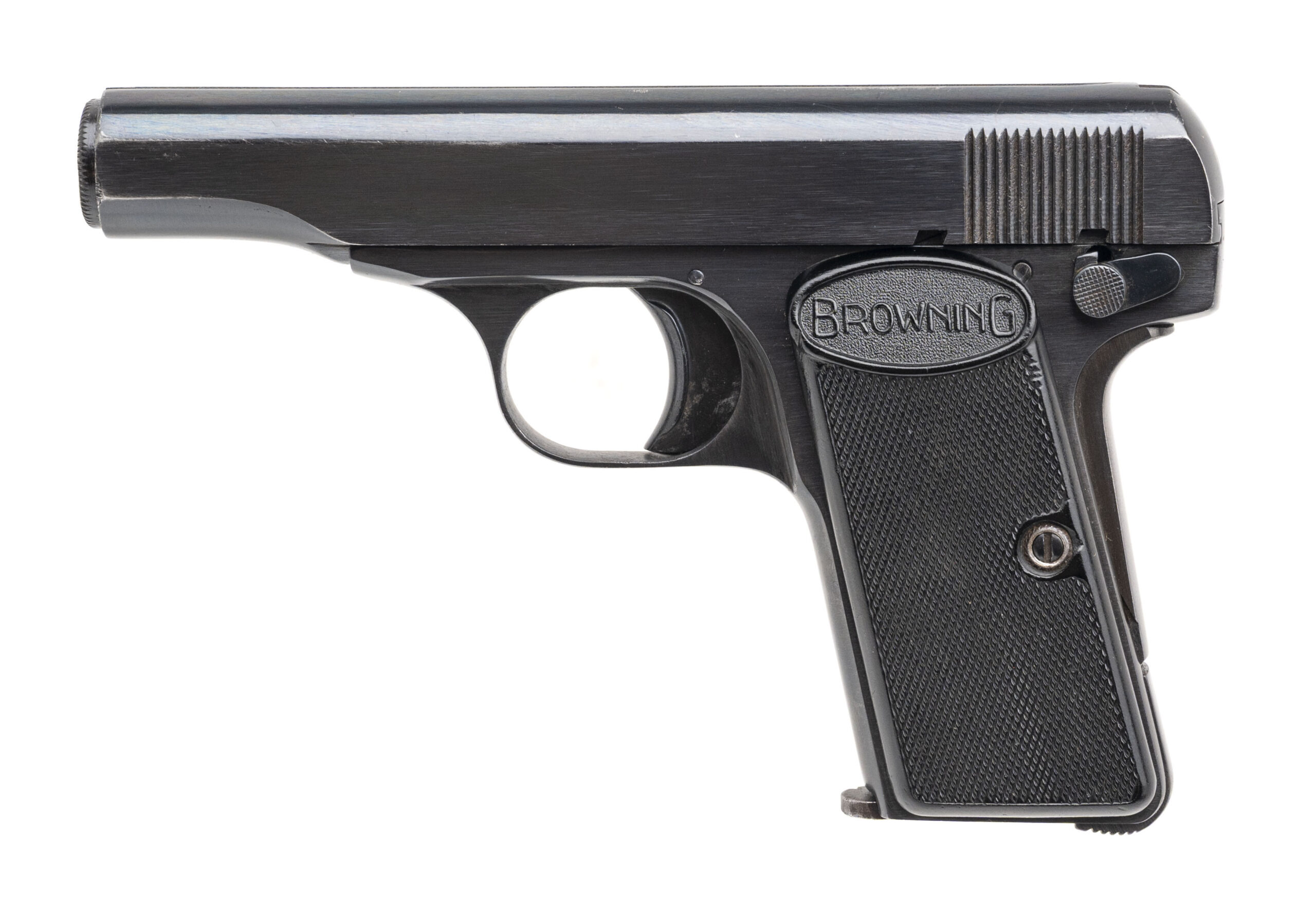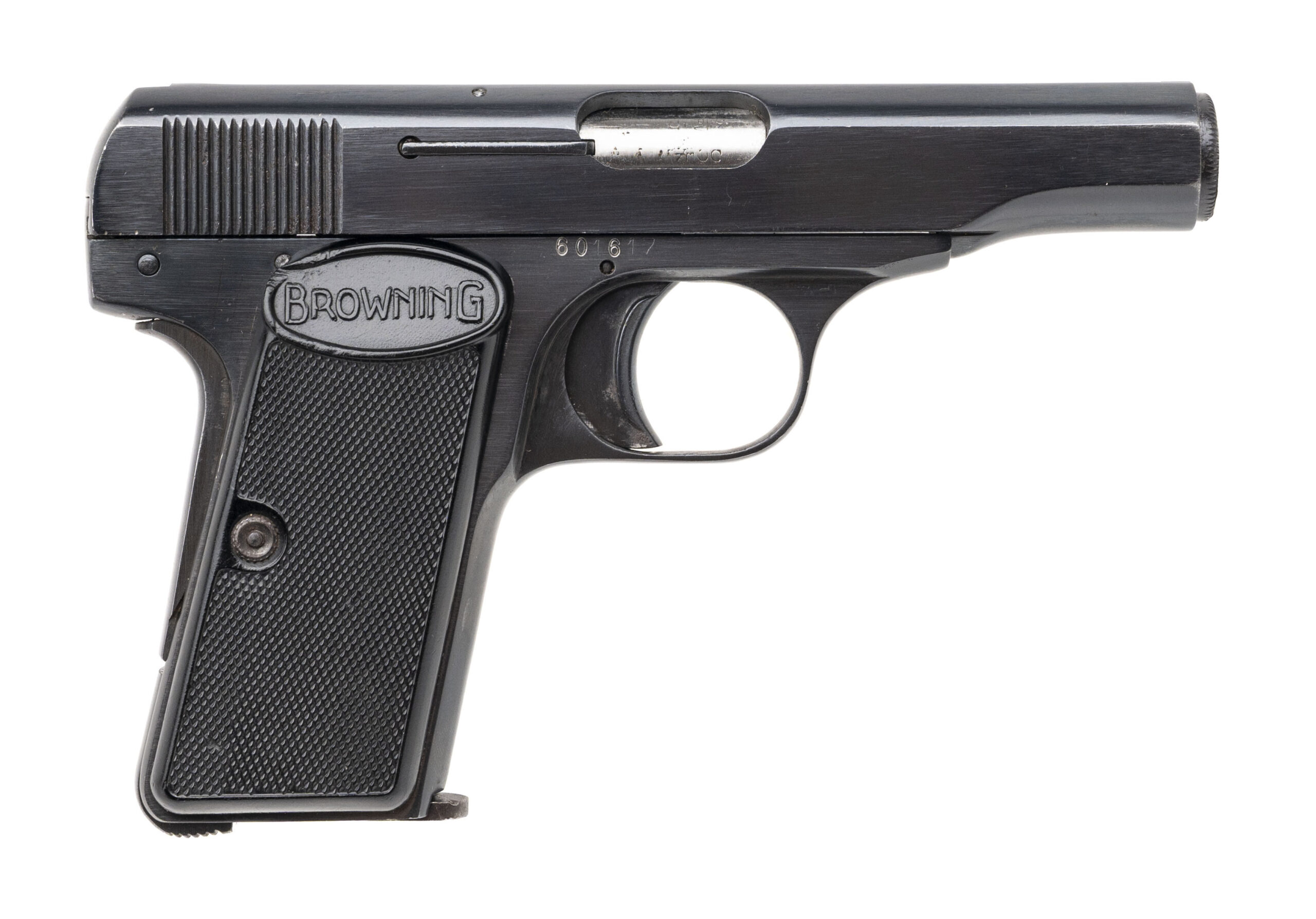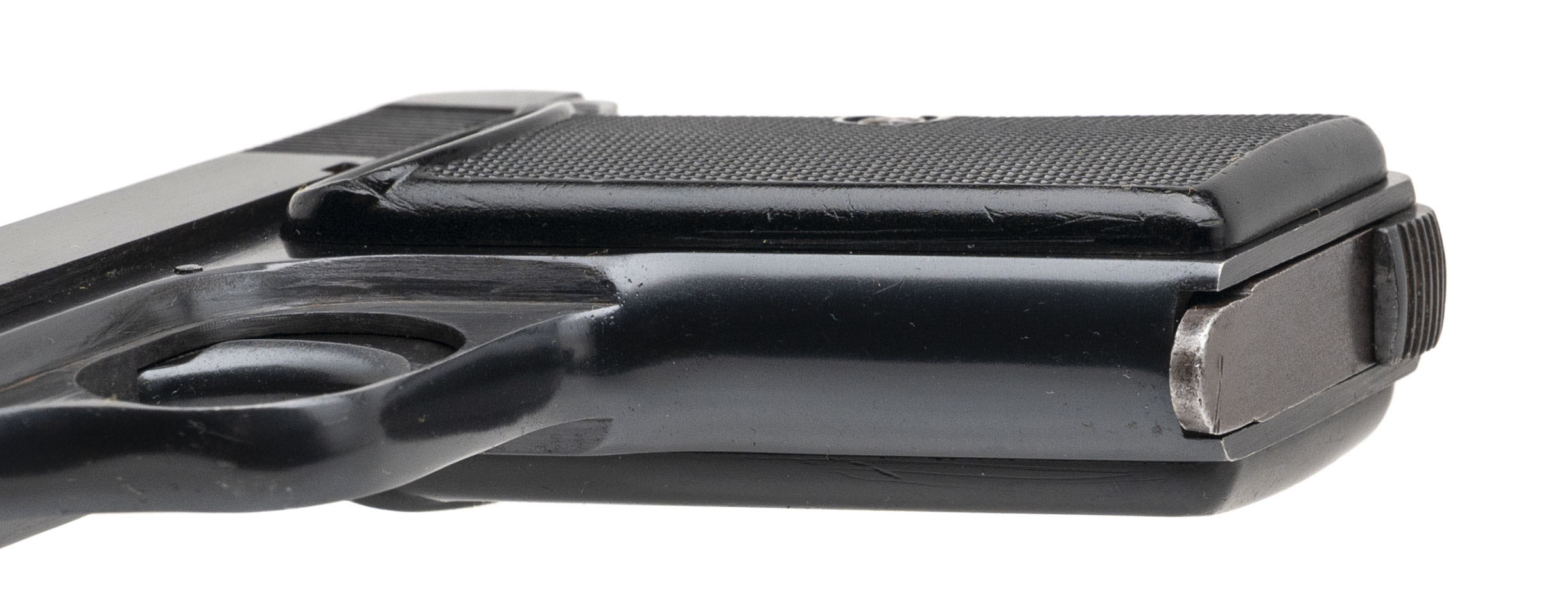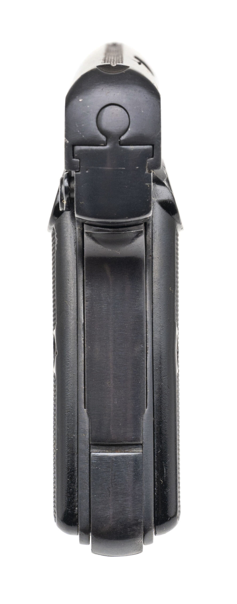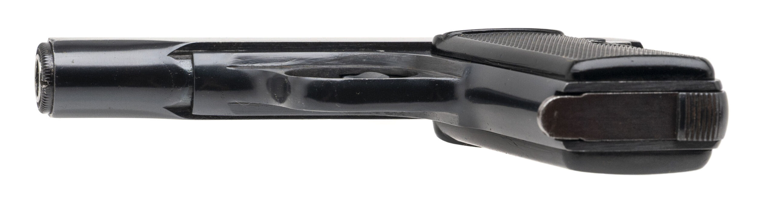 SN: 601617. Made in 1967, .380 ACP with a 3.5" barrel. Bore is very good. Belgian made semi-automatic pistol with blue finished frame, and checkered plastic grips. Finish shows light handling marks throughout, most notably to the top of the slide. Overall condition is very good.