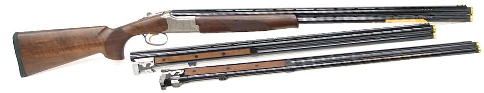 Browning 525 20, 28 & 410 gauge shotgun. 3-barrel set with 30 barrels, oil finish walnut stock, R.H. palm swell, Schnabel forearm and a total of 5 Midas grade chokes. New.