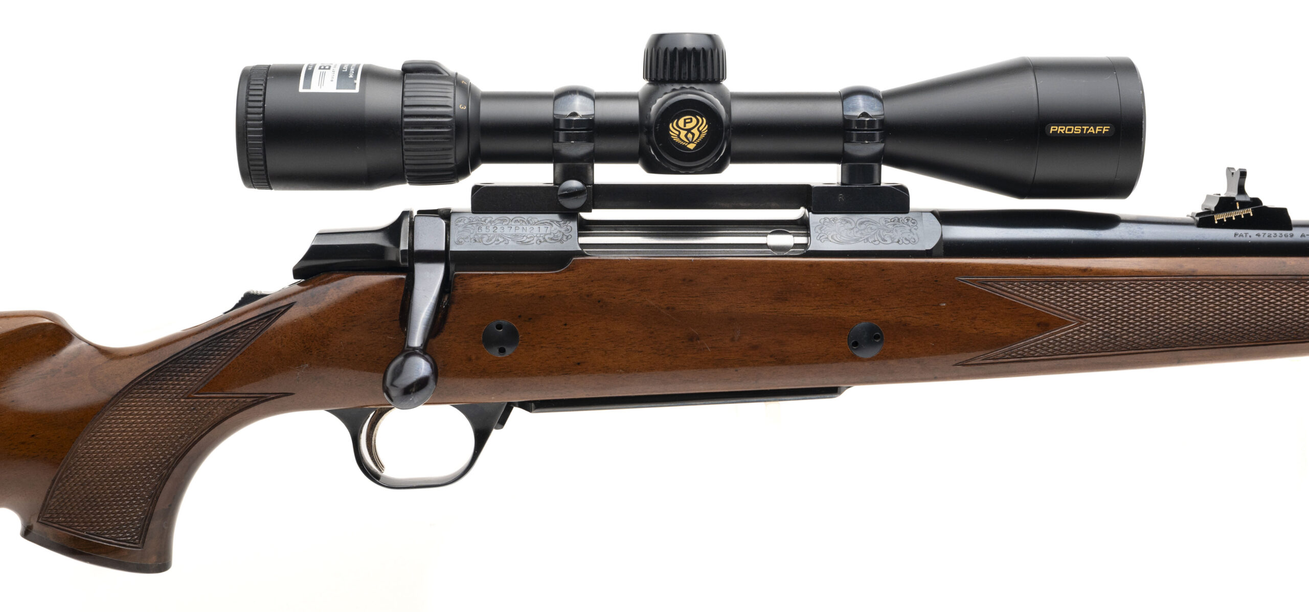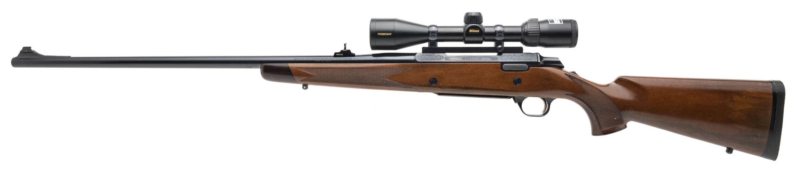 SN: 65237PN217 made in Japan in 1989. Deluxe bolt action hunting rifle chambered in 375 H&H Mag with a 26" round barrel, ramped front sight and adjustable rear sight, Nikon Prostaff 3-9 scope with blued metal finish, engraved receiver and bottom metal in a high gloss checkered walnut stock with rosewood forend tip, grip cap and original recoil pad. Some handling marks on the stock and metal finish has some light scuffs but overall the finish is in good condition and the bore is excellent.