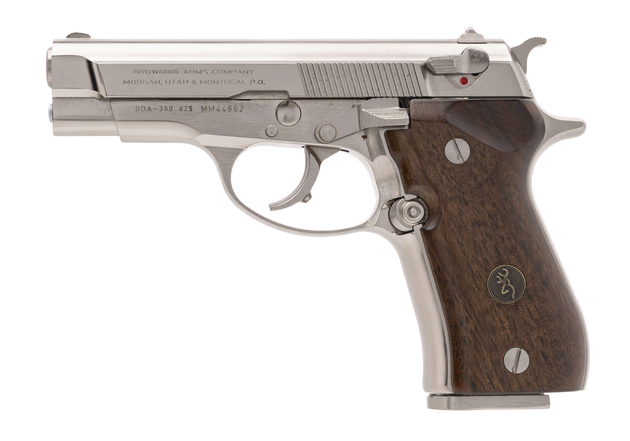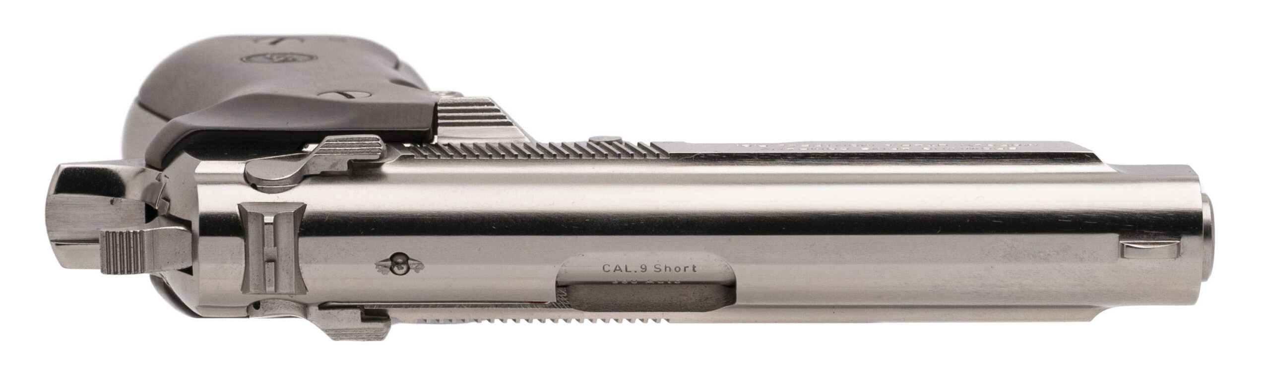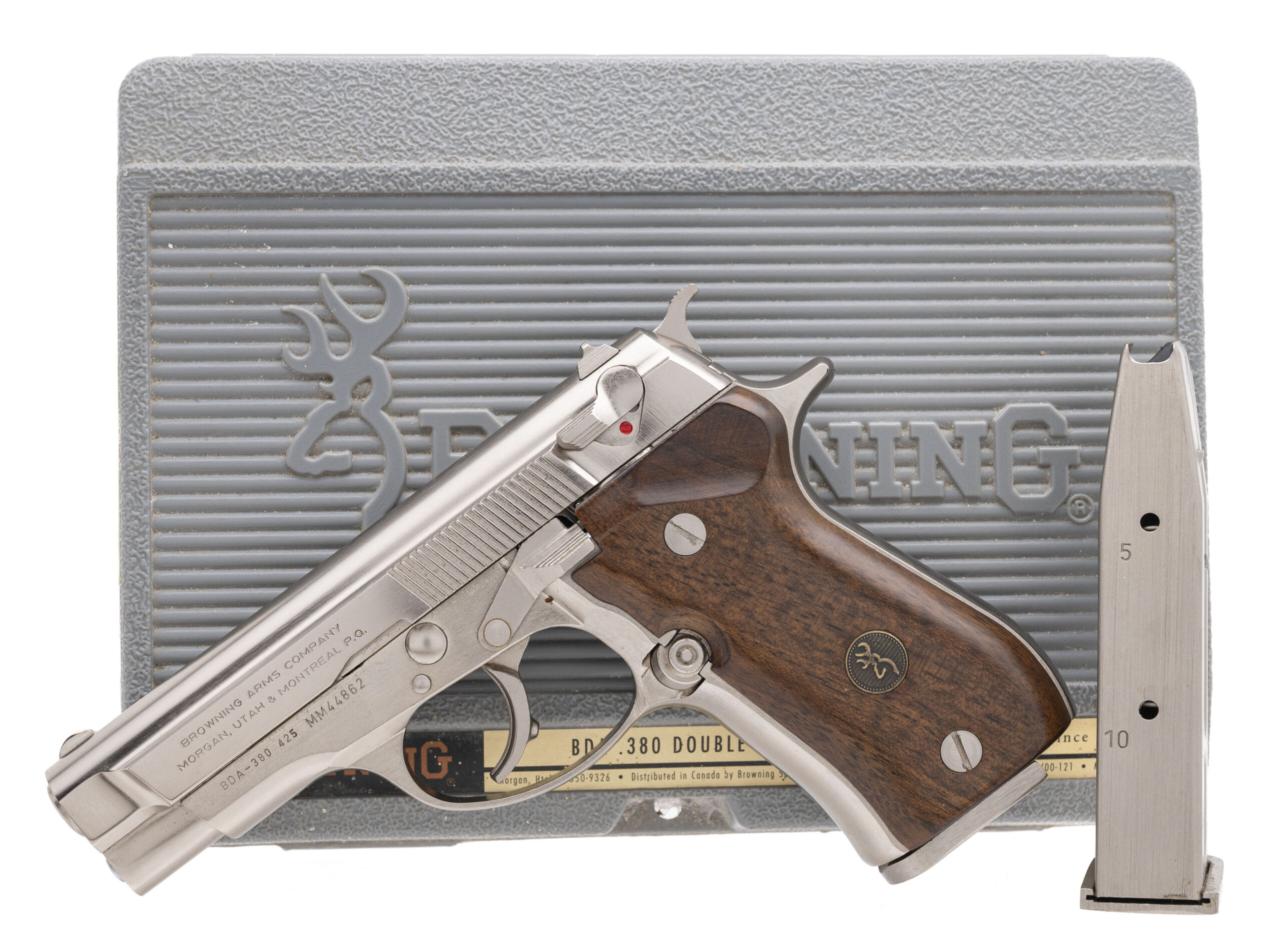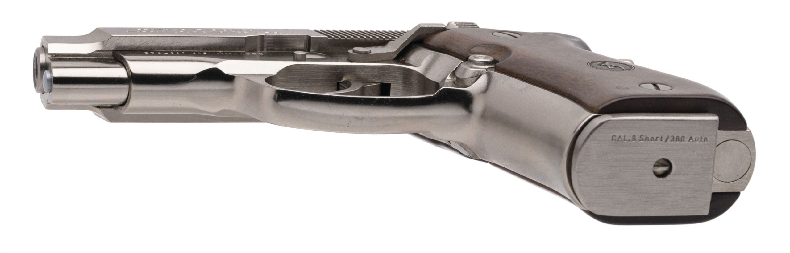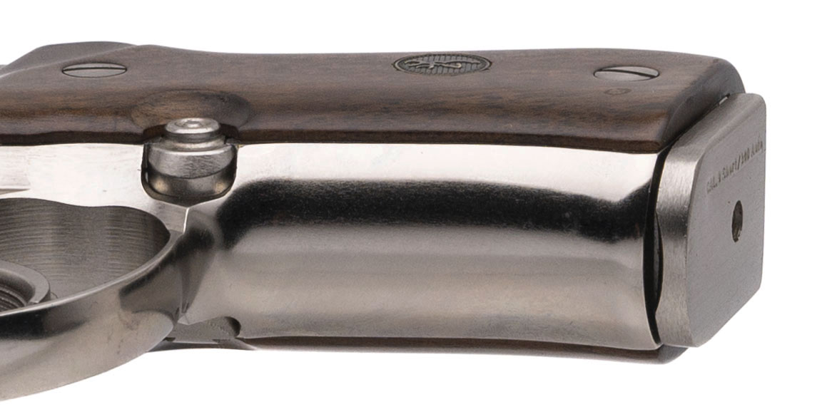 SN: 425MM44862. Made in 2000, .380 ACP with a 3.75" barrel. Bore is excellent. Italian made double-action alloy frame pistol with an ambidextrous manual thumb-safety, nickel plating, and medallion wood grips. Nickel shows light handling marks. Overall condition is near excellent. Includes an additional magazine, and original case.