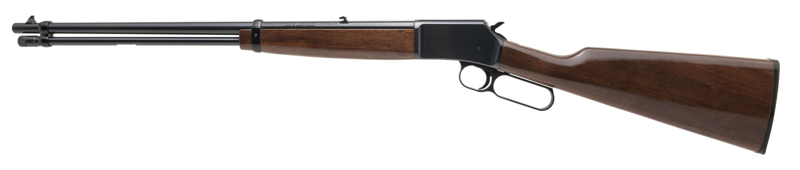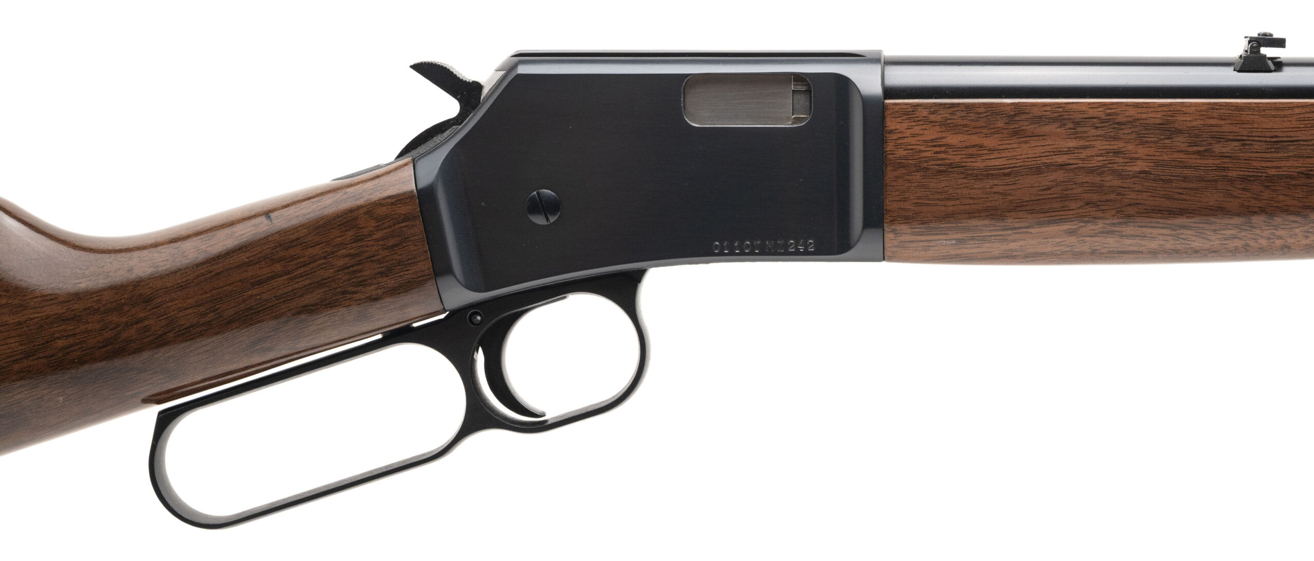 SN: 01107MZ242 modern production 22lr lever action rifle with a 20" round barrel, iron sights, blued metal finish and high gloss walnut furniture with the original butt plate. Overall in near excellent condition with an excellent bore.