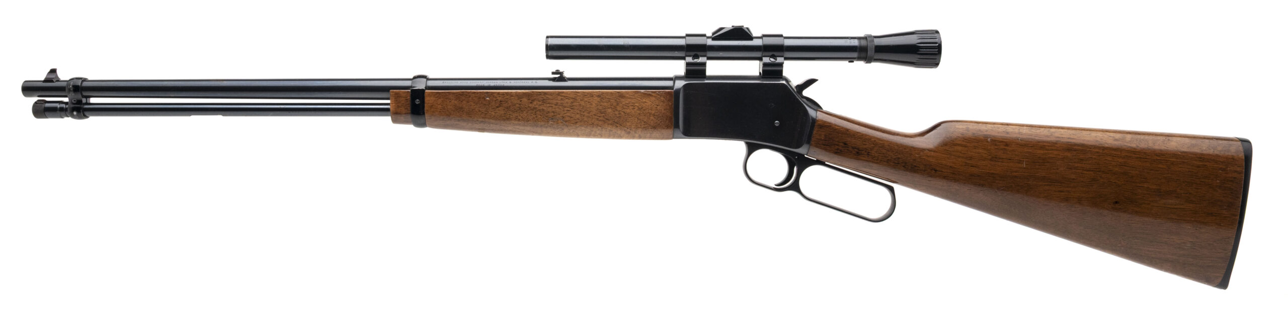 SN: 47B39934 made in Japan circa 1970's. Lever action 22lr rifle with a 20" round barrel, dovetailed front and rear sights, Weaver 4x scope and walnut furniture with the original butt plate. Some wear and light handling marks visible throughout but overall in good condition with an excellent bore.