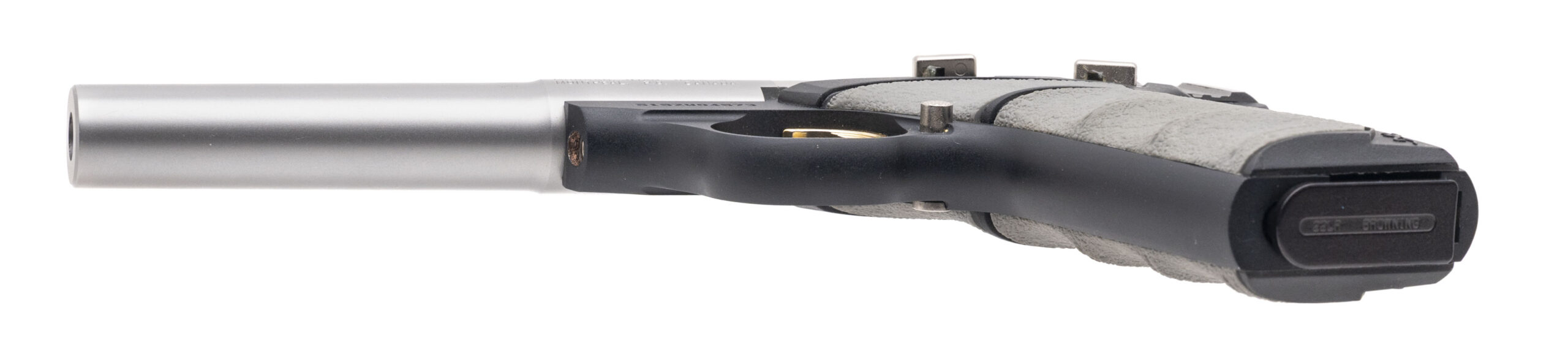 SN: 515ZW04573. Modern production, .22LR with a 5.5" matte stainless steel barrel. Bore is excellent. Alloy frame Semi-auto rimfire pistol with a fiber-optic front sight, adjustable rear sight, manual thumb-safety, matte black finish, and textured rubber grips. Finish shows light marks. Overall condition is near excellent. Includes 2 additional magazines, and original case.