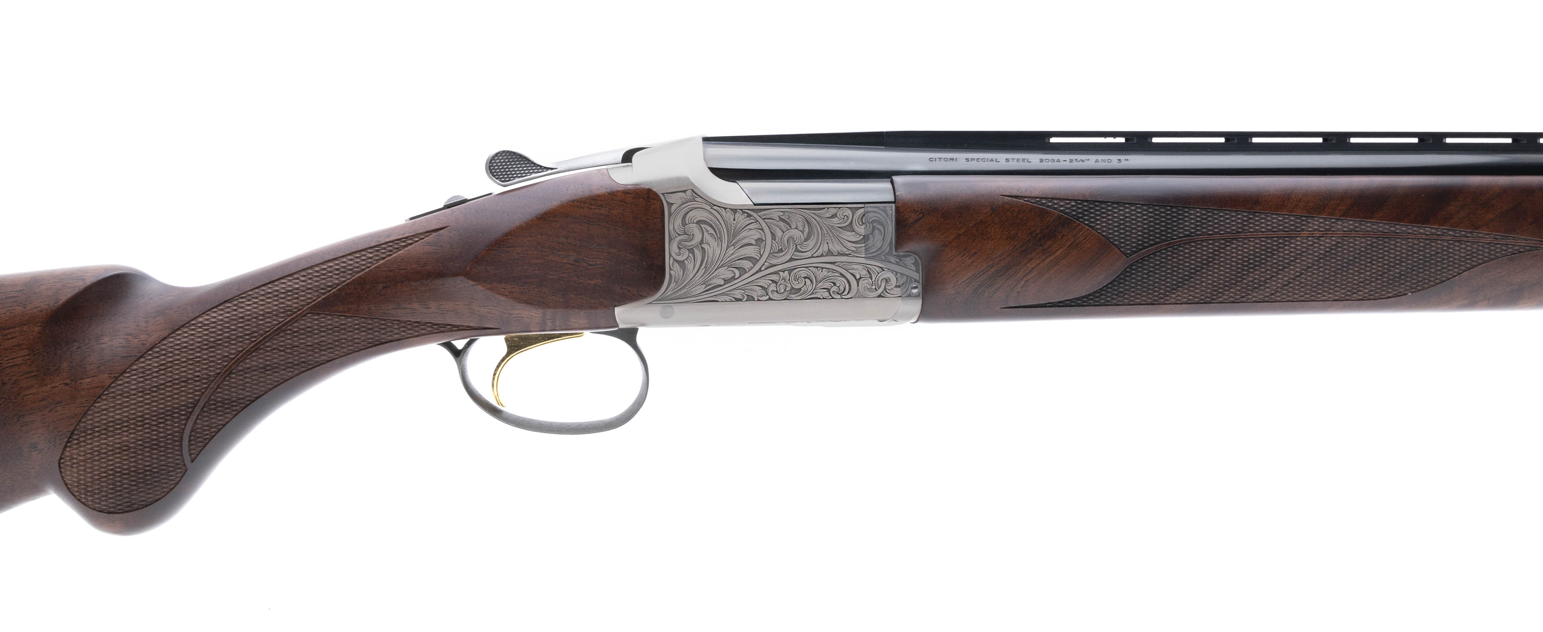 Sporting over/under shotgun with 28" barrels with extended chokes, and engraved lightweight alloy receiver with floral scene. Stock is dark walnut with oil finish. New. UPC:023614736769