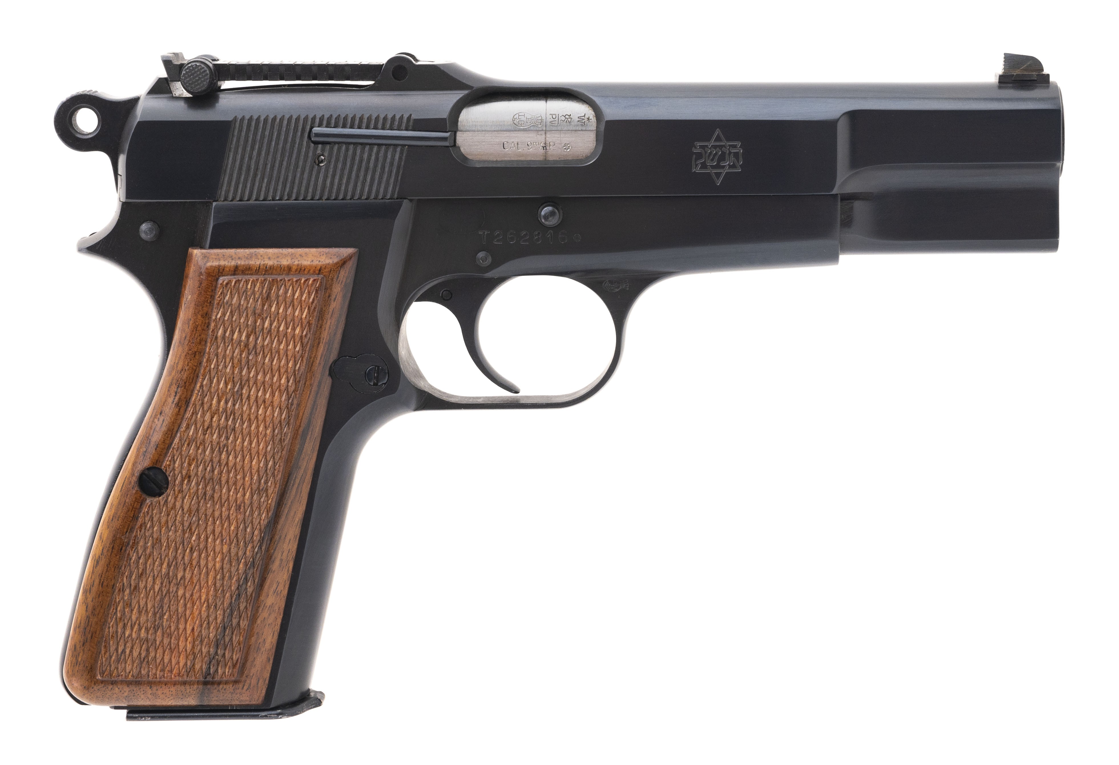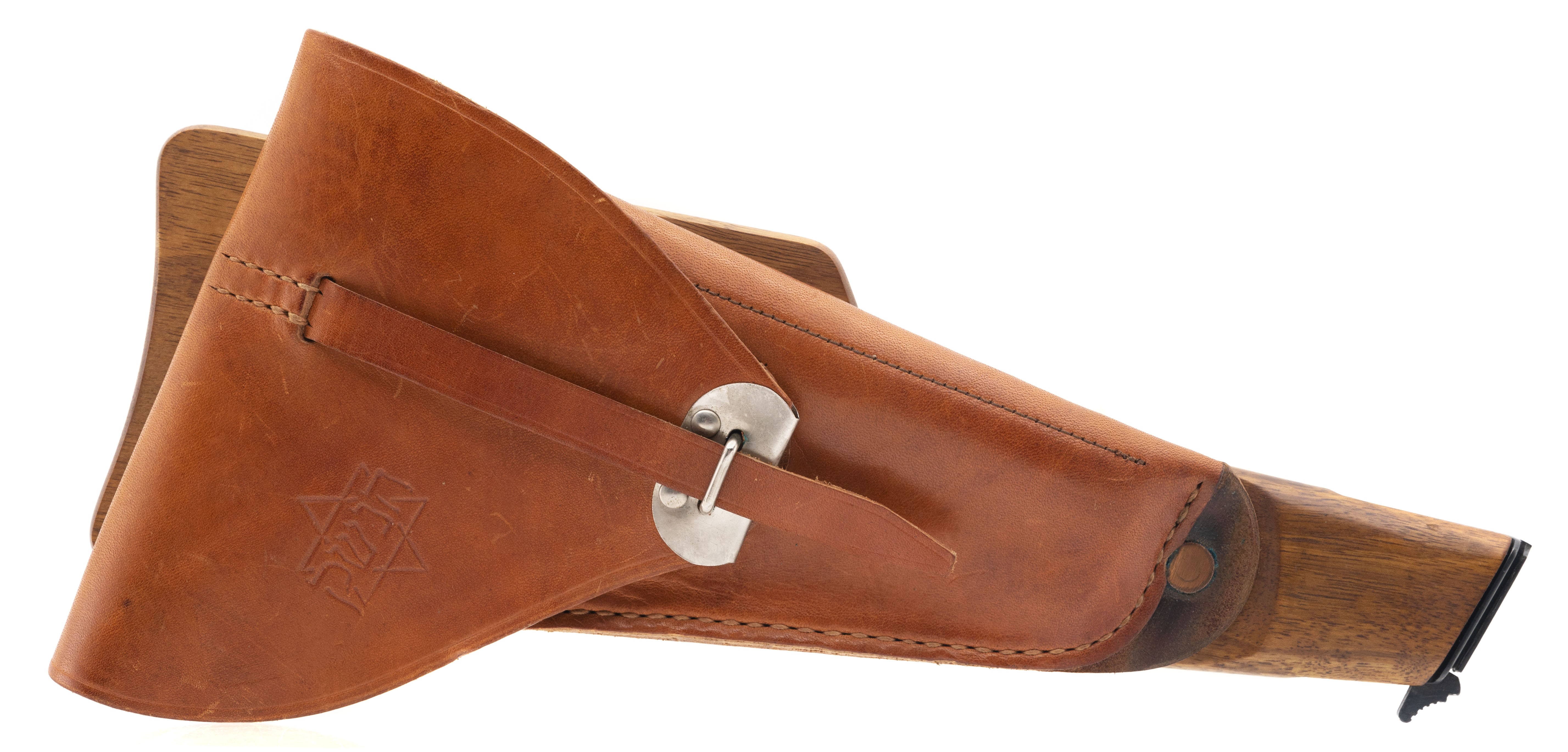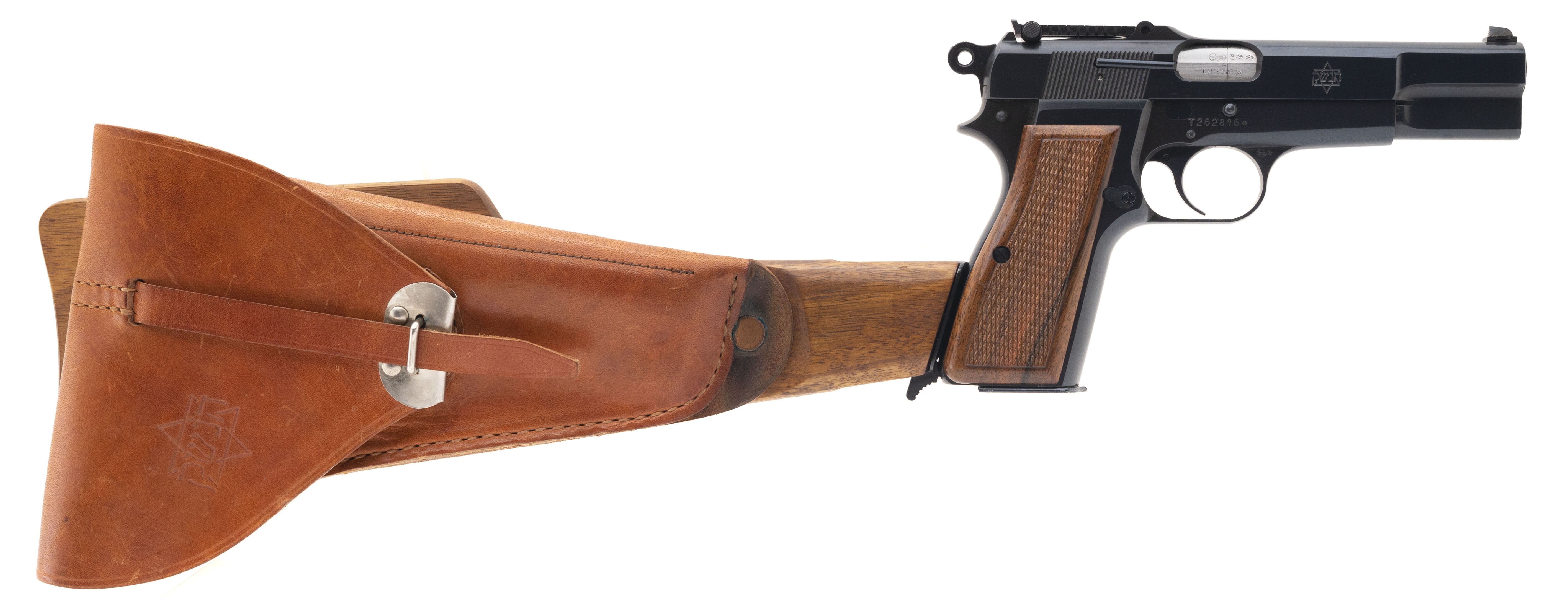 SN: T262816. Rare Belgian military pistol made for Israel after the Six Day War as an evaluation piece. Only a handful were made. The slide is marked with a Star of David and has Hebrew writing. Has a tangent sight and is slotted for a stock, which is included. Comes with a 13rd mag and an extra 21rd mag, all in a special case. A unique set, in excellent condition.