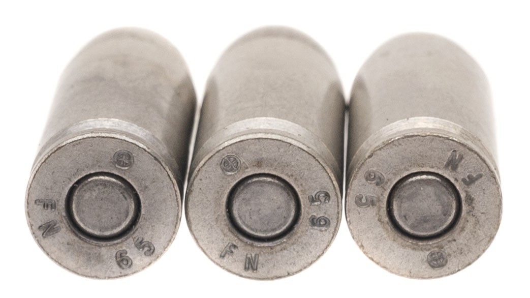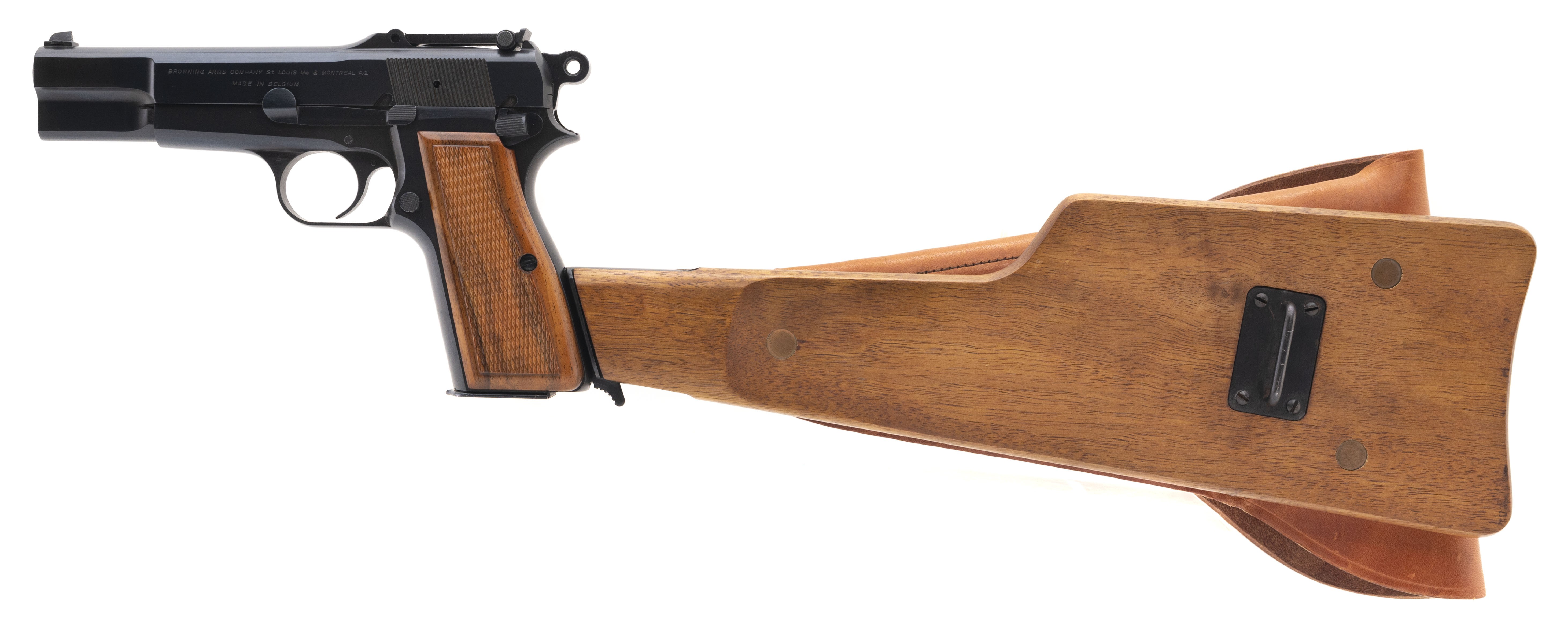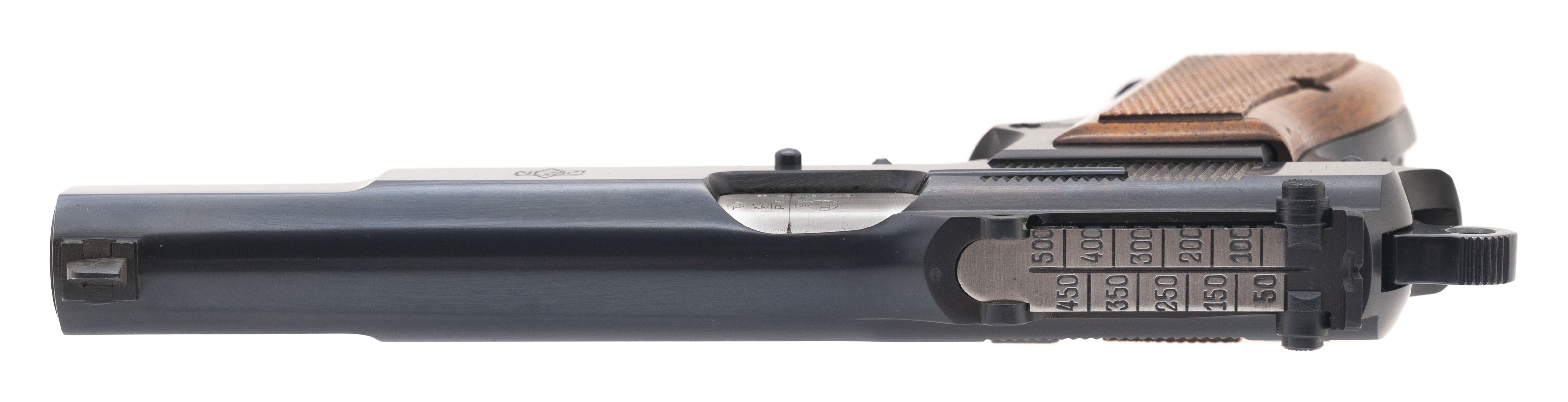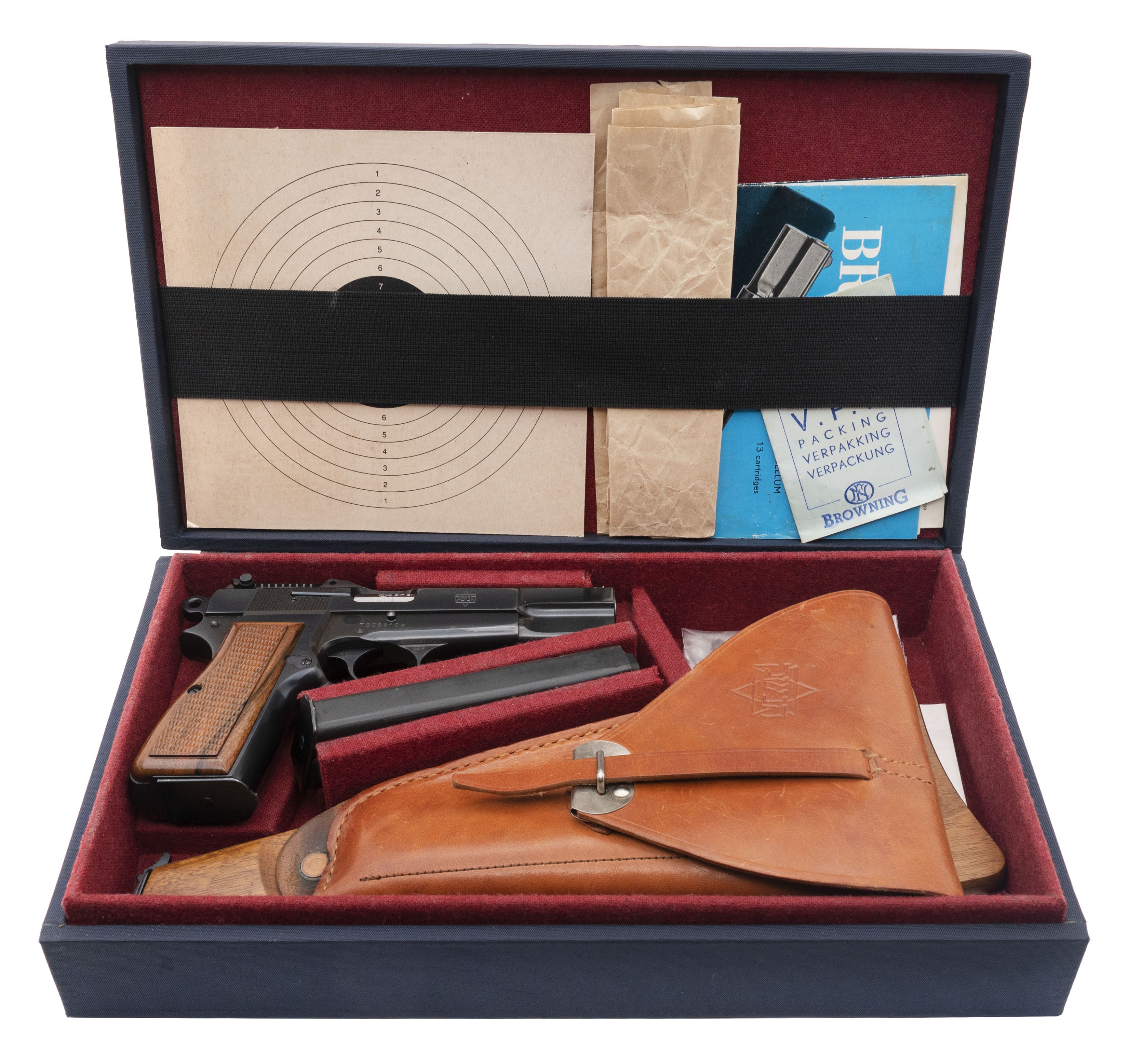 SN: T262816. Rare Belgian military pistol made for Israel after the Six Day War as an evaluation piece. Only a handful were made. The slide is marked with a Star of David and has Hebrew writing. Has a tangent sight and is slotted for a stock, which is included. Comes with a 13rd mag and an extra 21rd mag, all in a special case. A unique set, in excellent condition.