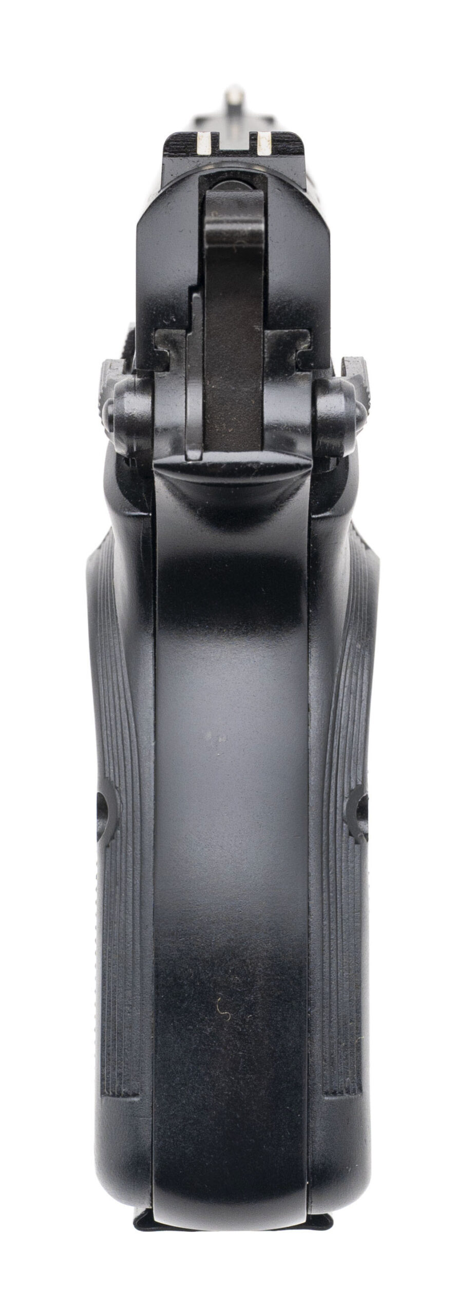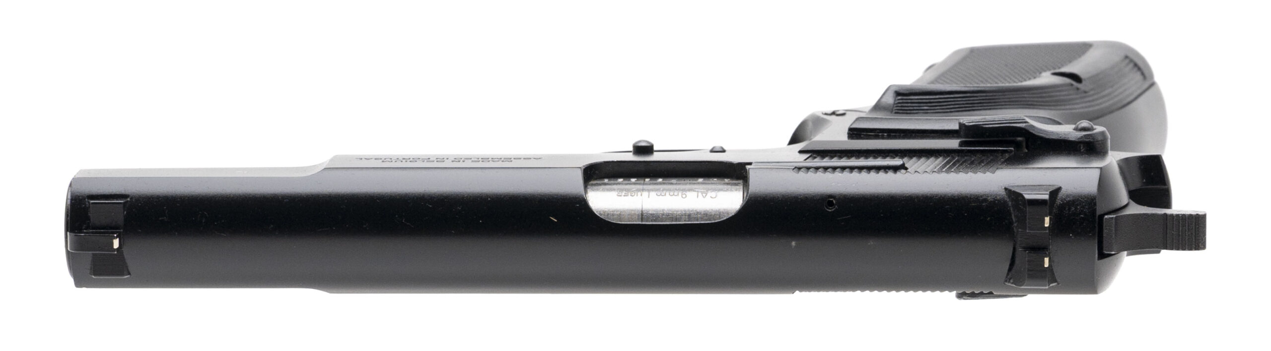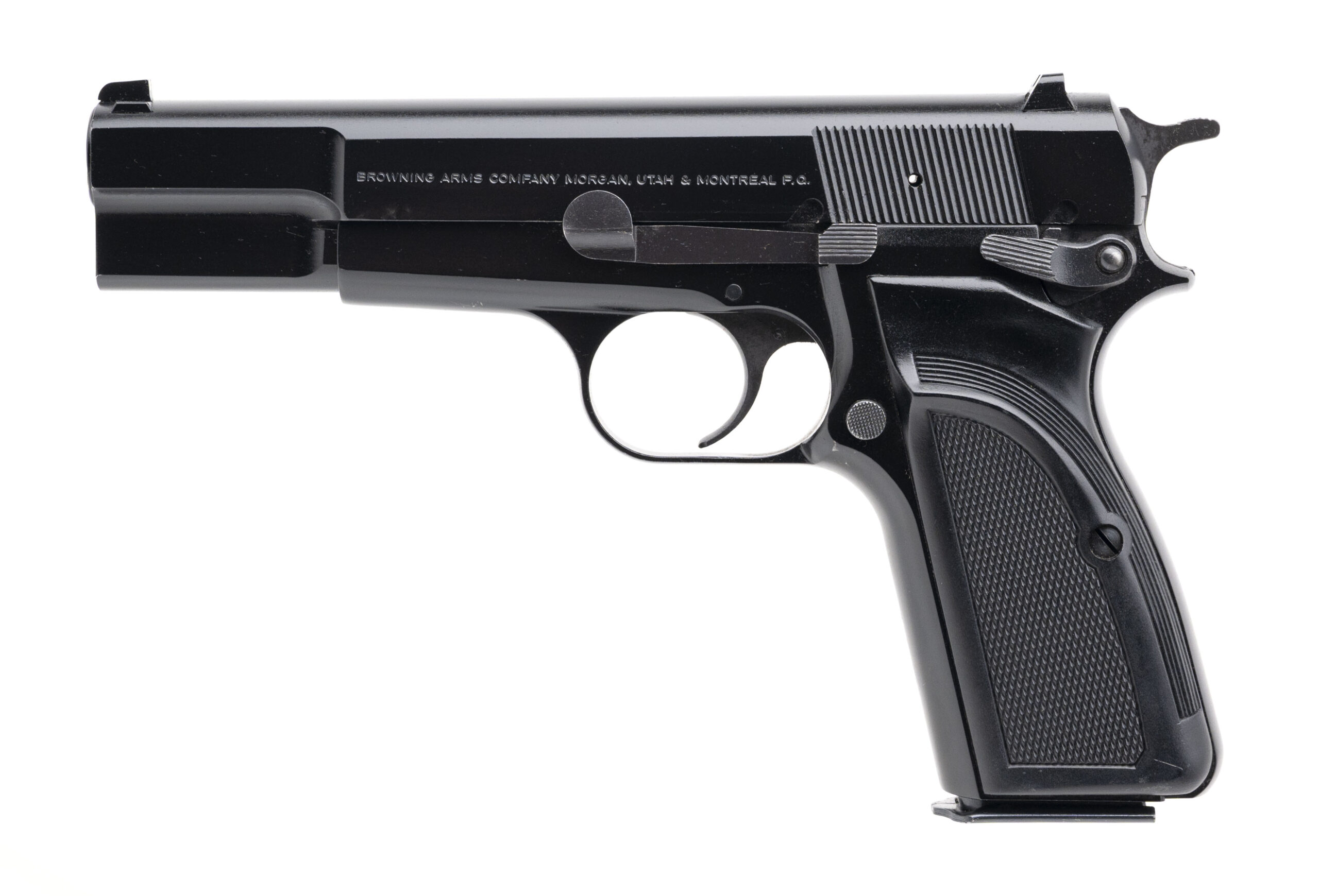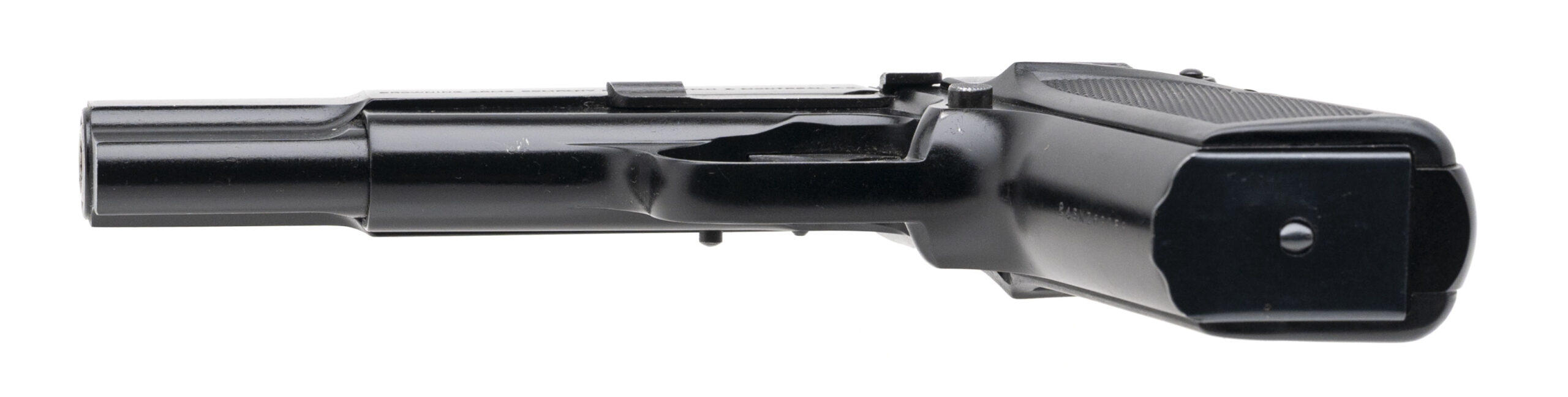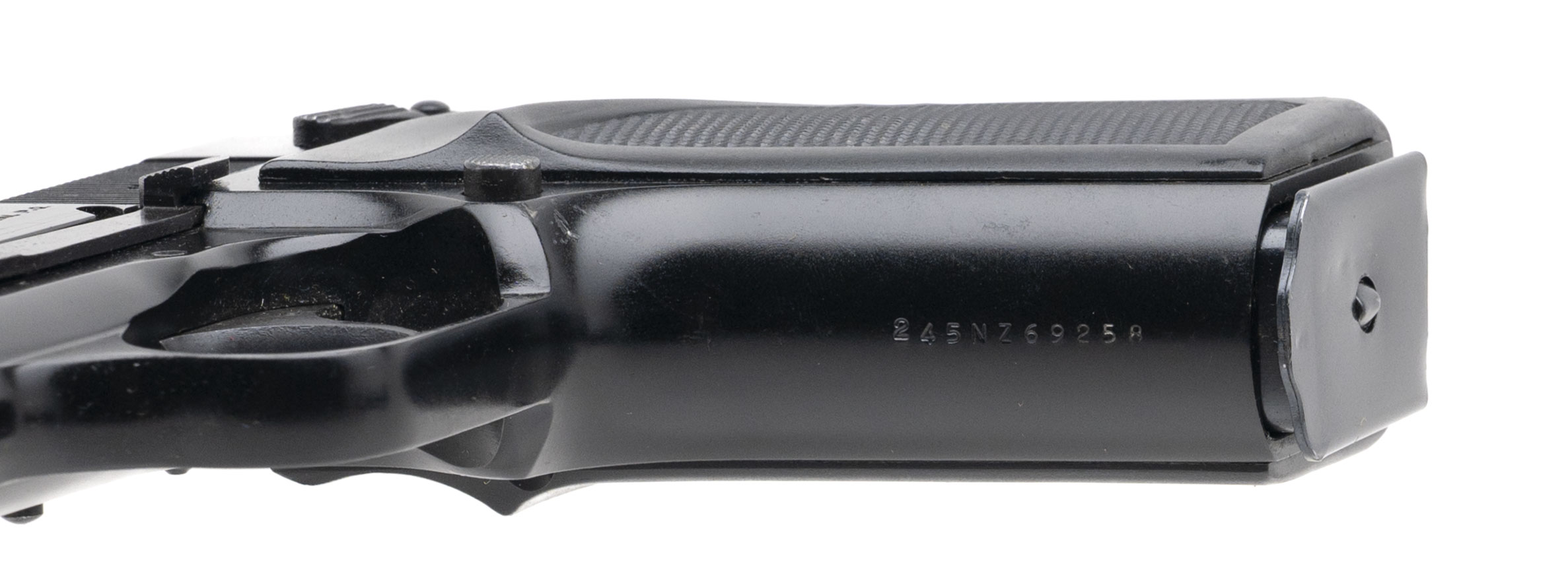 SN: 245NZ69258. Made in 1991, 9mm with a 4.7" barrel. Bore is very good. Late production Belgian made single-action pistol with an ambidextrous manual thumb-safety, matte black finish, and black plastic grips. Finish shows minor loss & marks. Overall condition is very good.
