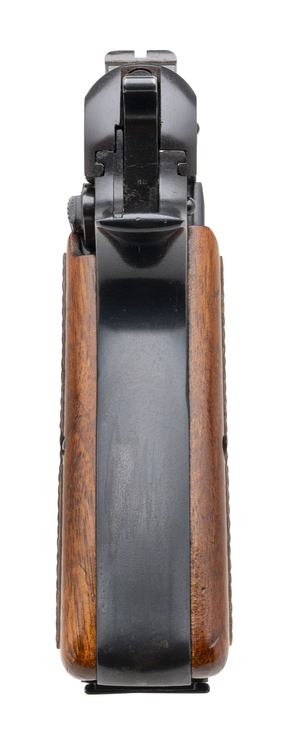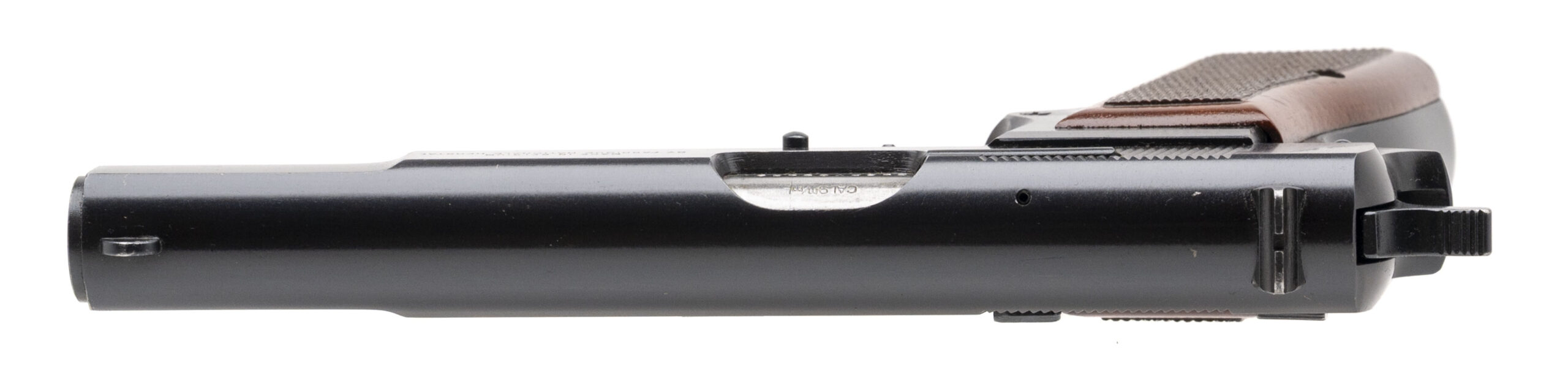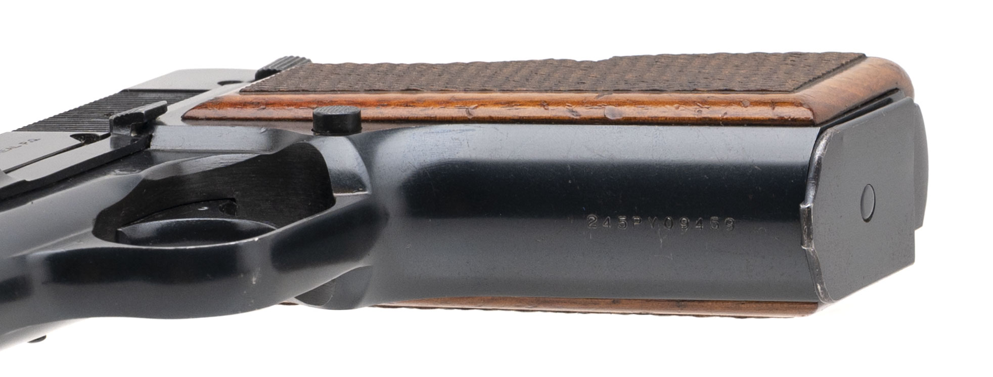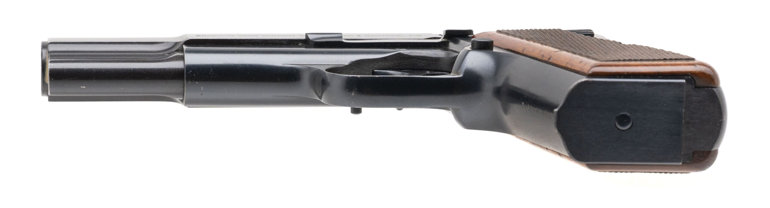 SN: 245PY09459. Made in 1982, 9mm with a 4.7" barrel. Bore is very good. Belgian made single-action pistol with a manual thumb-safety, blued finish, and checkered wood grips. Finish & grips show minor handling marks throughout. Overall condition is very good.