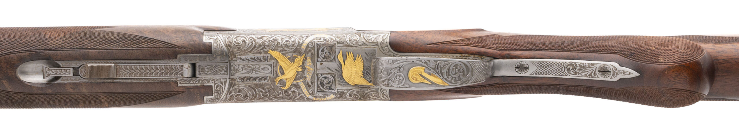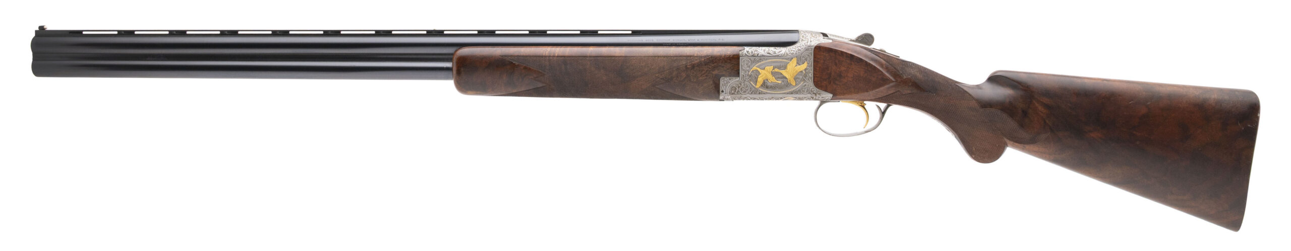 SN: 8H4PZ00052, Belgian made 12 gauge over under field shotgun with 28" vent rib barrels, 2 3/4" chambers and fixed chokes Mod/Full. One of a limited run of 500 guns featuring a coin finished fully engraved receiver with gold inlay game scenes hand engraved and signed by renowned Belgian Master engraver Jose Baerten who passed away in 2013. Box lock with auto ejectors, gold plated selective single trigger and a manual safety. Highly figured hand checkered walnut furniture with deluxe checkering, satin finish and a 14.25" LOP to the checkered wood butt. Some handling marks on the furniture from field use and light patina on some areas of the receiver, bluing is very good and bores are excellent. Overall a beautiful very scarce deluxe hand made shotgun. Consignment