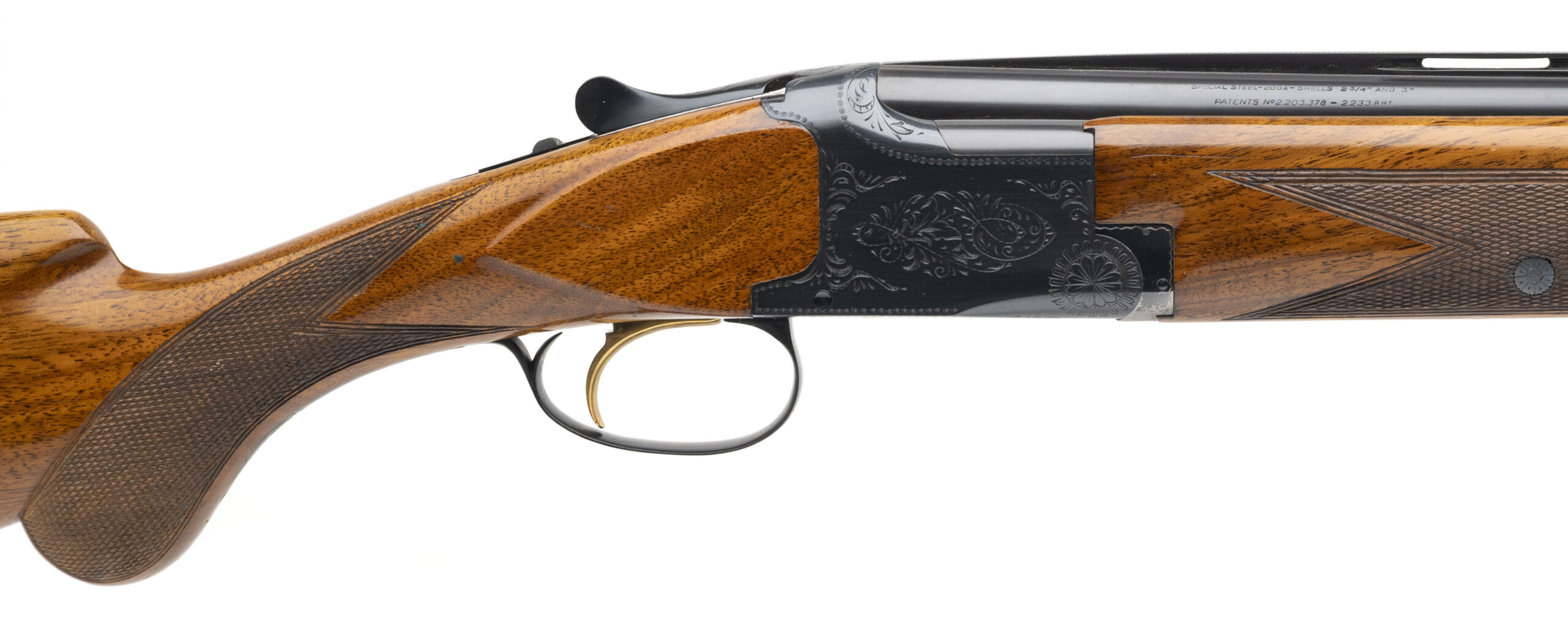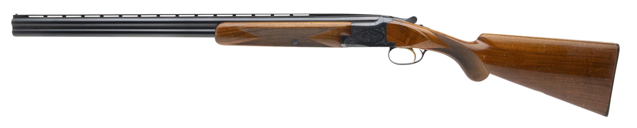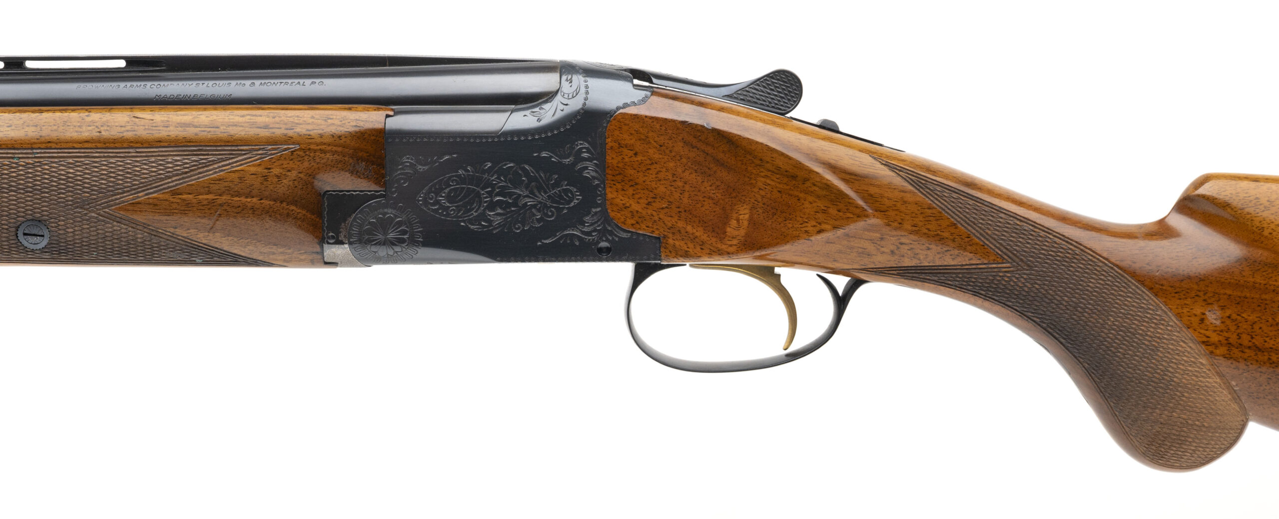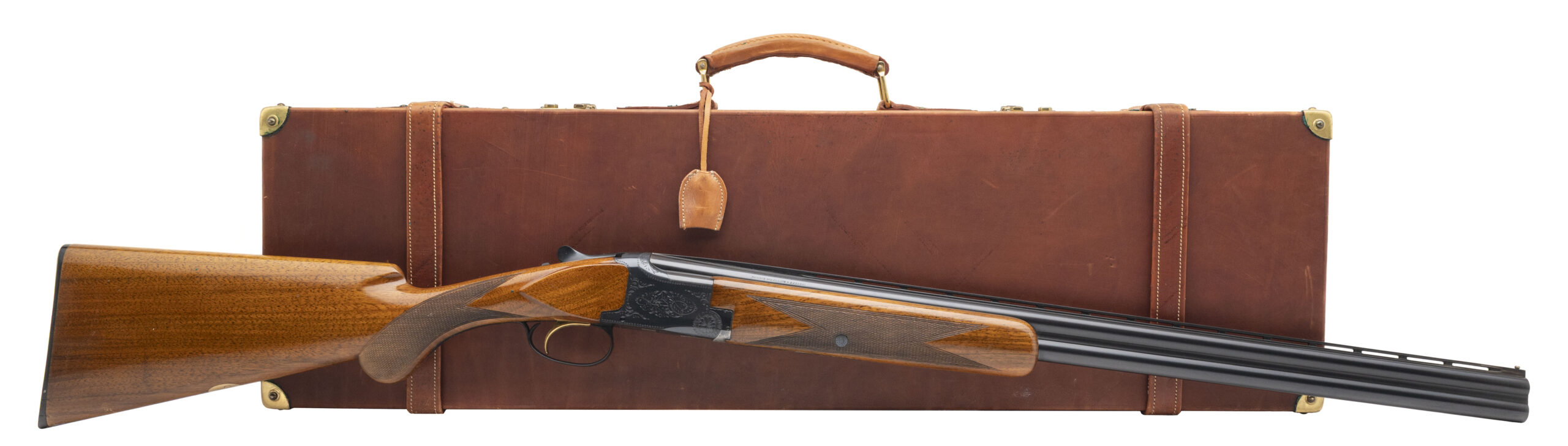 SN: 33878V4 made in Belgium in 1964. 20 gauge over under shotgun with 26.5" vent rib barrels, 3" chambers and Briley thin wall screw in chokes. Box lock with ejectors, gold plated selective single trigger and a manual safety. Checkered walnut furniture with a gold stock oval and a 14.5" LOP to the original butt plate. Furniture has some handling marks visible throughout but no cracks, metal finish on the bottom of the forearm iron and bottom of the barrel lugs has a heavier patina and bluing loss but the rest of the finish visible from the sides and top is very good and the bores are excellent. Comes with leather luggage case and extra chokes.