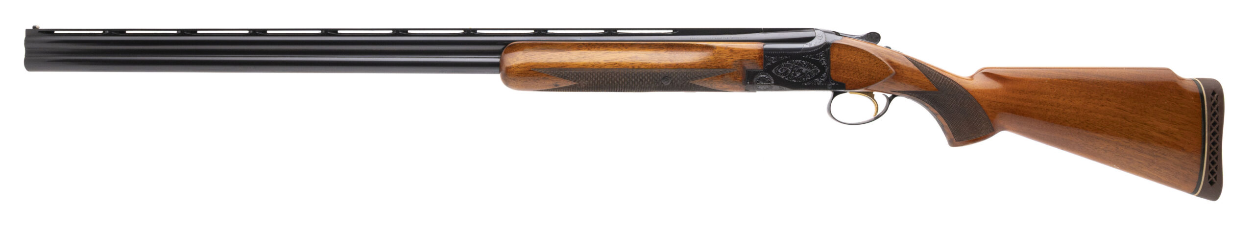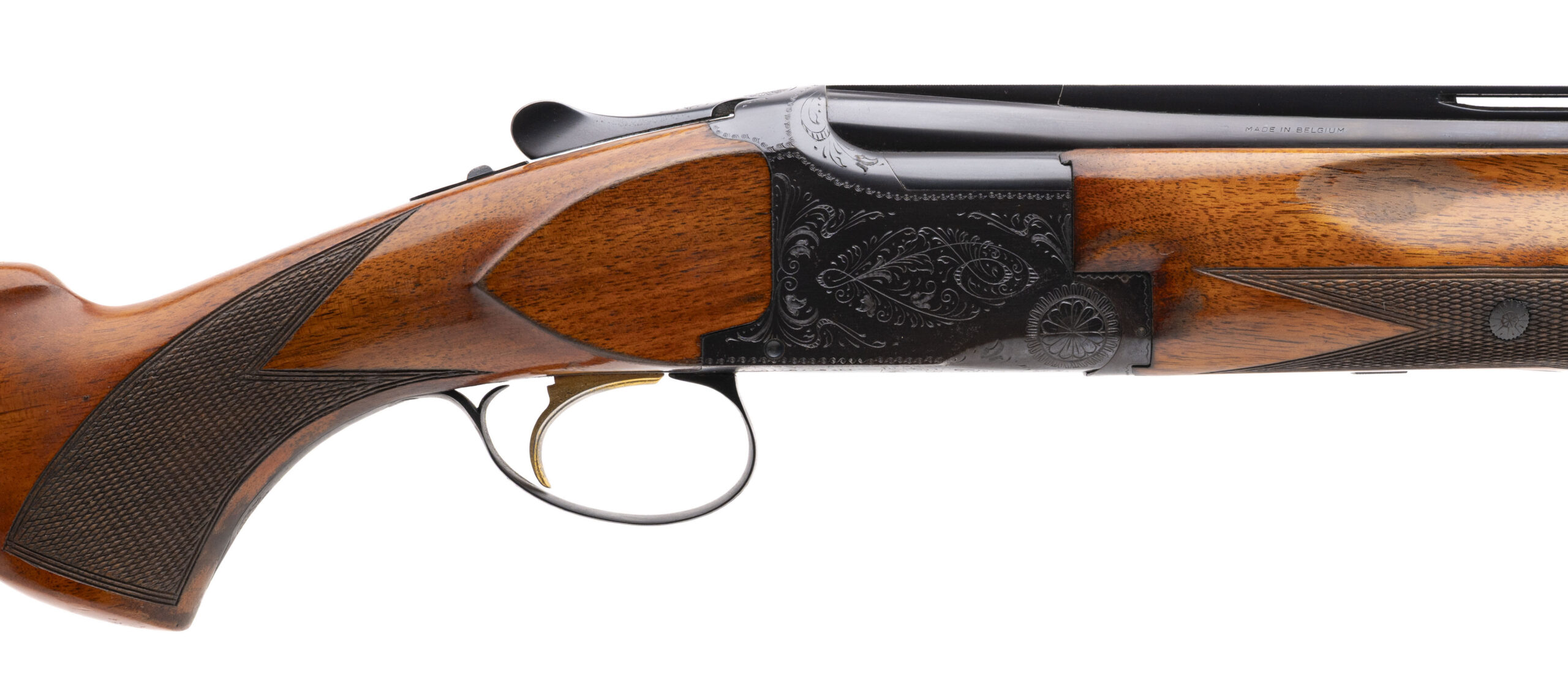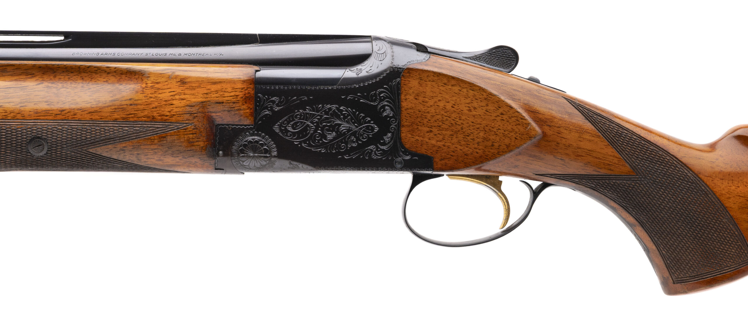 SN: 86910 made in Belgium circa 1950's. 12 gauge over under sporting shotgun with 32" vent rib barrels, wide Broadway trap rib, 2 3/4" chambers and fixed chokes IM/Full. Box lock with engraved receiver, gold plated selective single trigger, auto ejectors and a manual safety. Checkered walnut furniture, Monte-Carlo stock with a 14 3/8" LOP to the original Browning Trap pad. Some light handling marks, normal wear from use, no cracks overall in good solid condition with excellent bores.