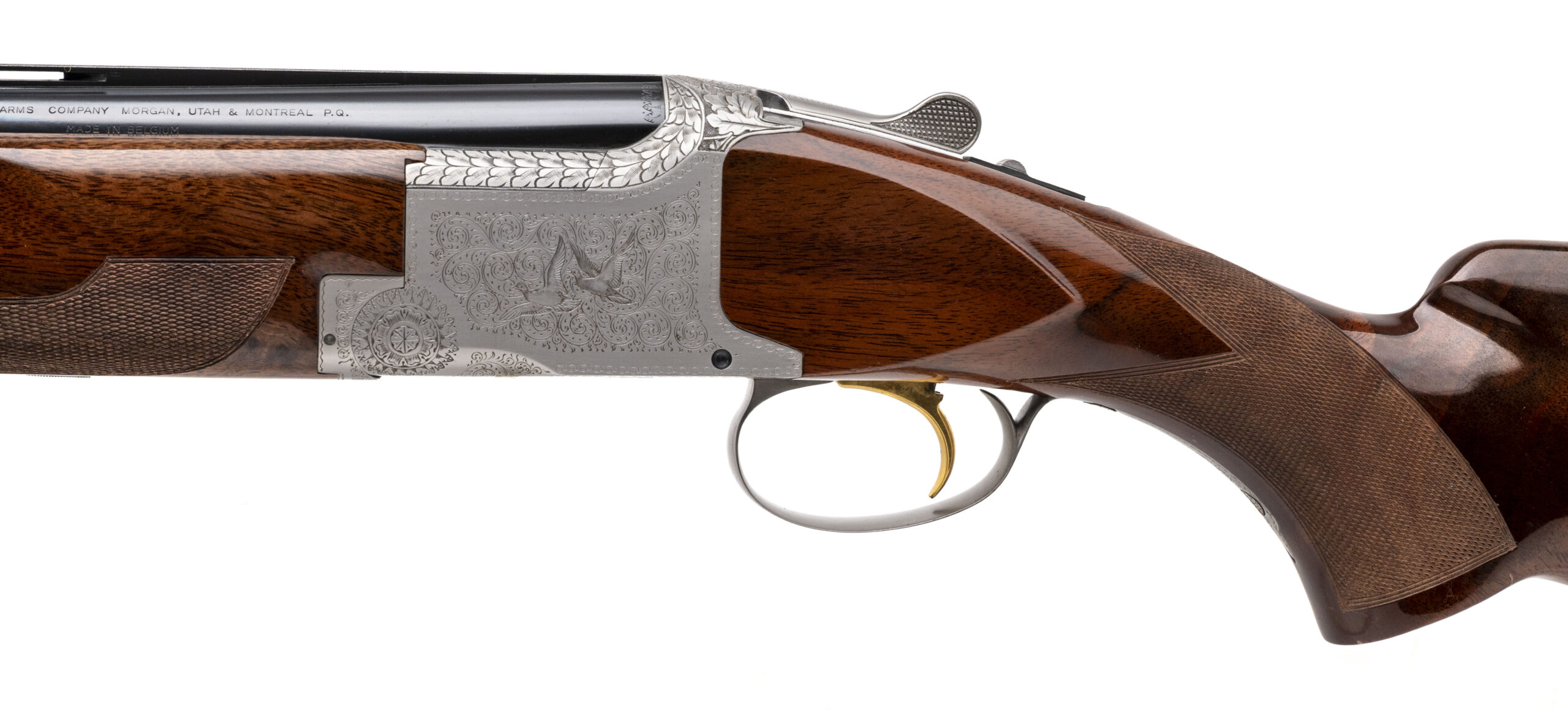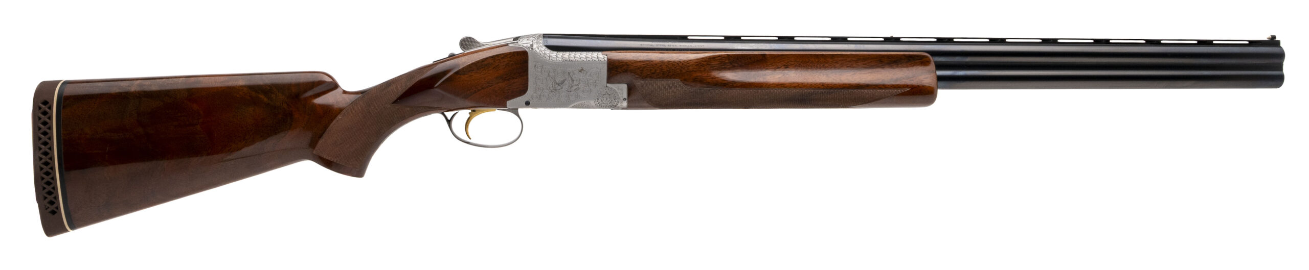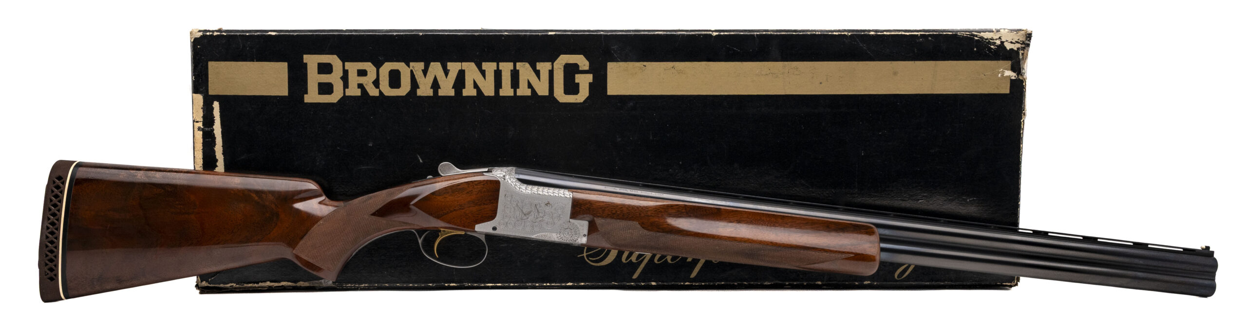 SN: 18651S73 made in Belgium in 1973. 12 gauge over under skeet shotgun with 26" vent rib barrels, 2 3/4" chambers and fixed chokes Skeet & Skeet. Engraved coin finish receiver with gold plated selective single trigger and high gloss checkered walnut furniture with a 14 1/2" LOP to the original Browning pad. Only a couple very light handling marks and 1 small area of patina on the right side of the action but overall in near excellent condition for the age with mirror bores. Comes with original box.