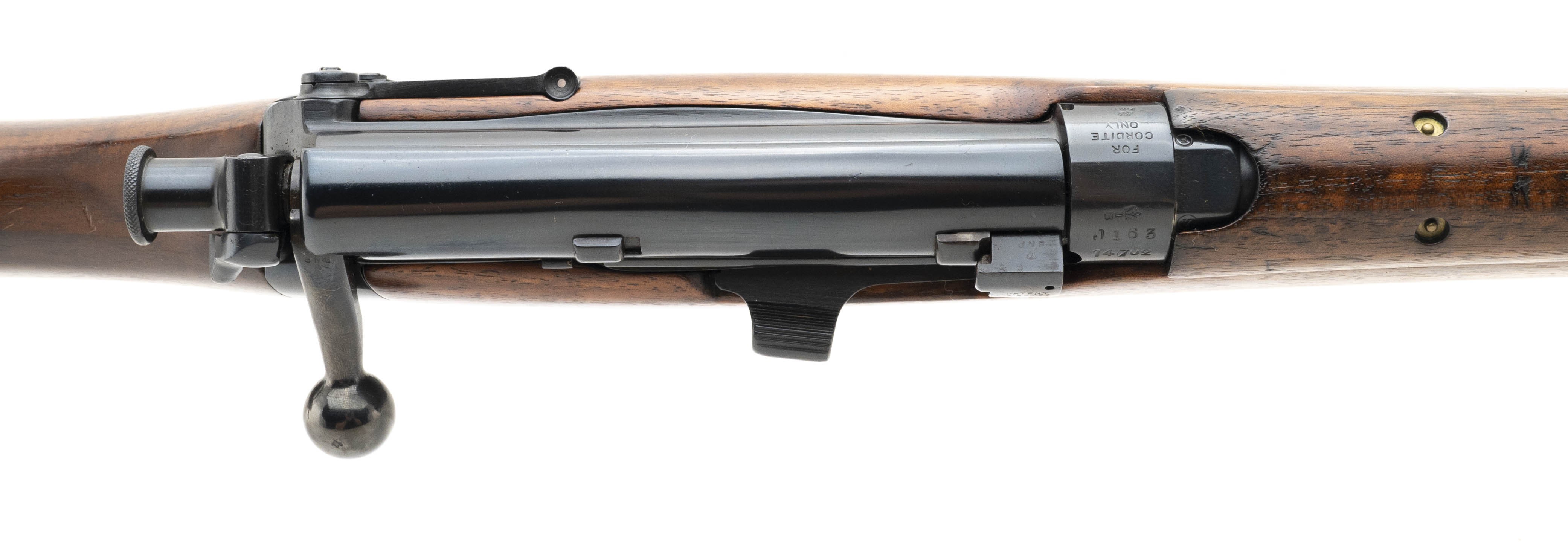 WWI British Bolt-action rifle, made in 1901 with 30.5" barrel. The bore is very good plus with strong rifling. The metal is virtually 100% and the stock is in excellent condition, and has a silver stock plate on the right side that says" Presented by BSA, Bisley 1901." The stock has an intact cleaning kit and oiler. Overall an outstanding example.