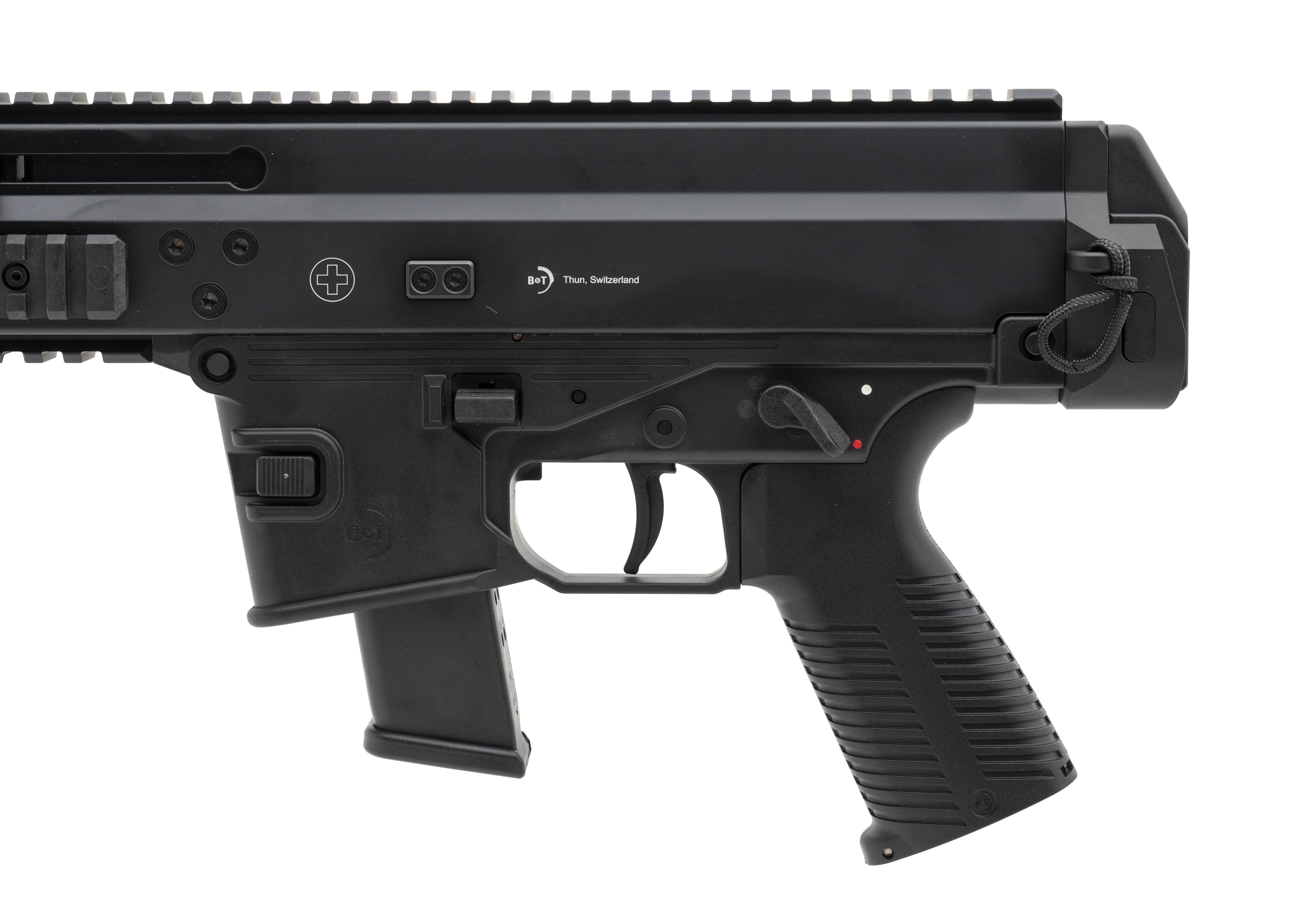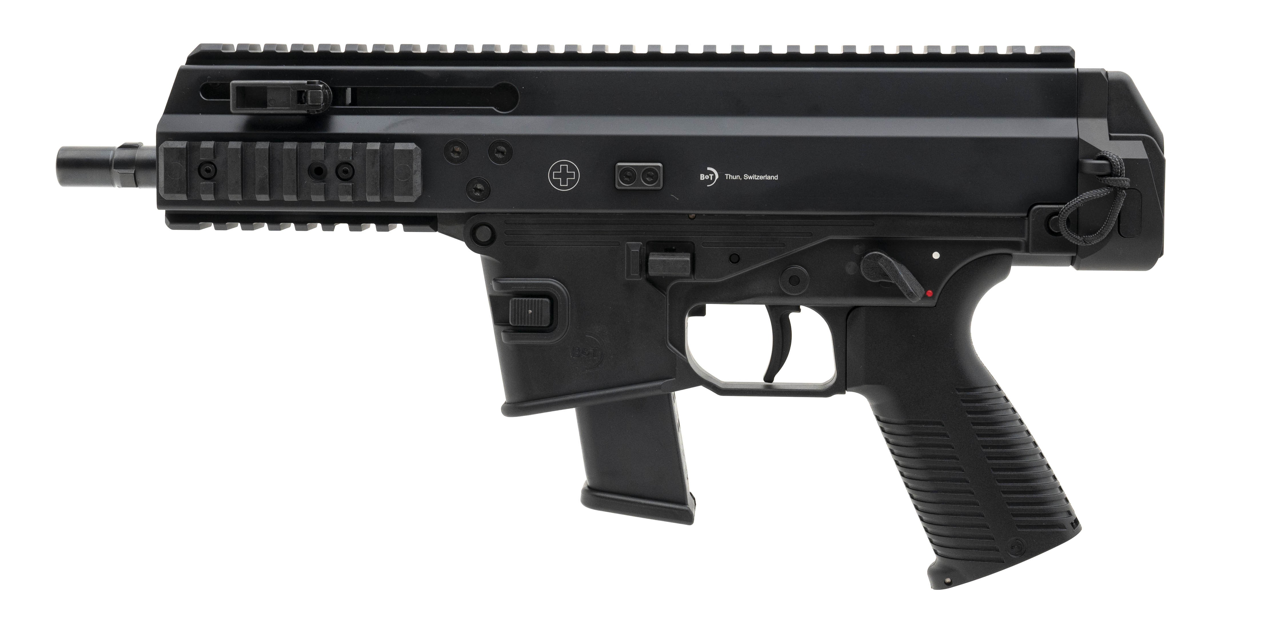 Semi-automatic Swiss 6.5" sub gun with a suppressor ready trilug muzzle device, quad rail, irons, ambidextrous safety, non-reciprocating charging handle and pistol grip. Takes Glock Mags. NEW. UPC:840225705621